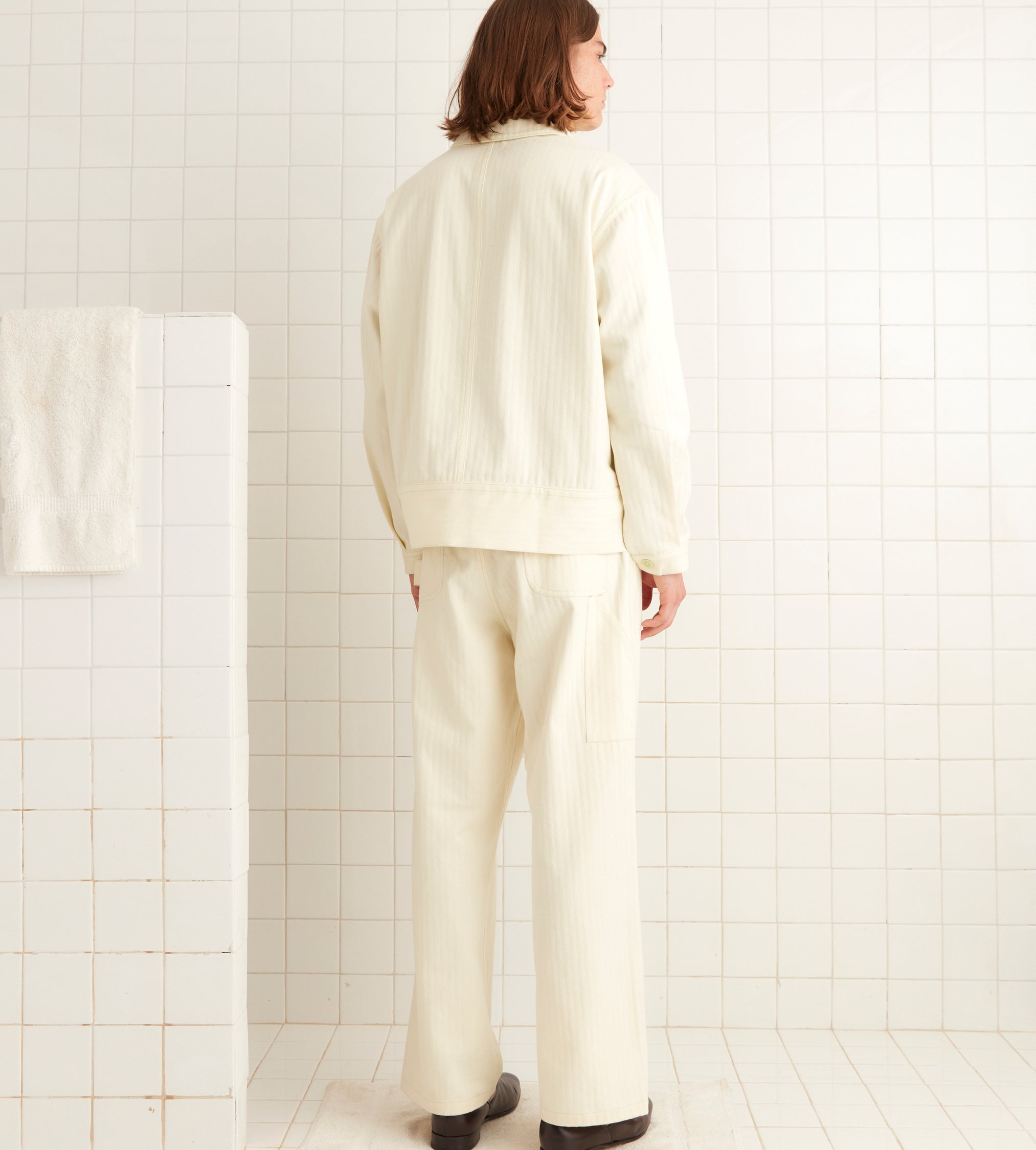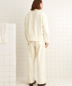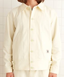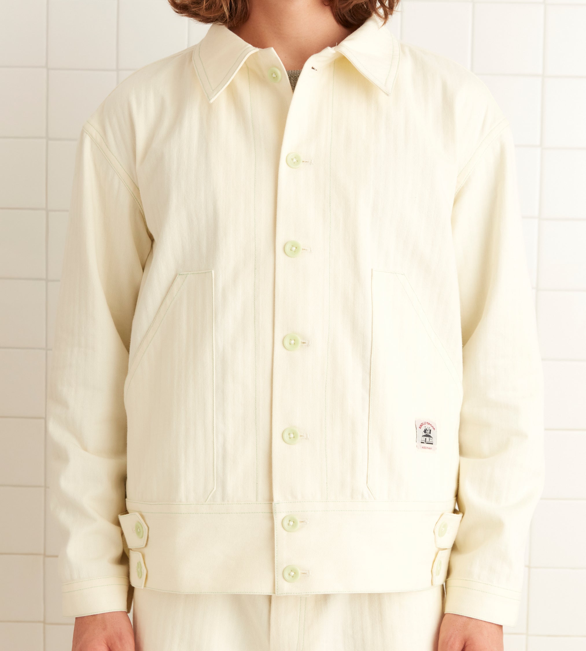 This jacket is inspired by a workwear jacket from the 1960s. We reproduced the silhouette for this style. The jacket features “Knolly Brook, a Bode Product” tags inspired by classic workwear labels.