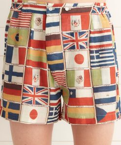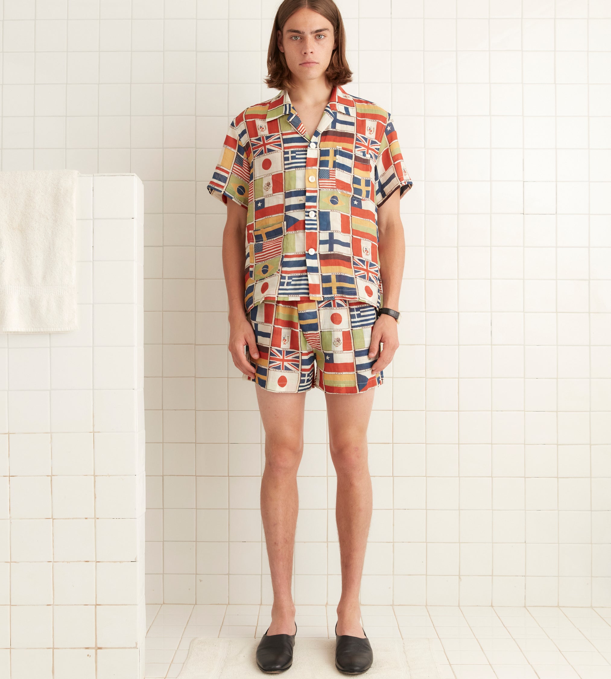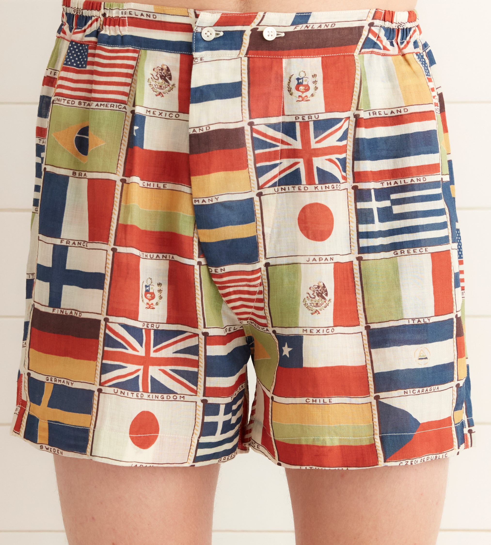 These shorts are inspired by a scrap of deadstock printed yardage. We reproduced the flag print on a light, airy linen for this style.