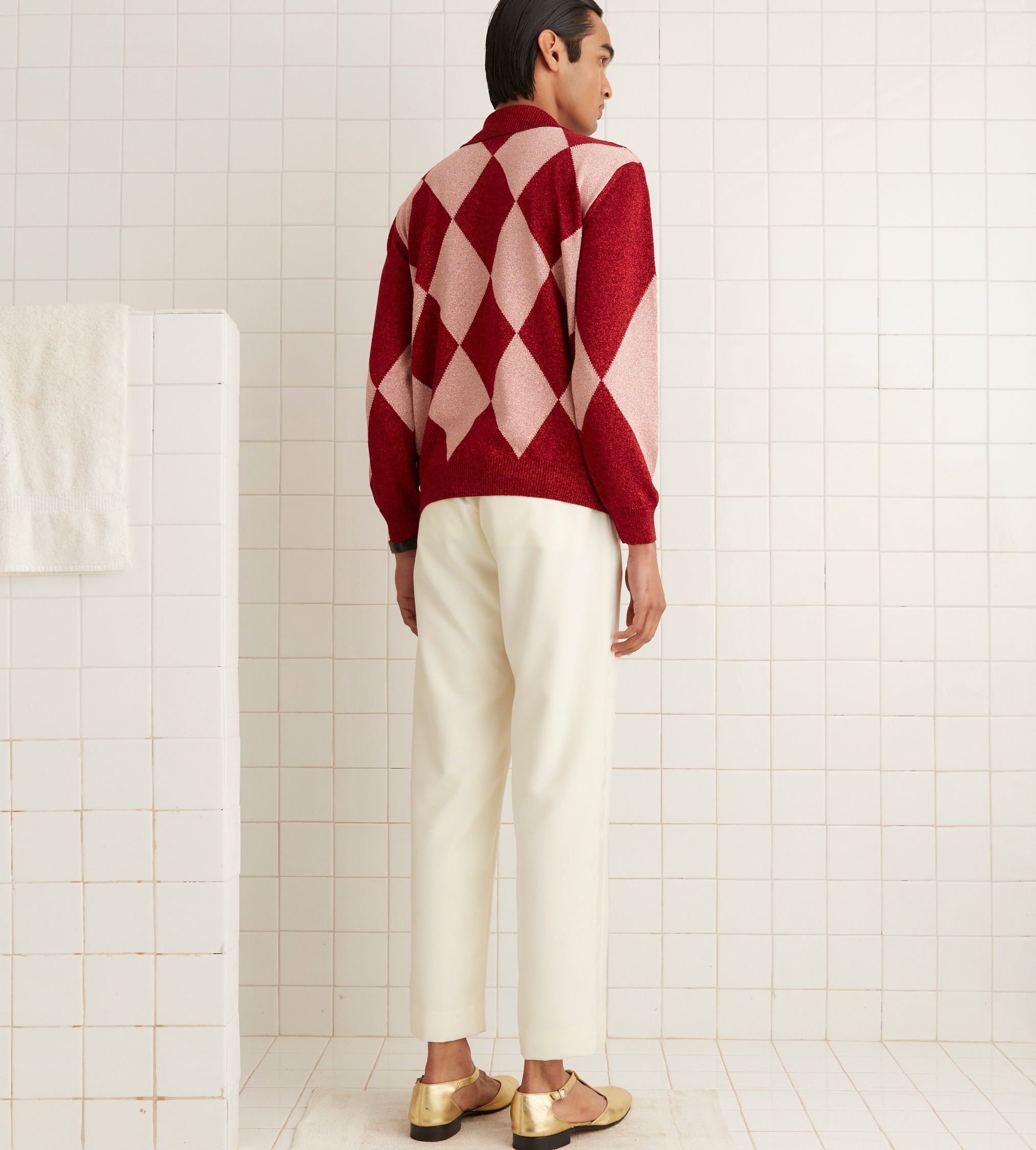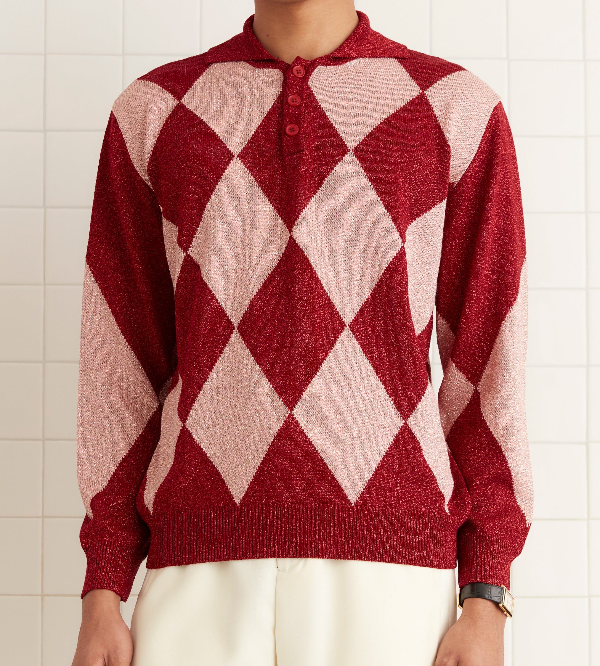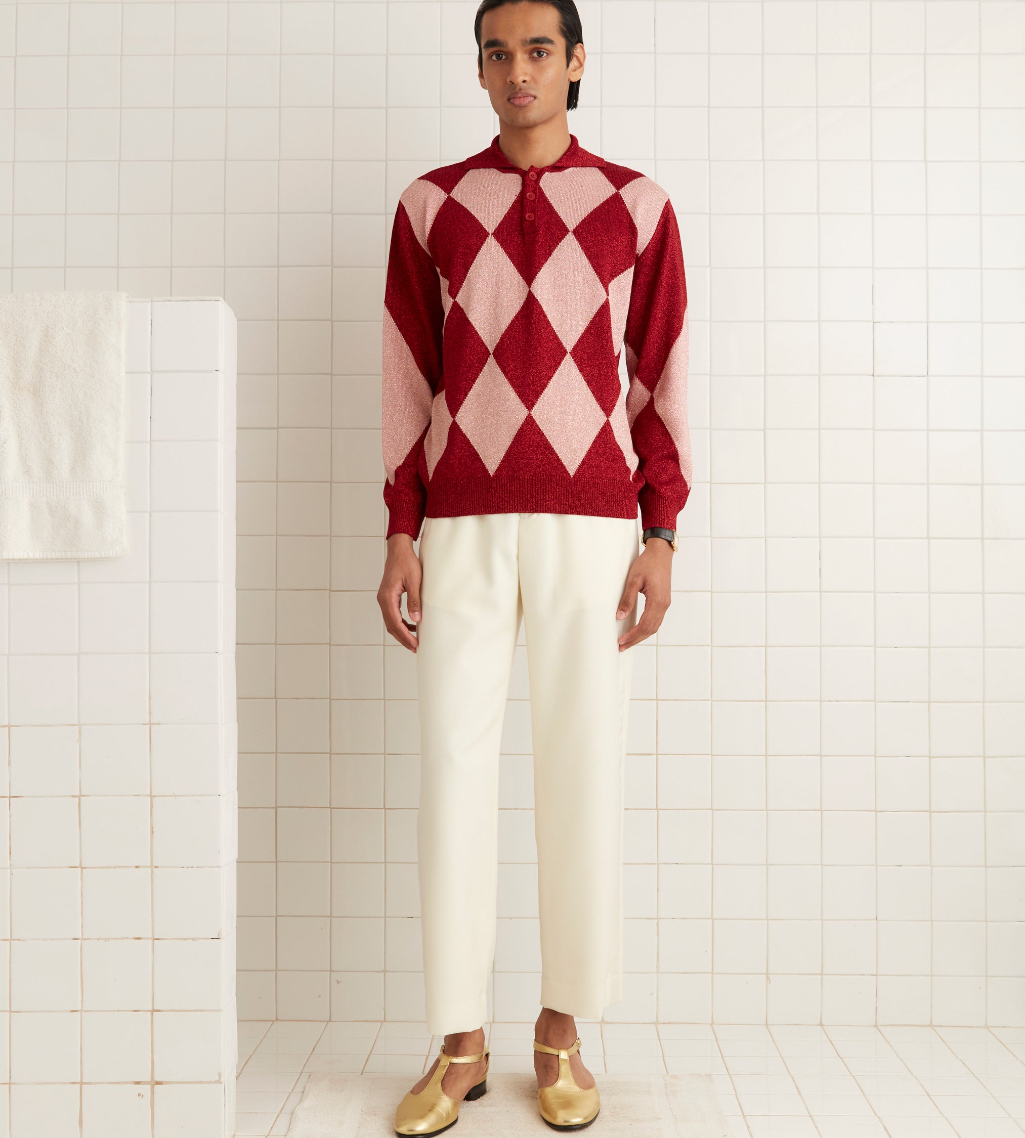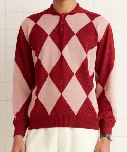 This knit polo is inspired by vintage jockey silks. We reproduced the argyle pattern for this style in a lightweight lurex yarn.