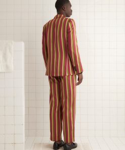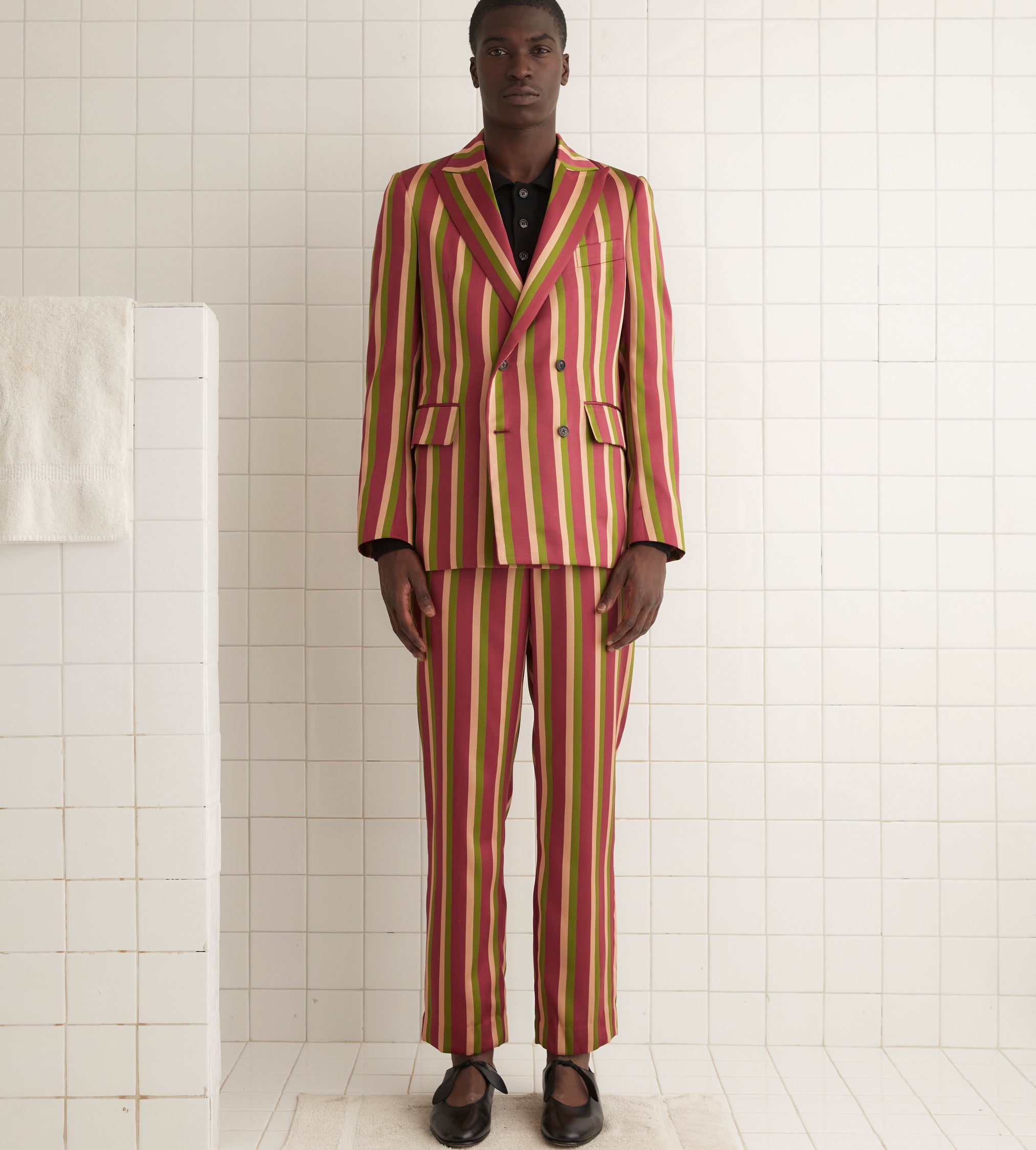 This suit jacket is inspired by Kutnu fabric. Kutnu is historically woven in Gaziantep in Southern Turkey. Rendered in satin with silk warp and cotton weft thread, this striped jacket is known for its distinctive shimmer.