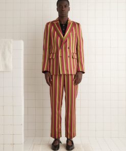 This suit jacket is inspired by Kutnu fabric. Kutnu is historically woven in Gaziantep in Southern Turkey. Rendered in satin with silk warp and cotton weft thread, this striped jacket is known for its distinctive shimmer.