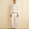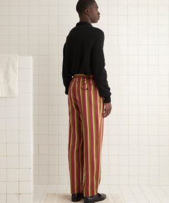 These trousers are inspired by Kutnu fabric. Kutnu is historically woven in Gaziantep in Southern Turkey. Rendered in satin with silk warp and cotton weft thread, this striped trouser is known for its distinctive shimmer. The silhouette is that of a traditional trouser—high rise, straight leg.