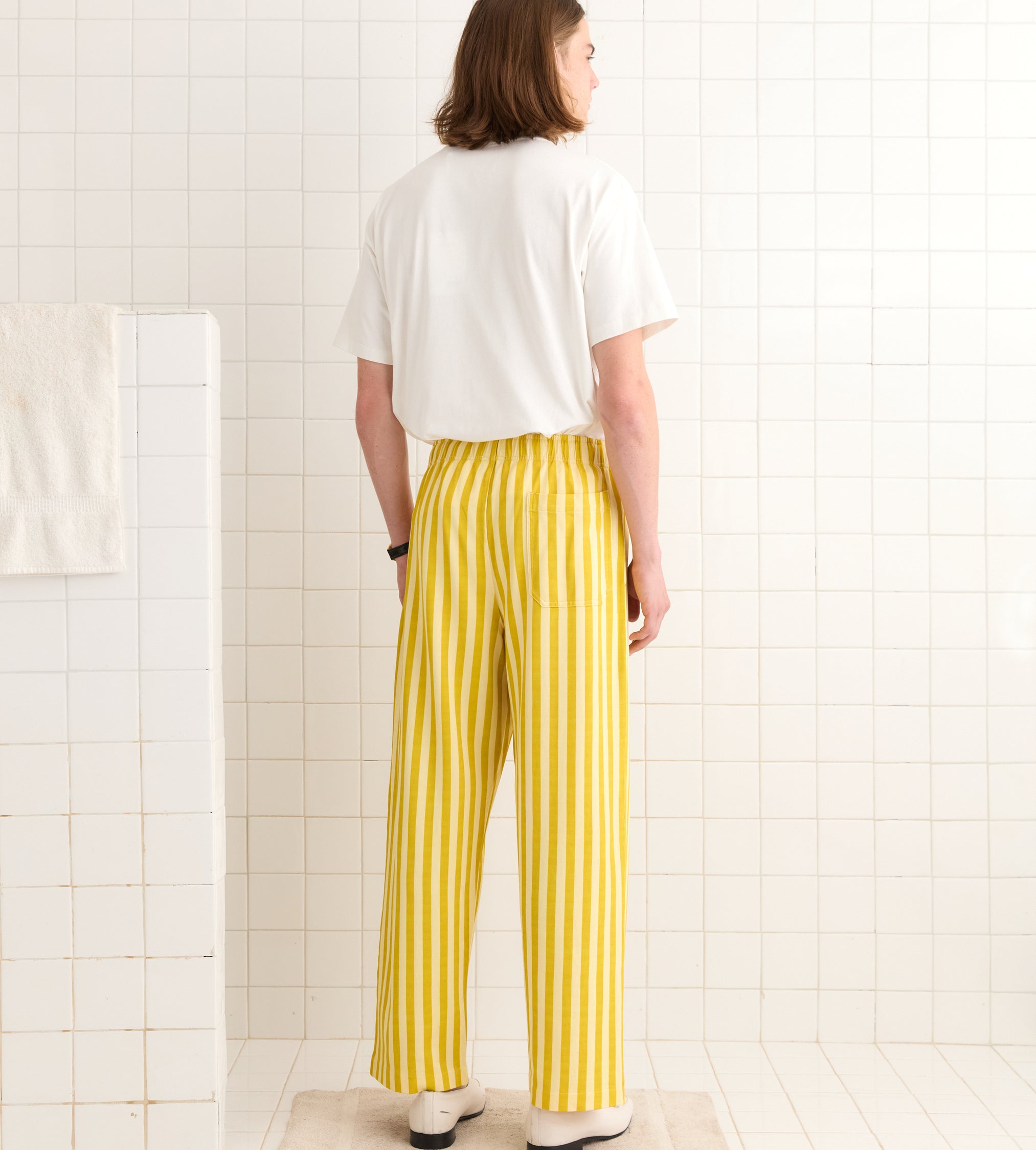 These sweatpants are inspired by a jersey from the 1940s, which featured yellow-and-white striped trim. We reproduced the stripe for this style, which has a relaxed, wide-leg silhouette. The pants are made from a silky, heavyweight fabric reproduced from vintage jerseys.
