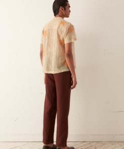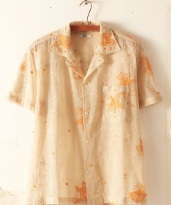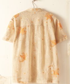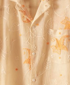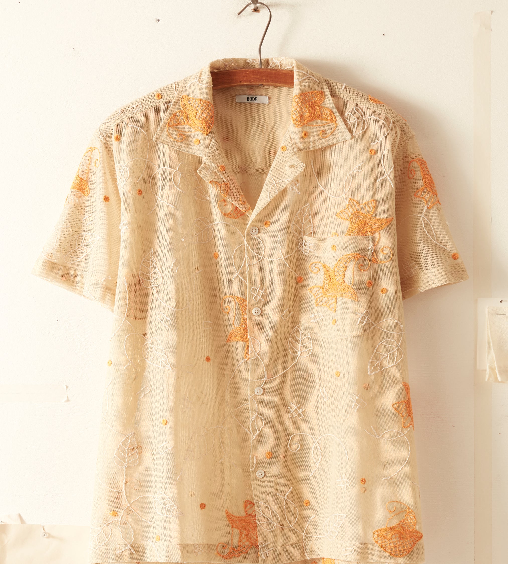 Inspired by a hand-embroidered lace doily from the 1920s-1940s, this shirt features hand-guided and couching embroidery, a style wherein a cord of thread is laid on the fabric in patterns, then secured with short perpendicular stitches.