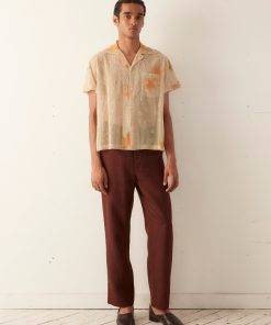 Inspired by a hand-embroidered lace doily from the 1920s-1940s, this shirt features hand-guided and couching embroidery, a style wherein a cord of thread is laid on the fabric in patterns, then secured with short perpendicular stitches.