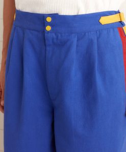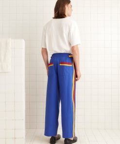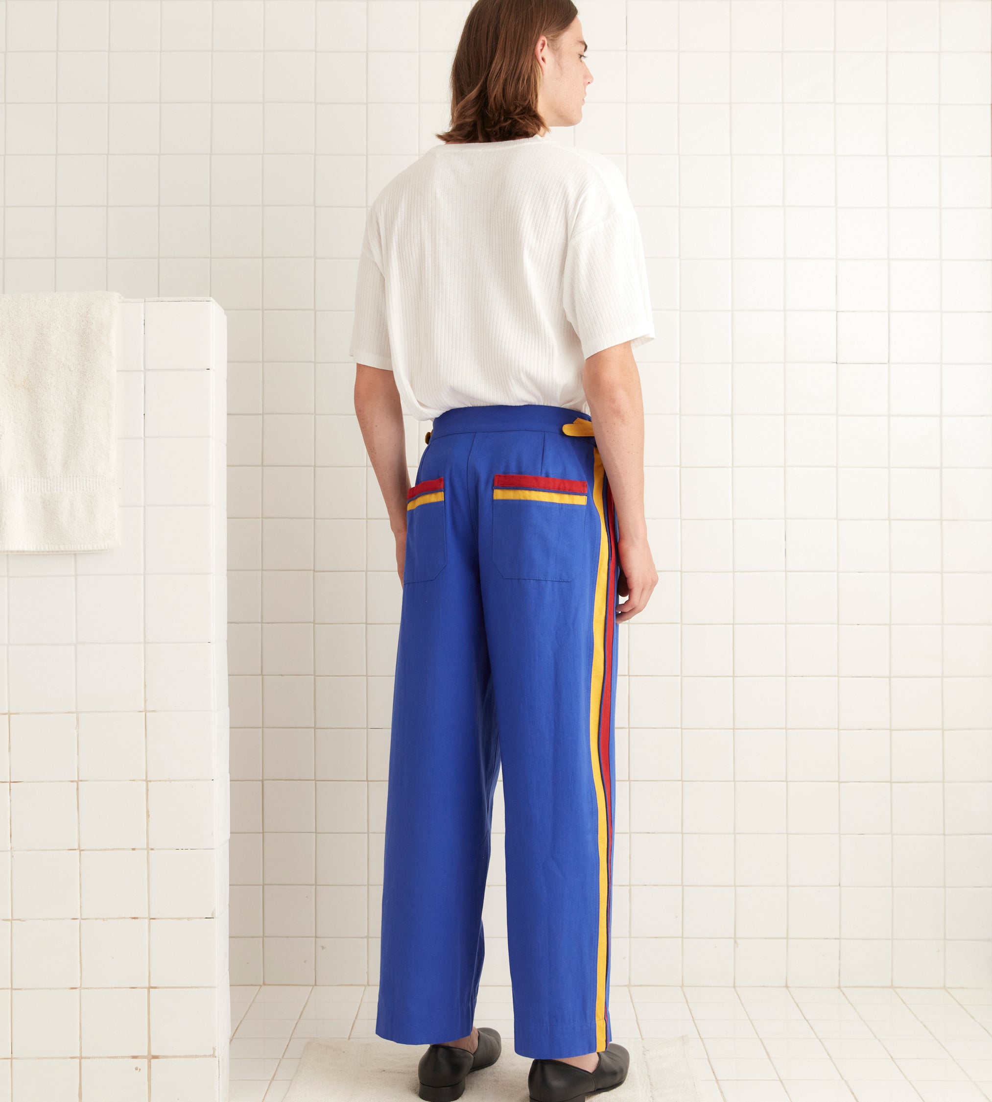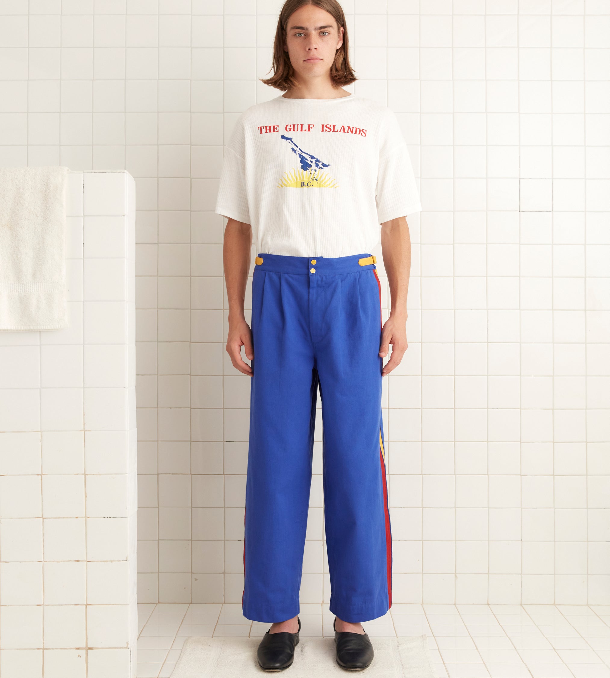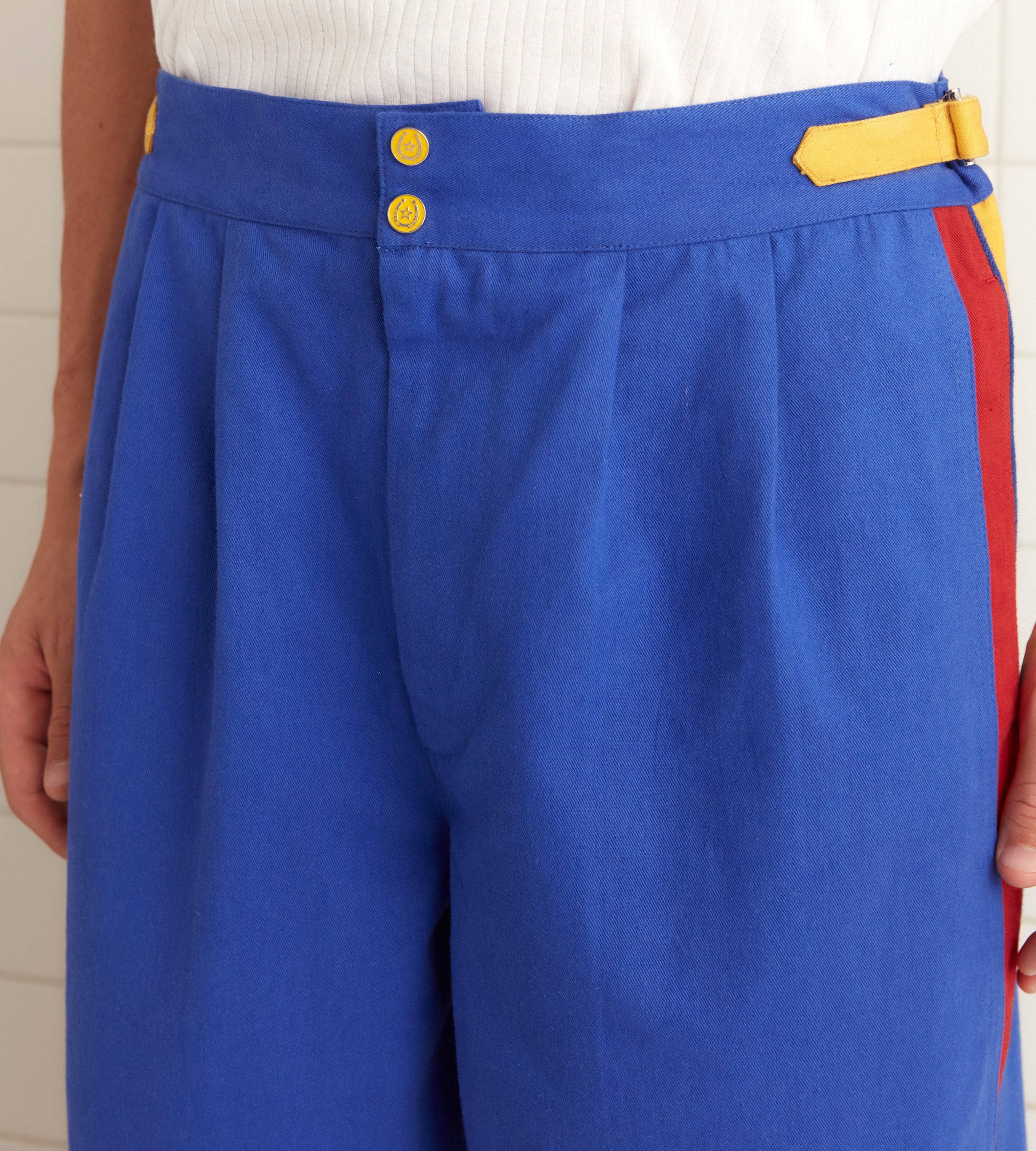 These trousers are inspired by a pair of baseball pants from the 1950s-1960s. We reproduced the colorblocking for this style, which features enamel horseshoe snap buttons. The trousers have a mid-rise and a wide leg.