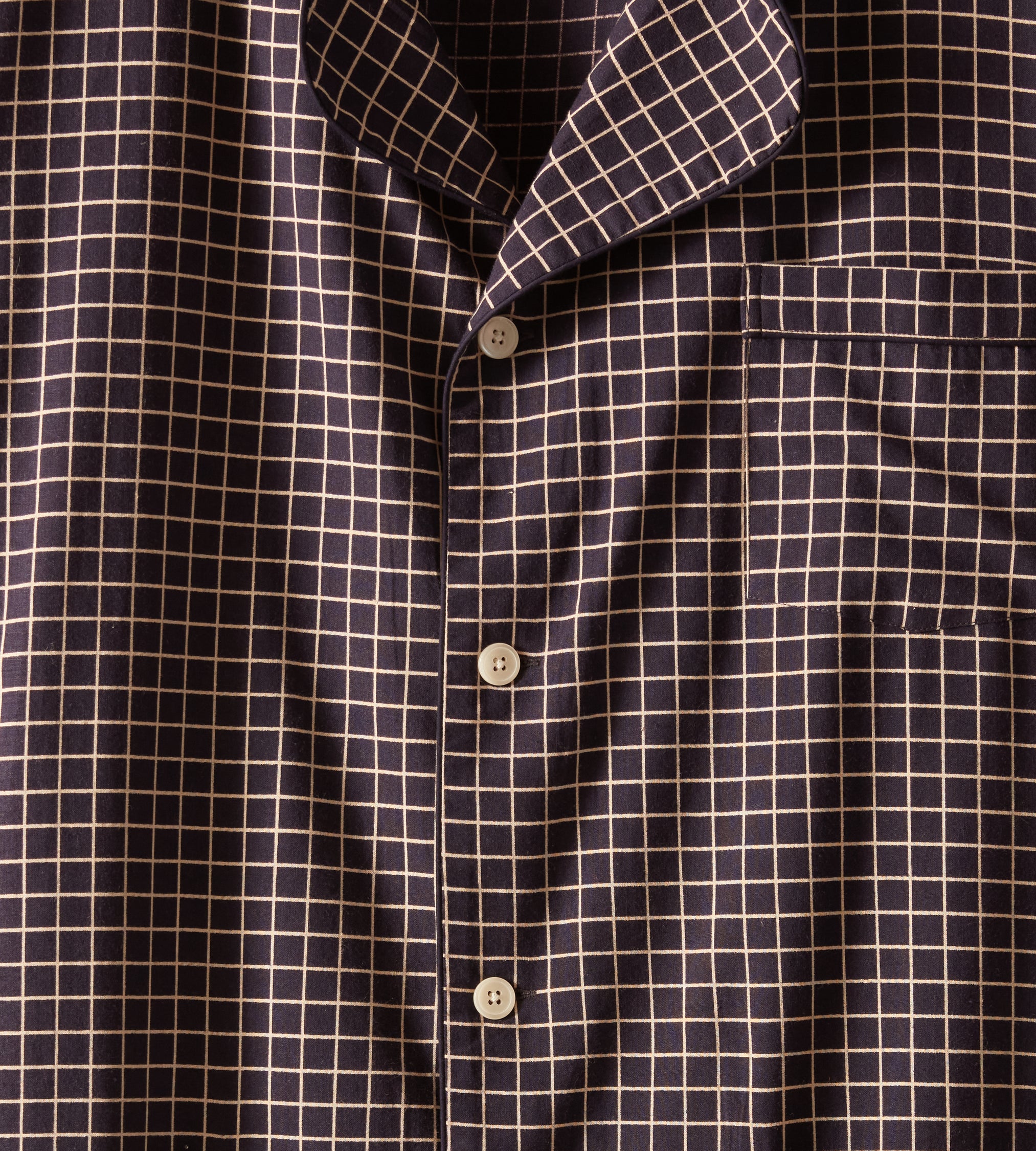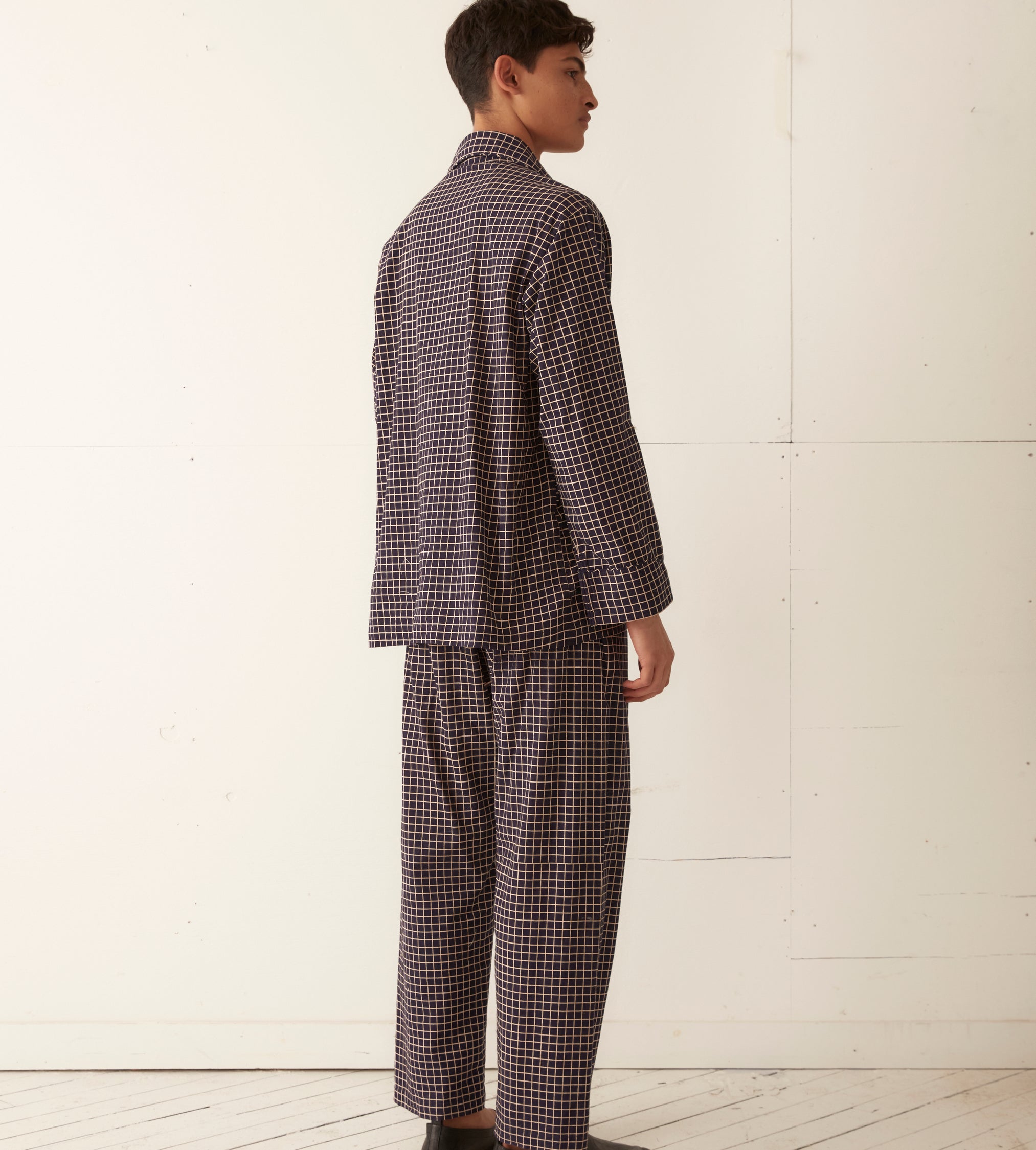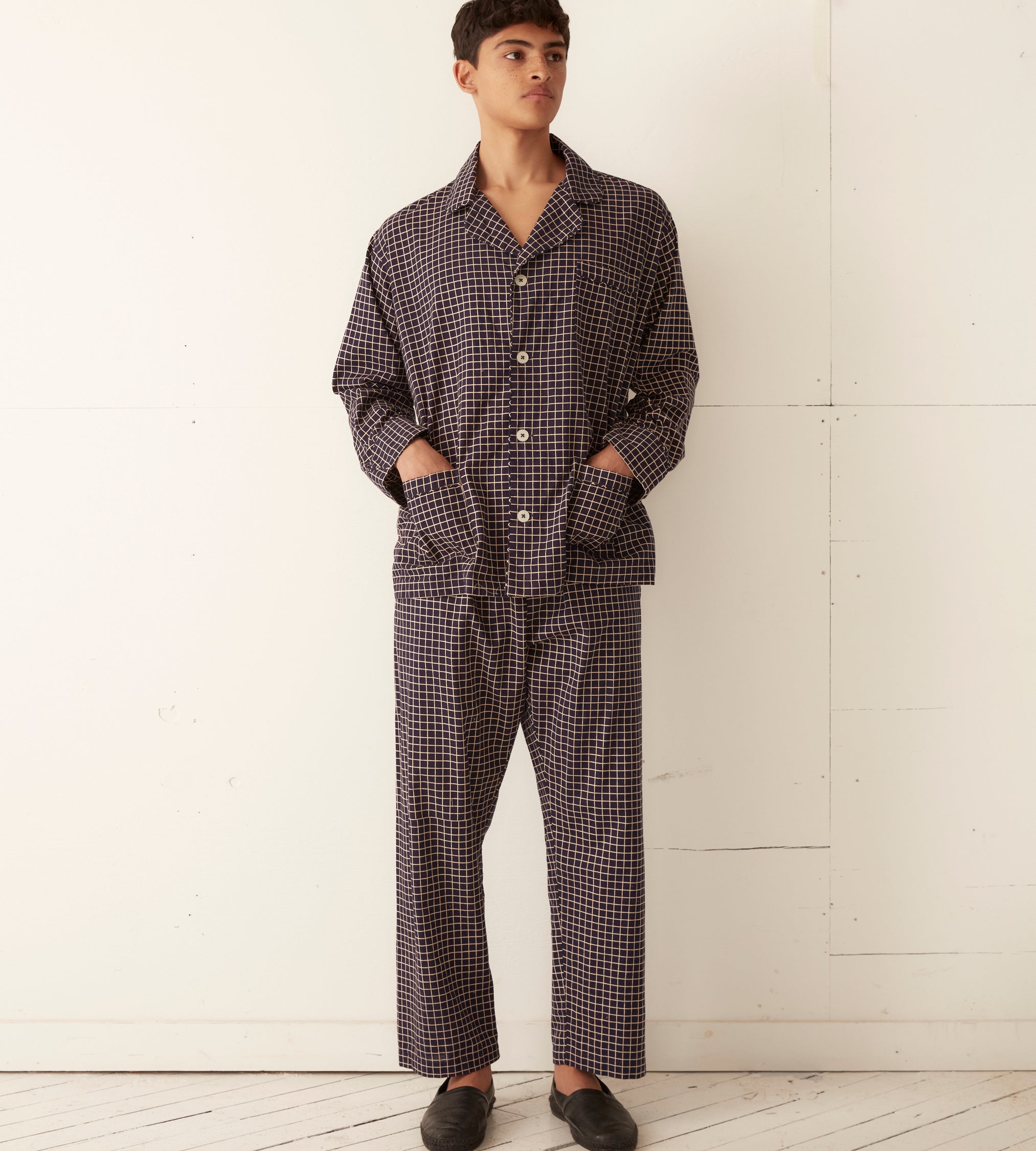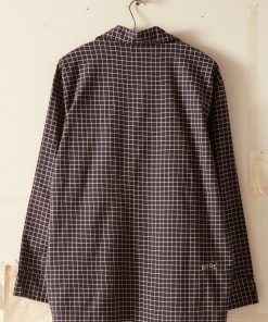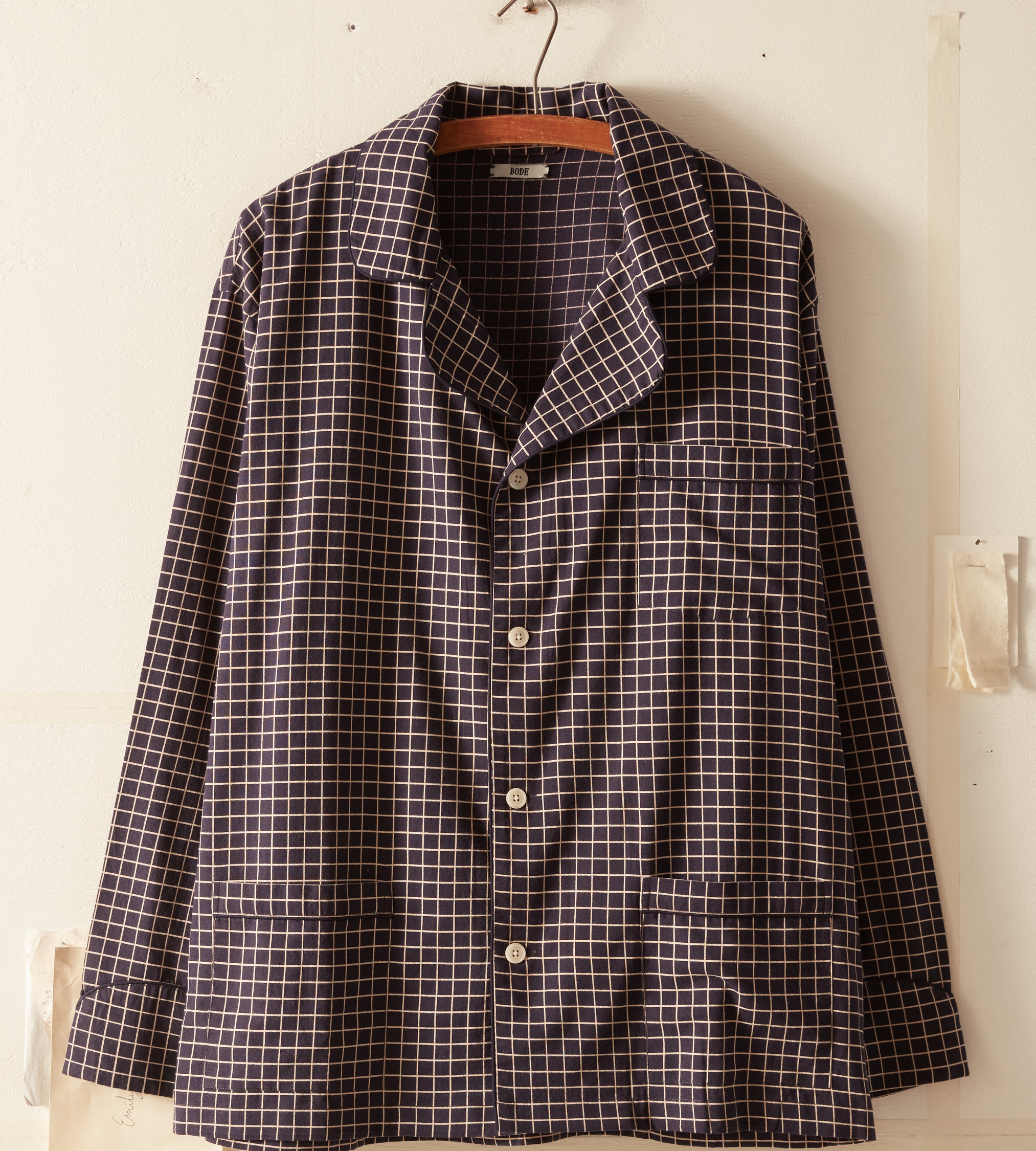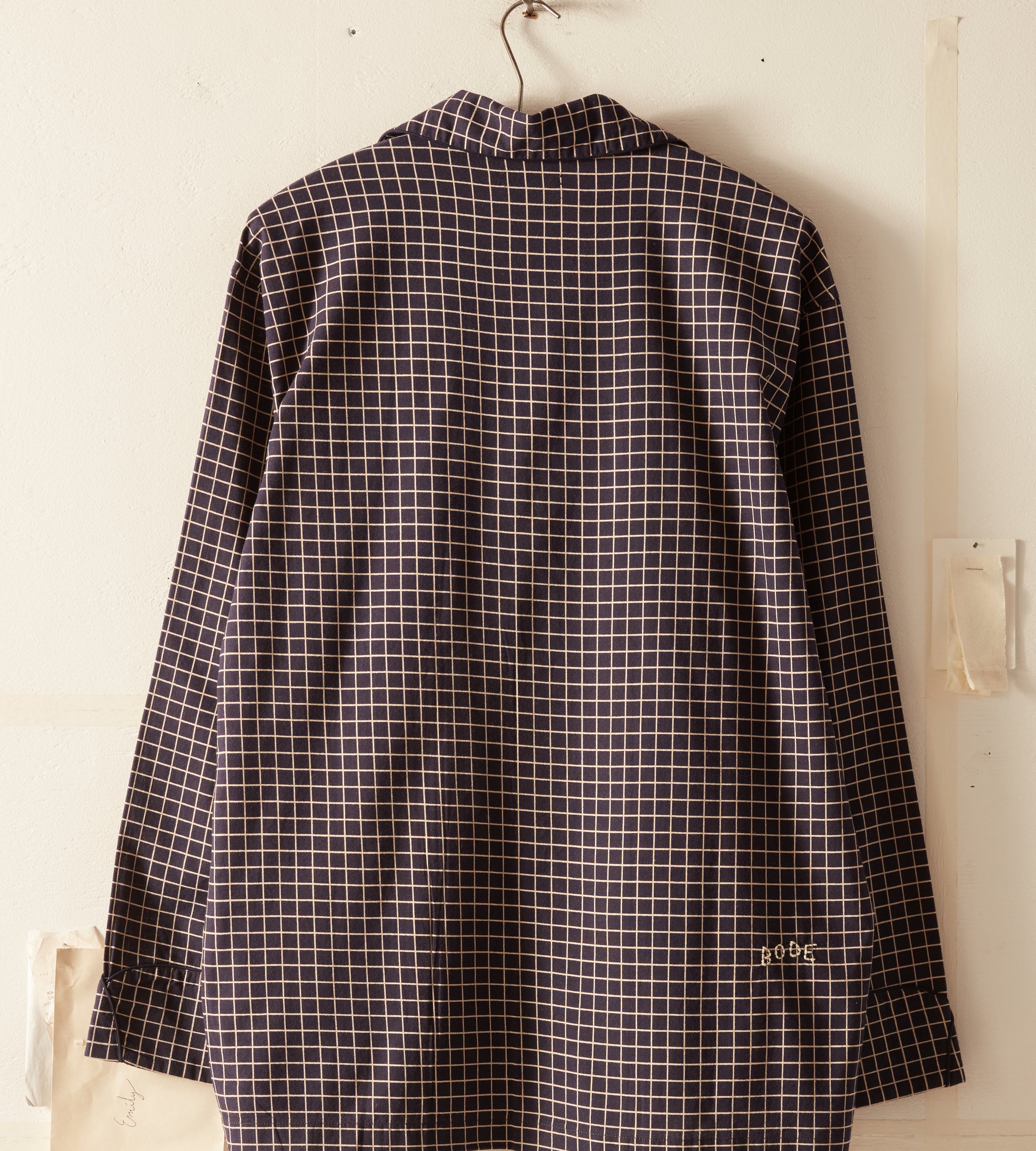 This shirt is inspired by midcentury men’s pajamas. It is made of deadstock rotary-printed fabric, a process which pushes ink through the fabric rather than stamping it on one side. The shirt features the Bode logo hand-embroidered on the back.
