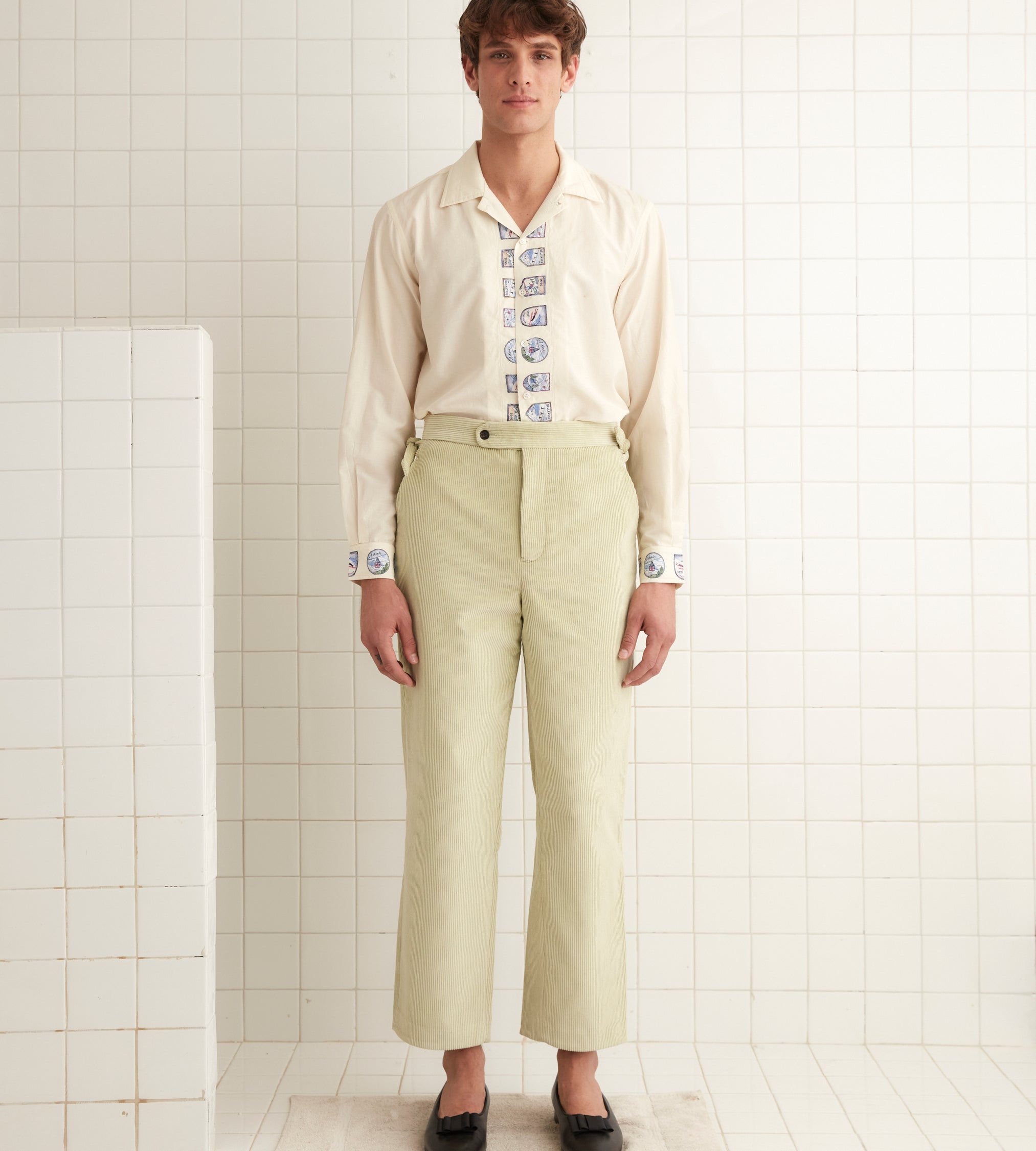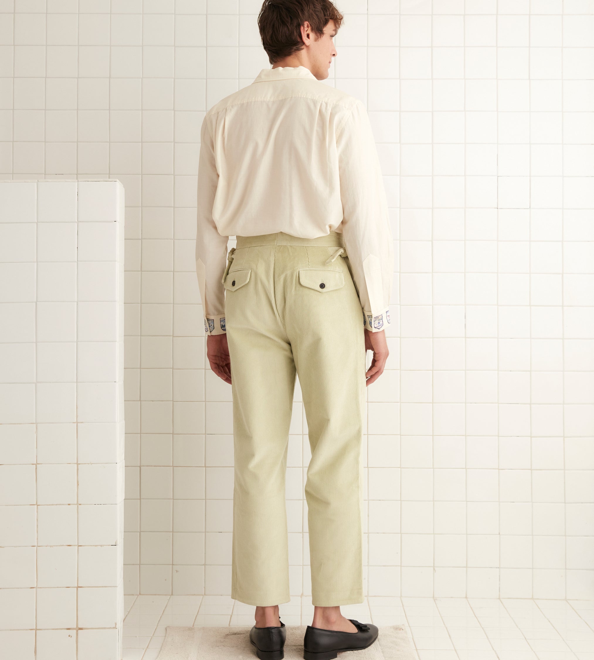 These trousers are made from deadstock corduroy yardage from the late 20th century. They are cut in a classic silhouette, with a mid-rise and straight leg.