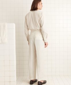These trousers are inspired by men’s suiting trousers from the 1950s-1960s. We reproduced the mid-rise and wide-leg silhouette in an ivory and taupe graph check.