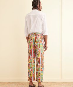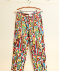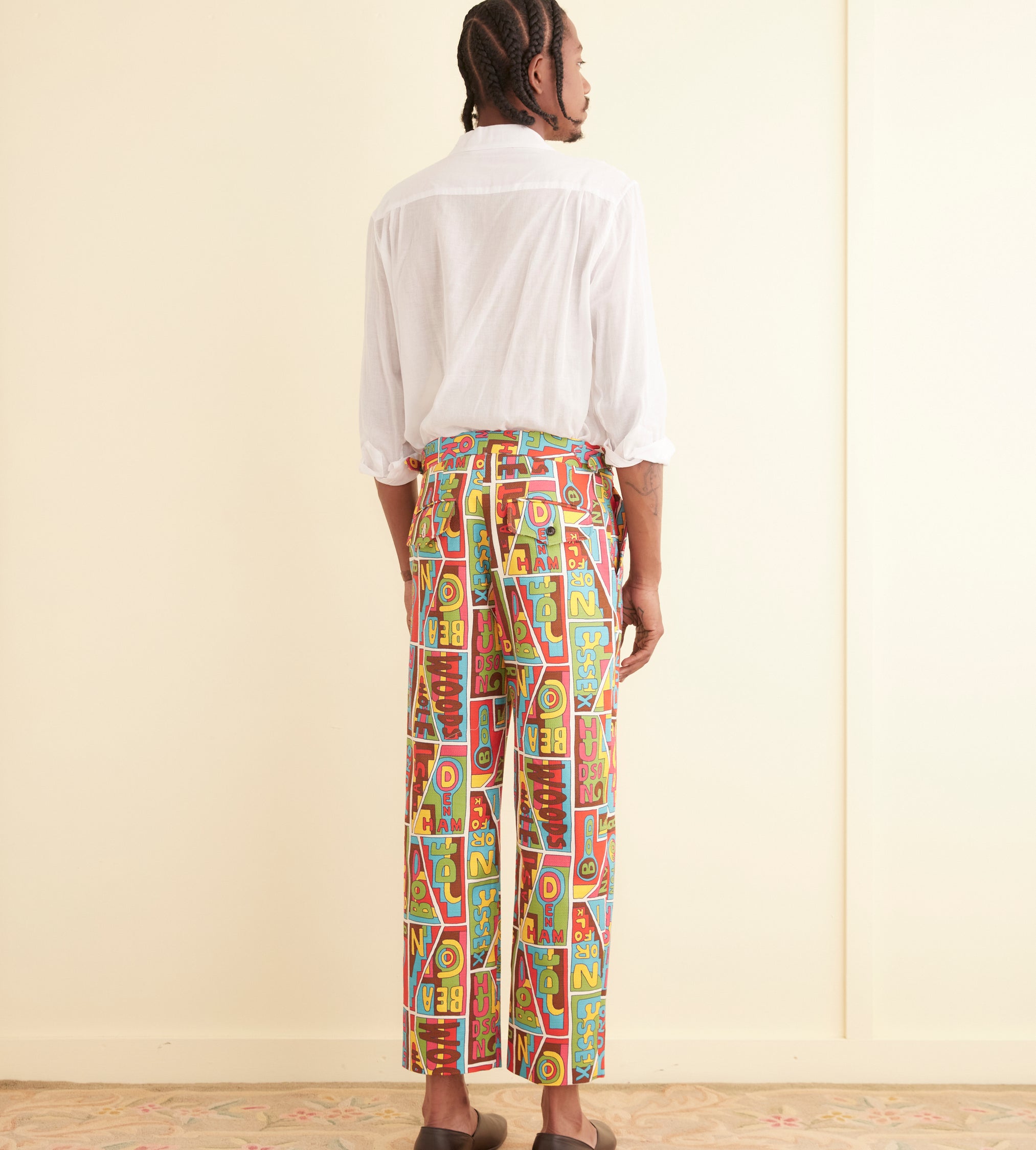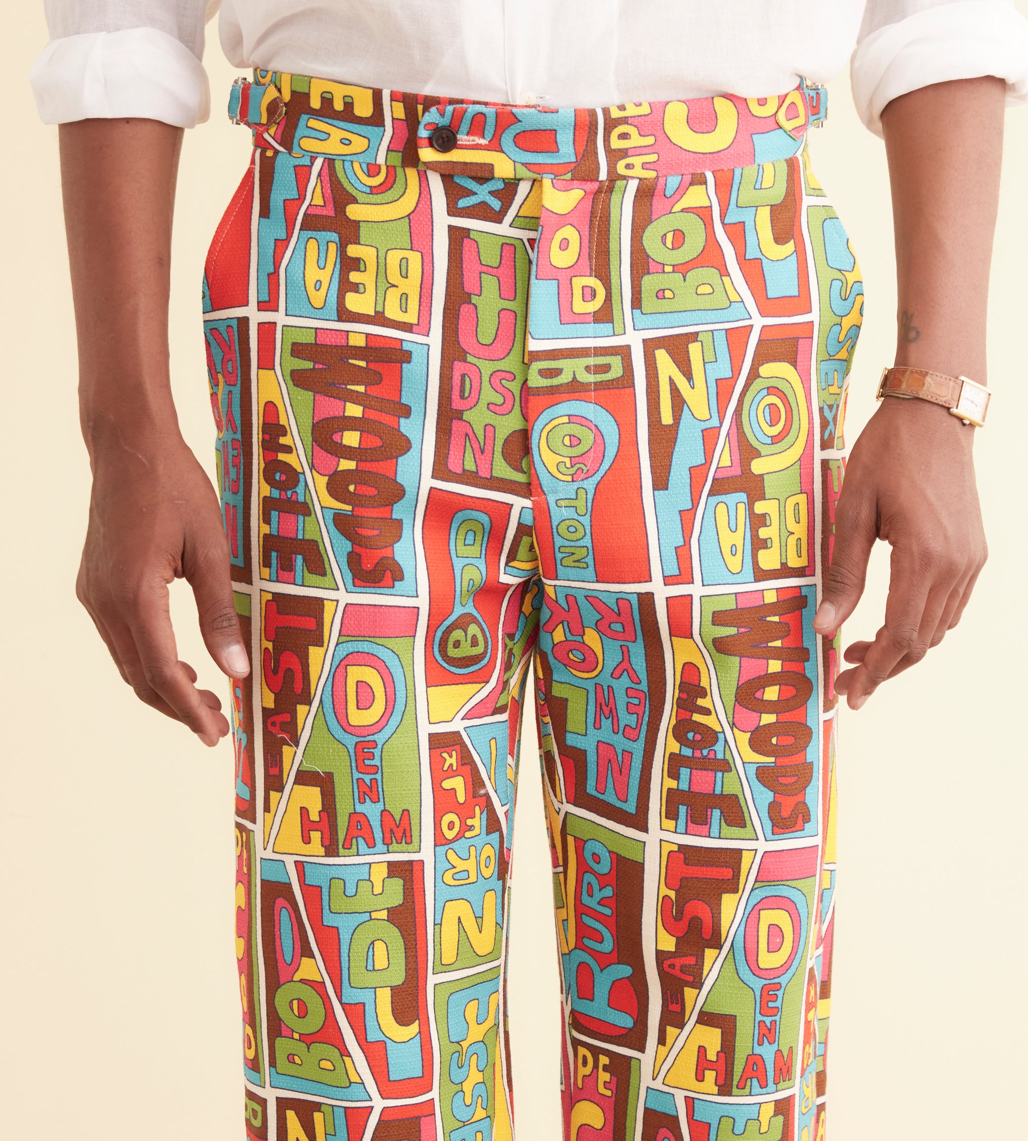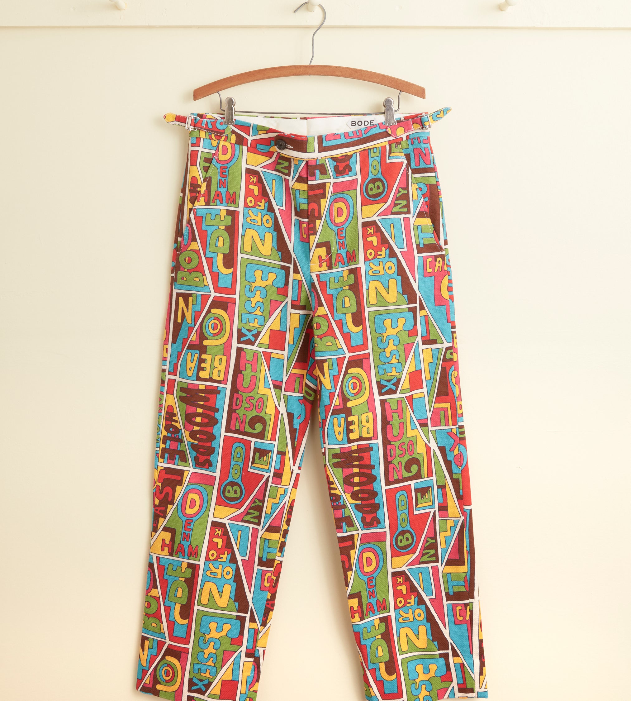 These trousers are inspired by vintage upholstery fabric, circa 1960s-1970s. We reproduced the fabric for this style, incorporating “Bode” into the pattern.