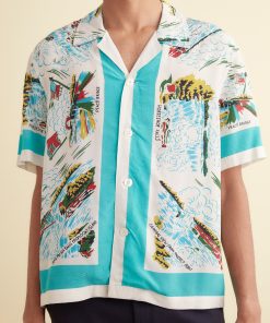 This short-sleeved shirt is inspired by a novelty tablecloth from the 1940s, likely a souvenir piece produced in the tourism boom of the post-war decades. We have reproduced the original design—which featured illustrations of Niagara Falls—on this shirt with a camp collar and a straight hem.