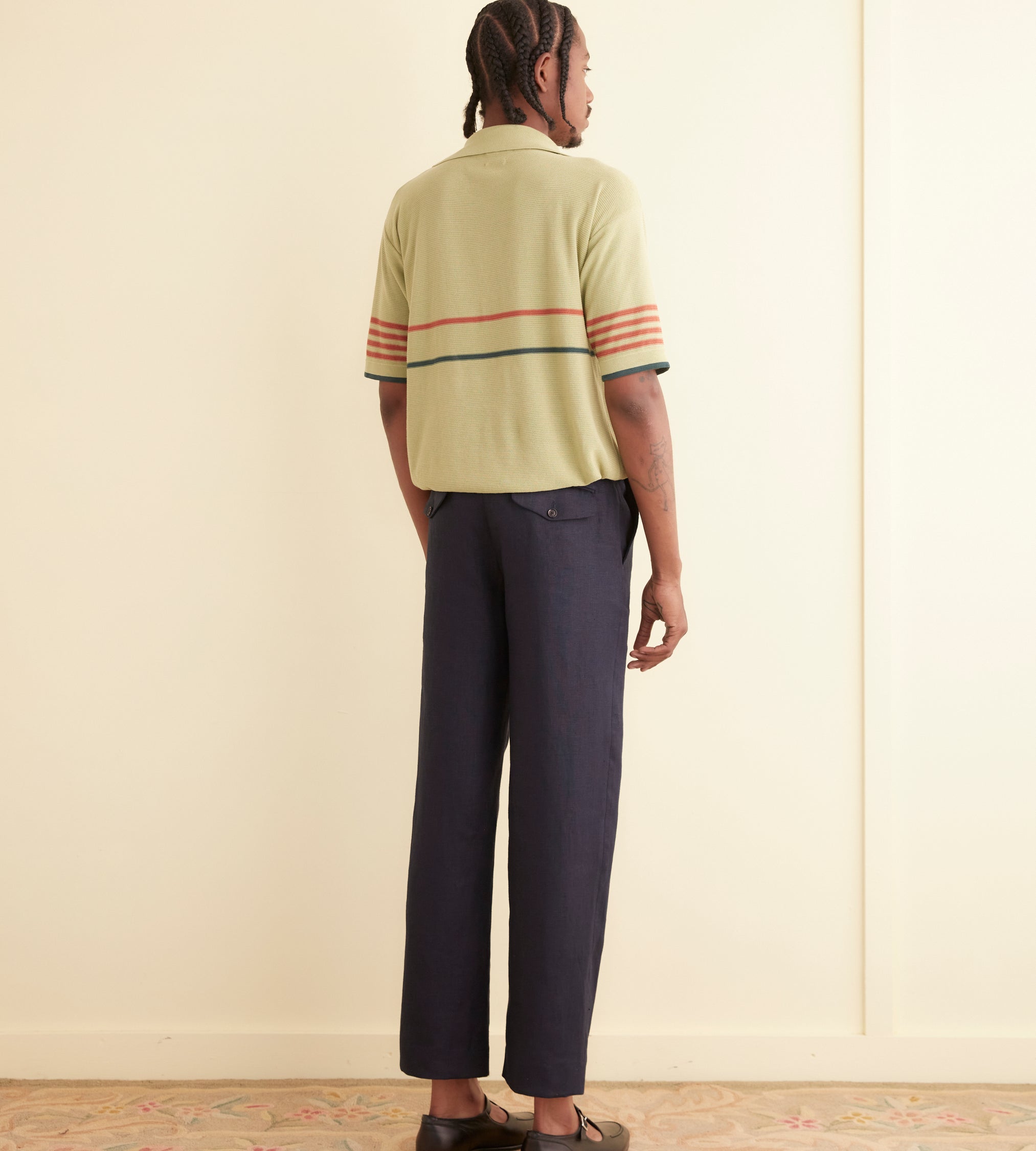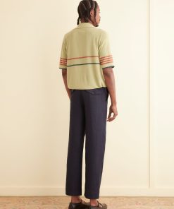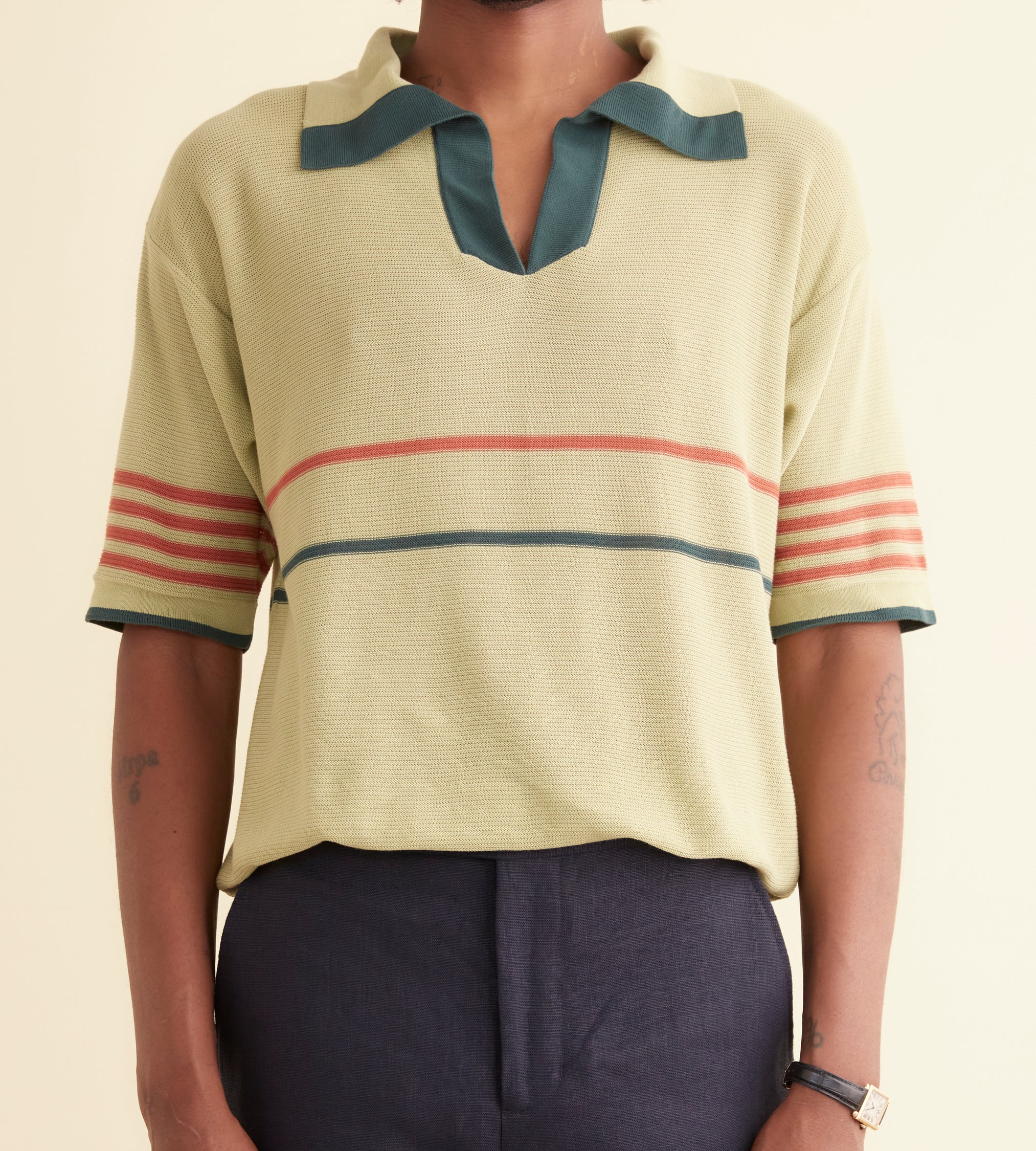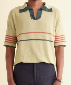This polo top is inspired by a knit polo from the 1970s. We reproduced the original green and red stripe pattern in a dry yarn.