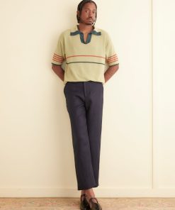 This polo top is inspired by a knit polo from the 1970s. We reproduced the original green and red stripe pattern in a dry yarn.