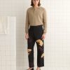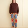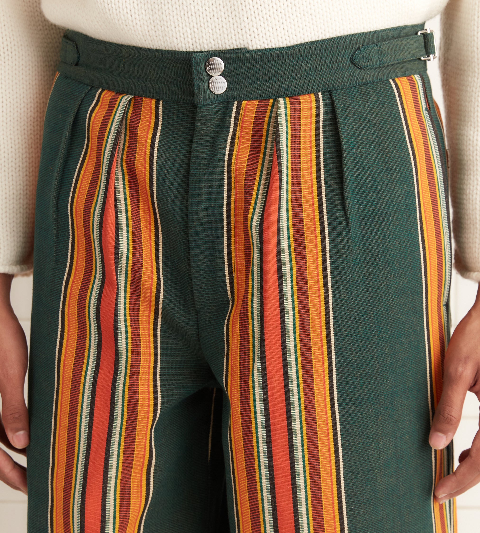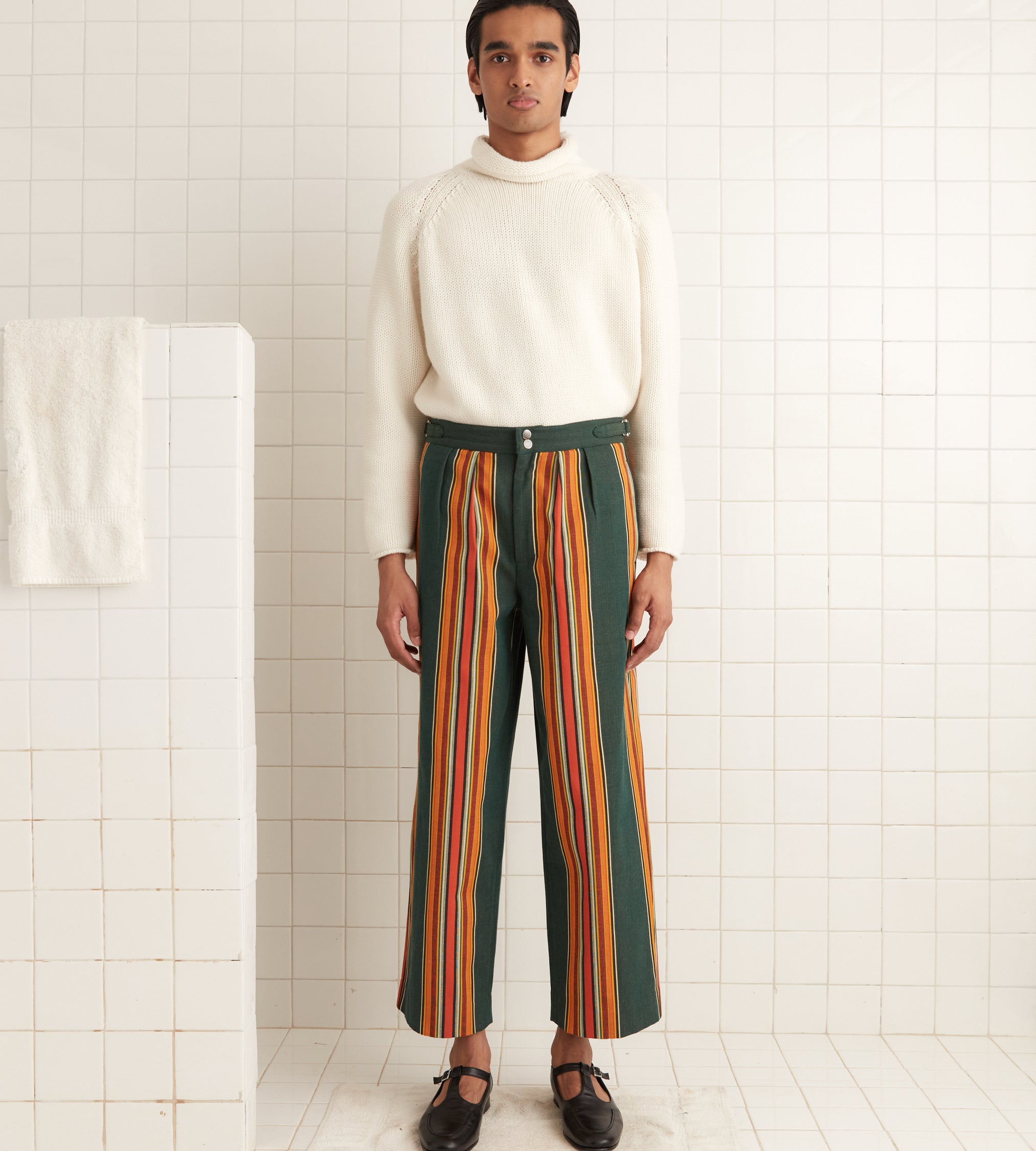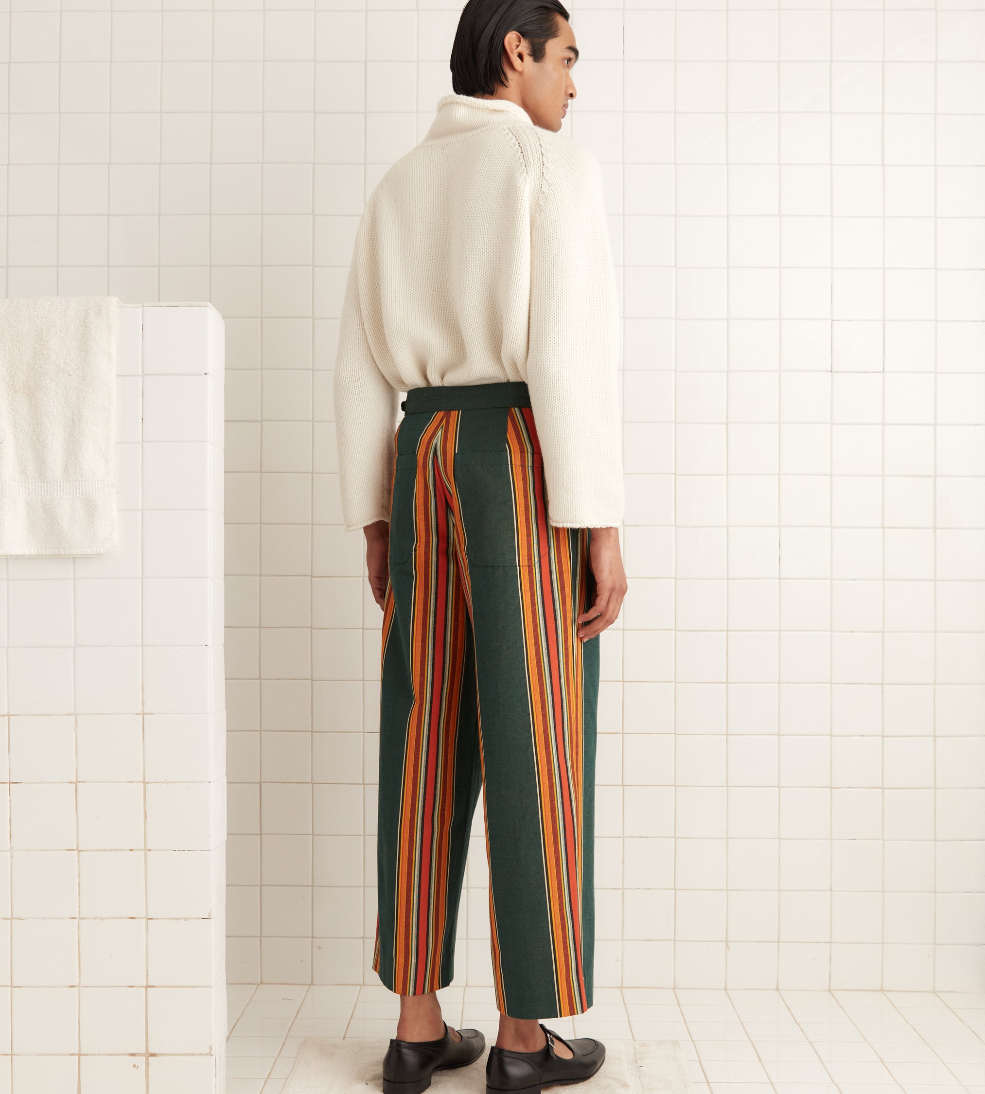 These trousers are inspired by a canvas vest from the 1960s. We reproduced the striped yardage and snaps for this style. The trousers have a mid-rise and a wide-leg silhouette.