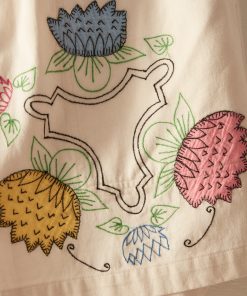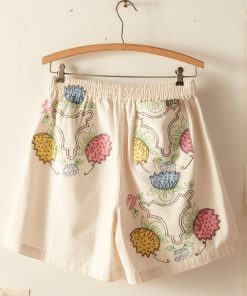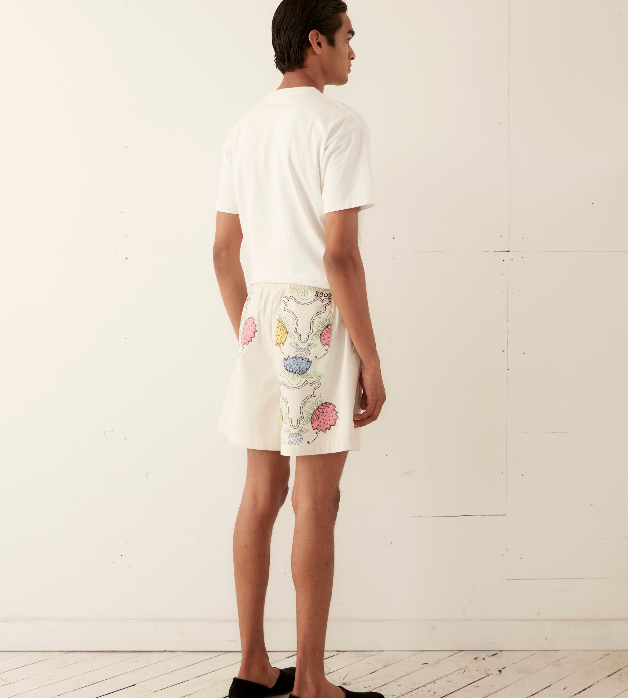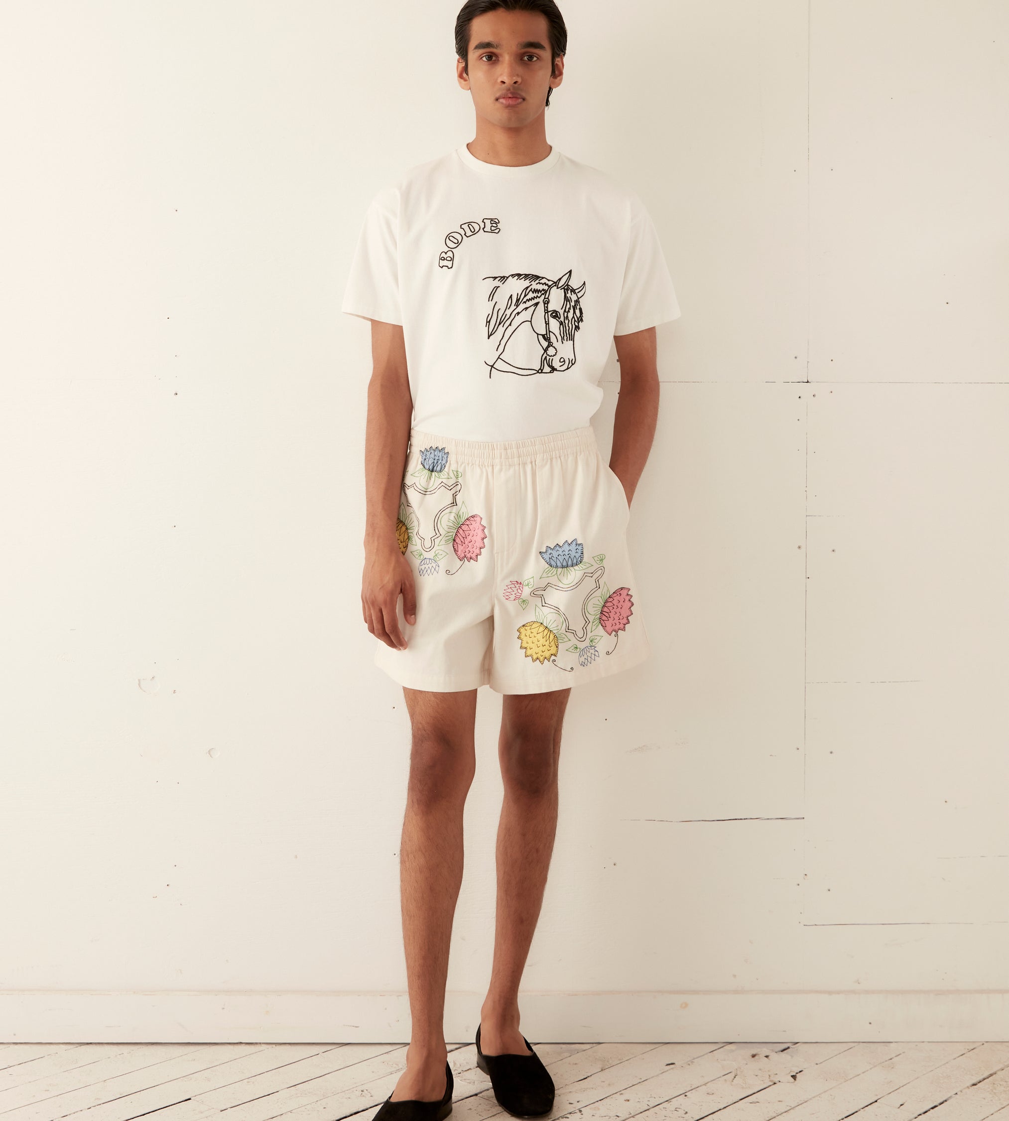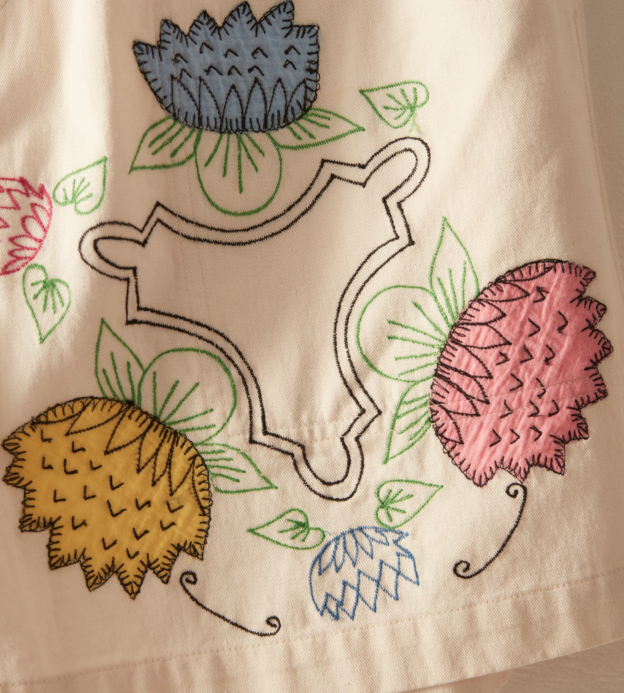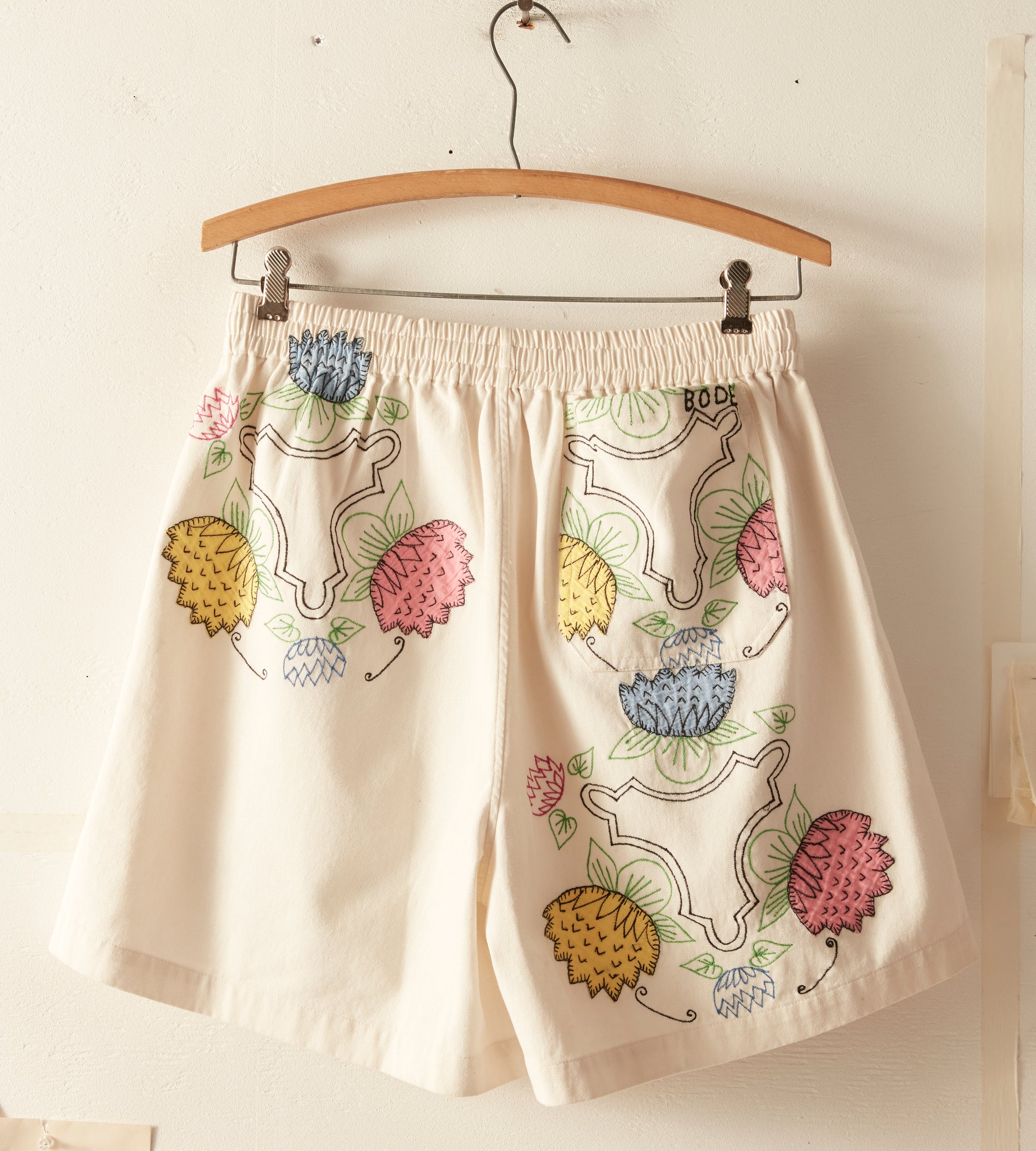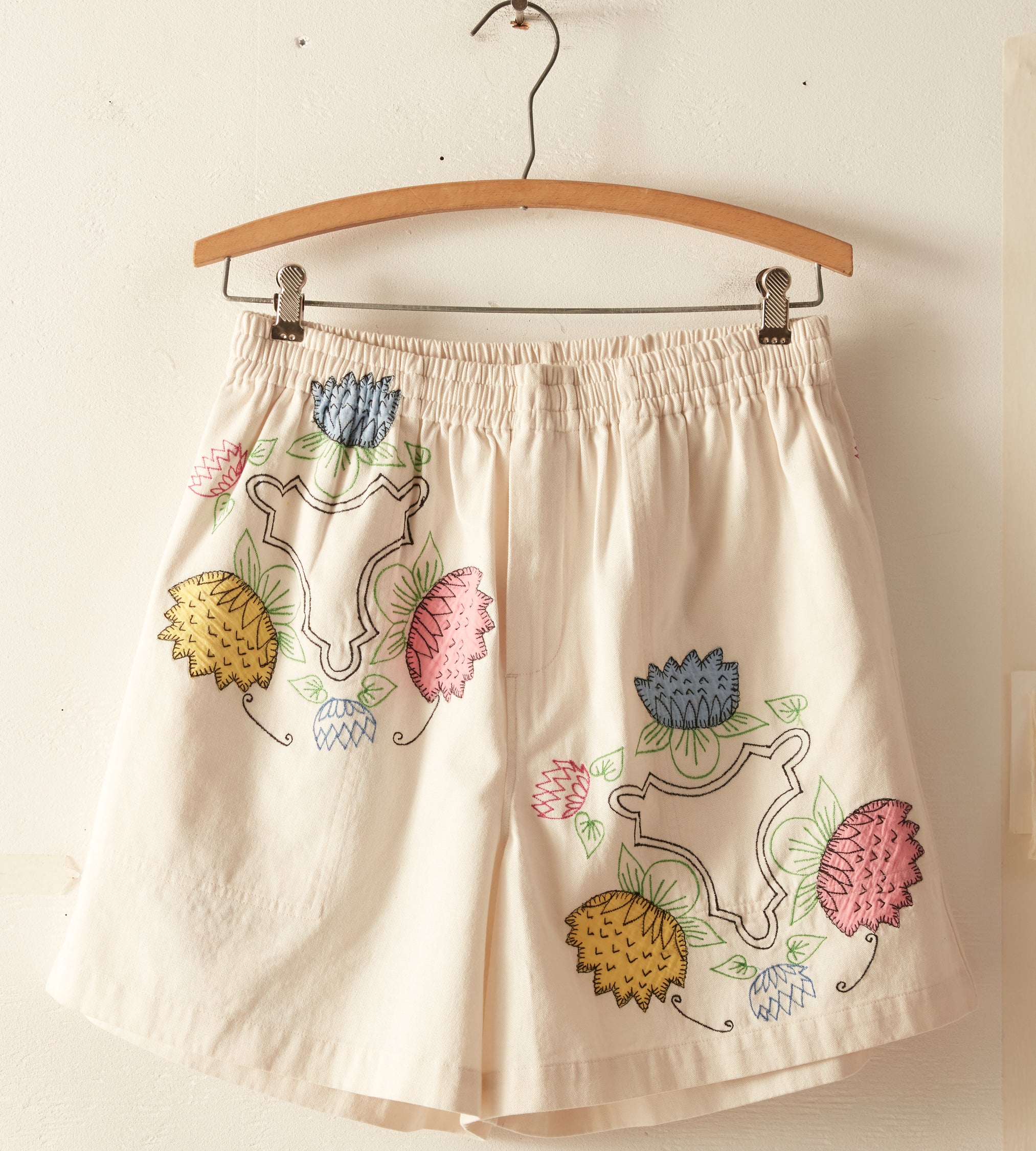 These shorts are inspired by a 1920s-1930s tablecloth. The original lotus-flower appliqué has been replicated here, with each patch cut and sewn individually. The silhouette mimics that of a traditional Canadian rugby shorts, with a short inseam and a wide leg opening.