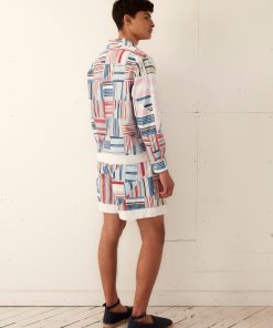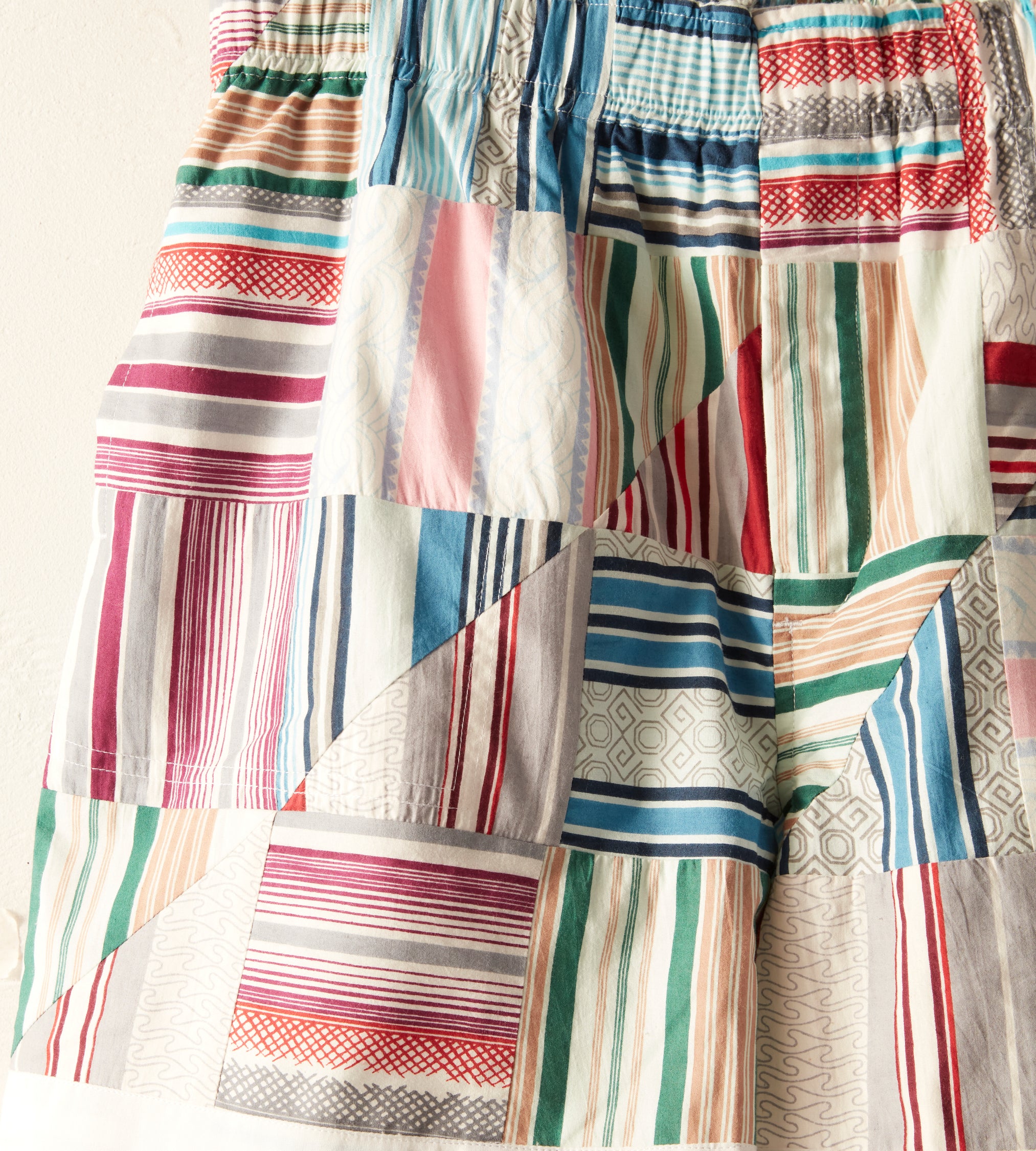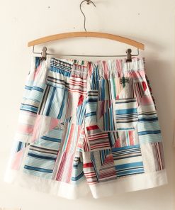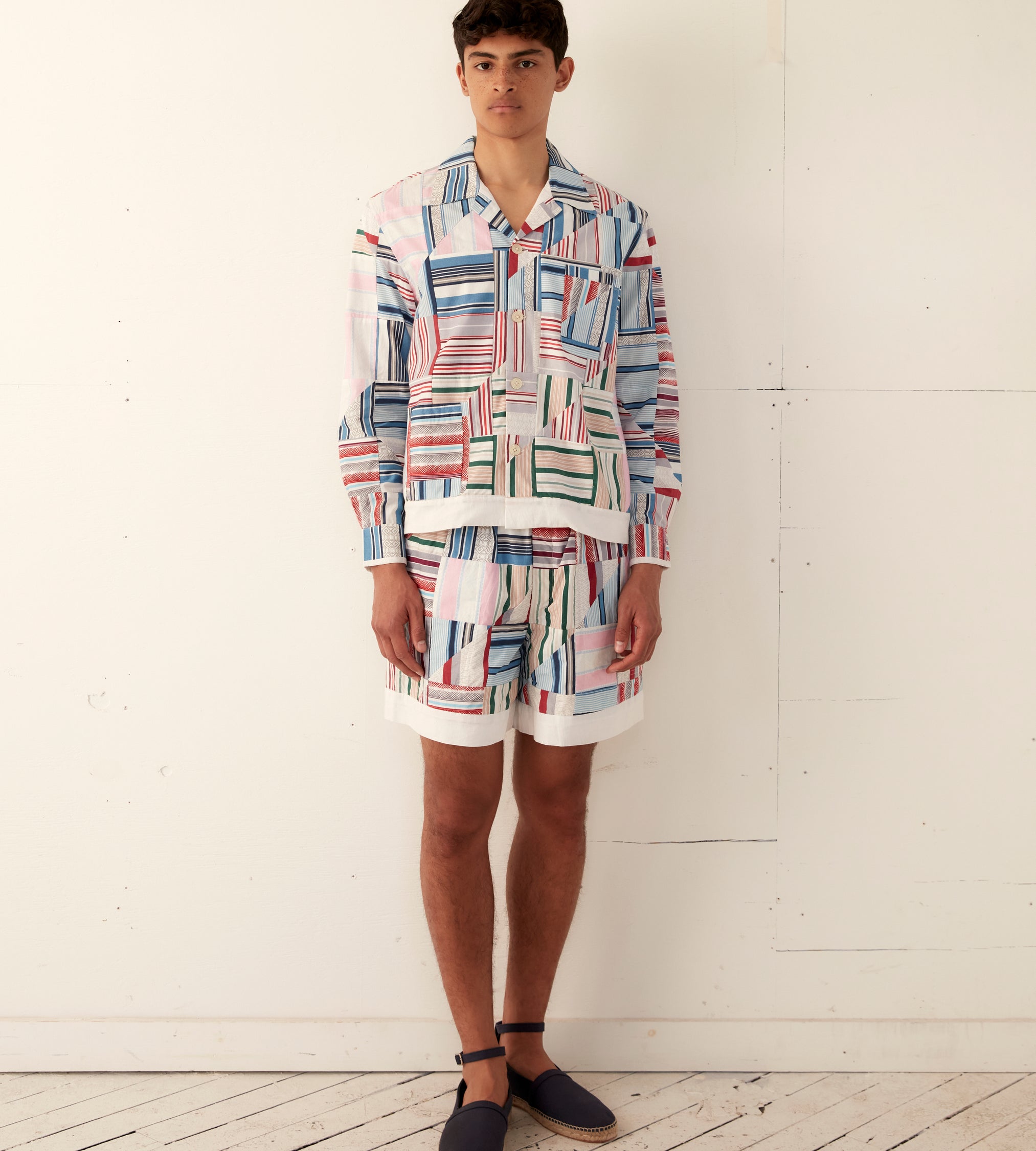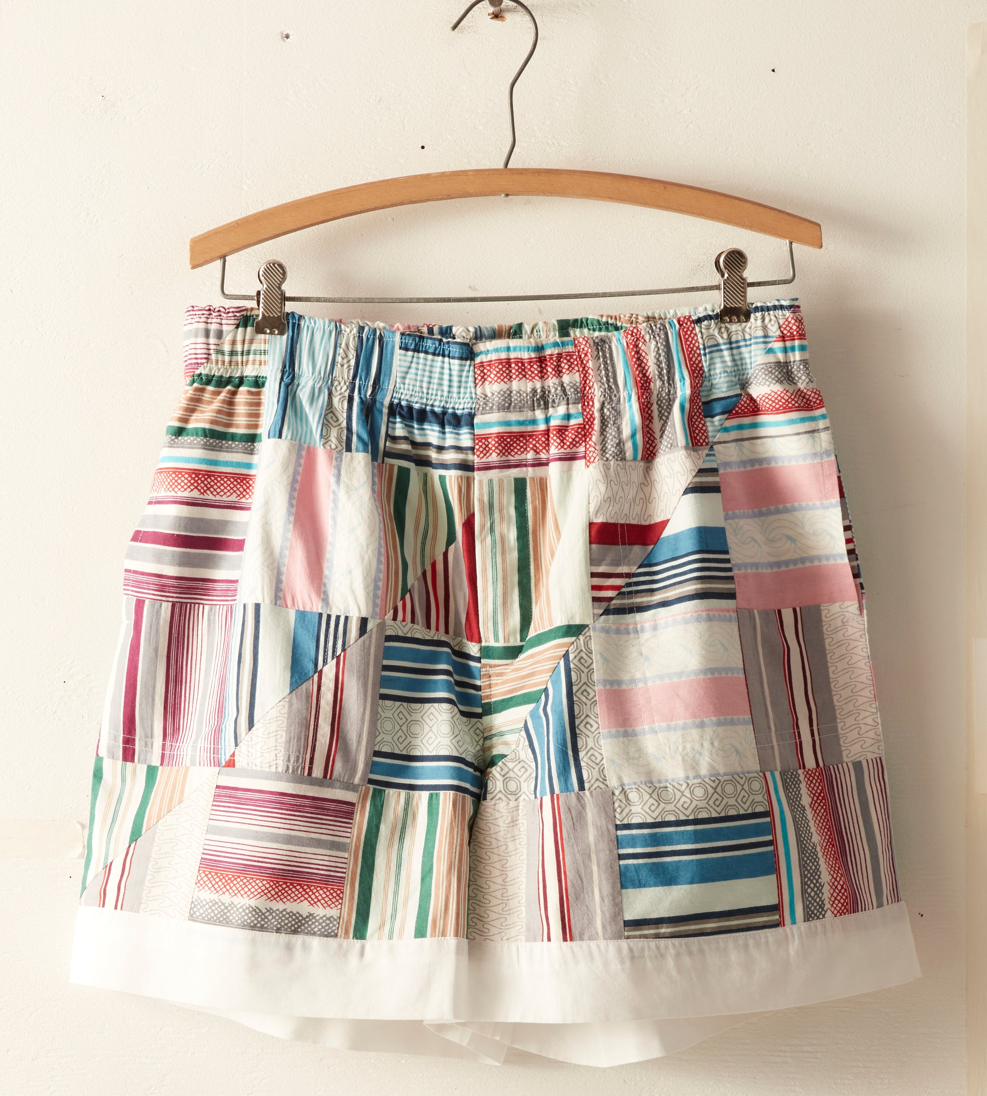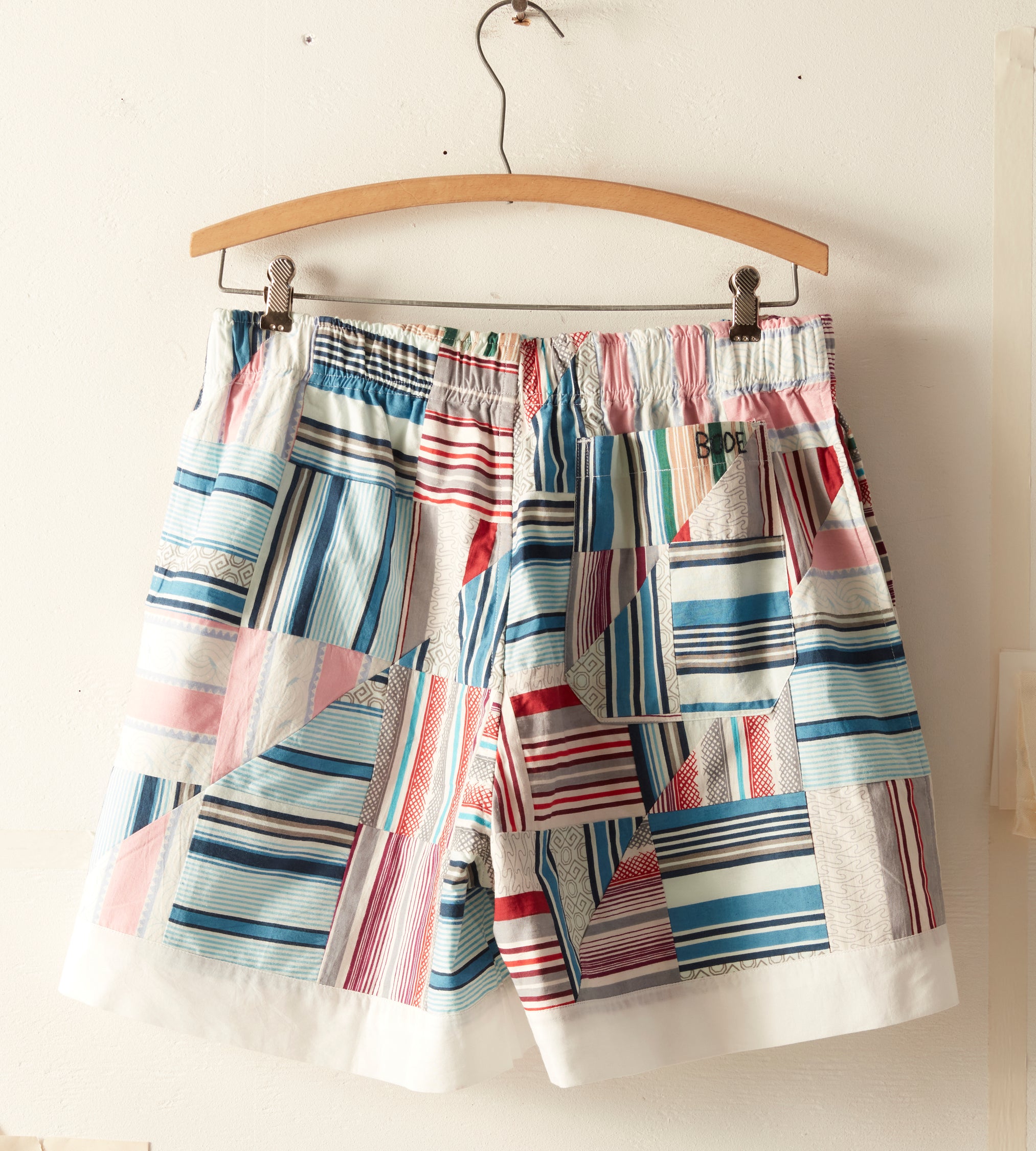 These shorts are inspired by a quilt top from the 1940s-1950s. The original patterns has been reproduced via screenprinting and quilted together. They are cut to mimic traditional rugby shorts worn throughout Canada, with a short inseam and wide leg opening.
