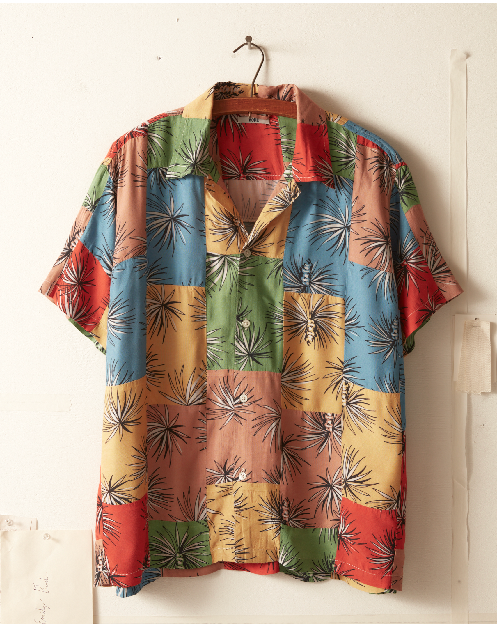 This shirt is inspired by an unfinished midcentury quilt top. The fabric of the original piece has been faithfully reproduced in different colors and rotary printed with a bristly leaf pattern.