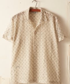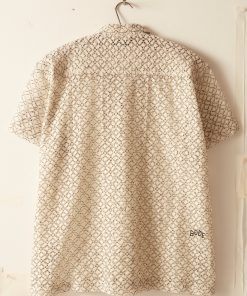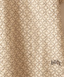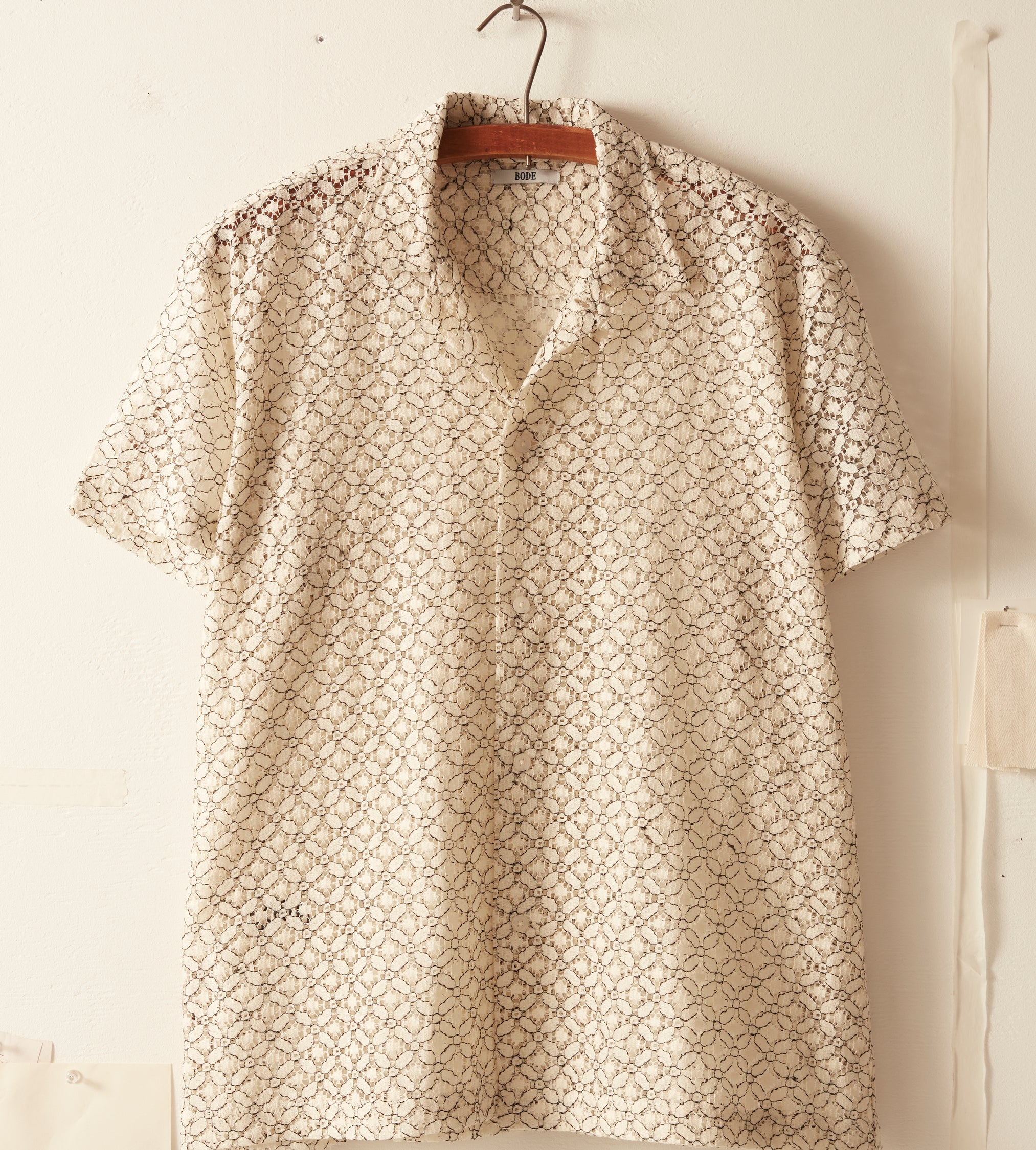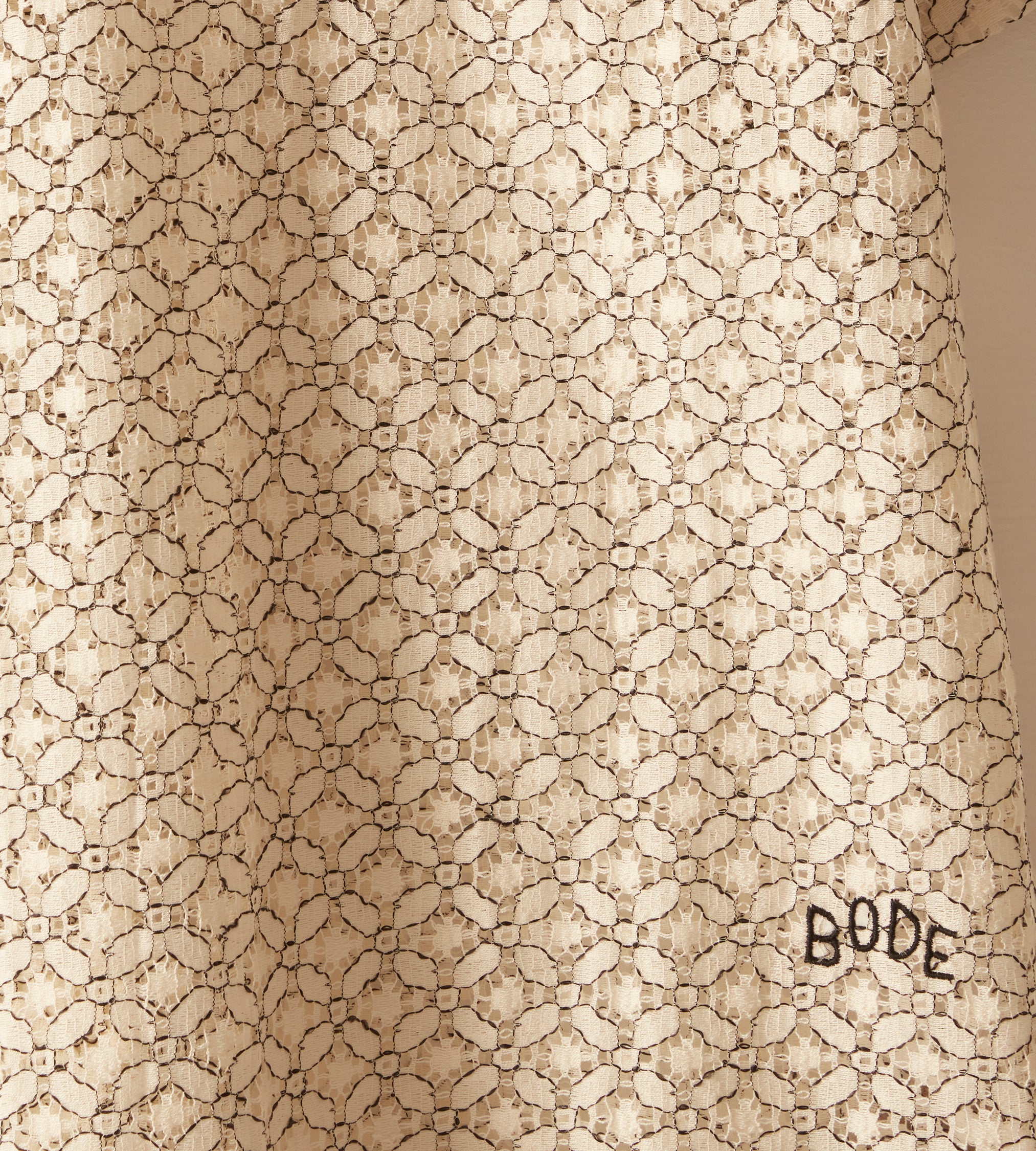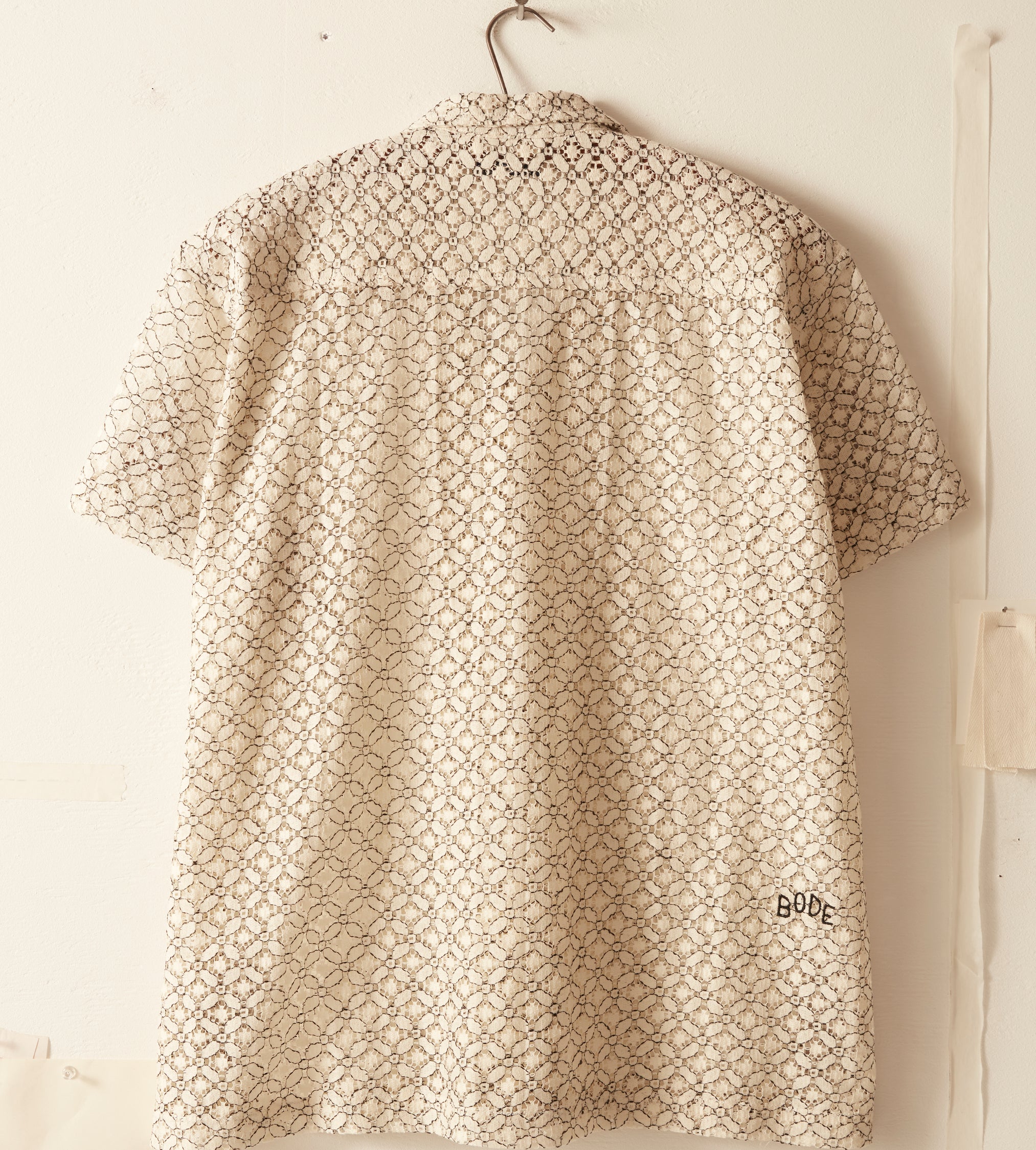 This shirt is inspired by vintage machine lace and is part of Bode’s lace development program. Made of an ecru lace with black edging, it features a camp collar, straight hem, and triangle side seams, as well as hand embroidery on the back.