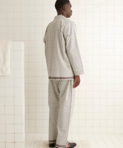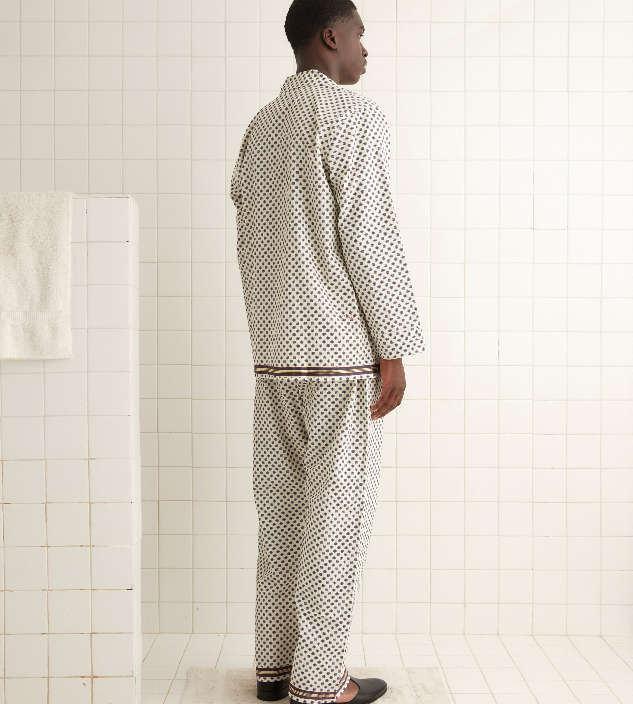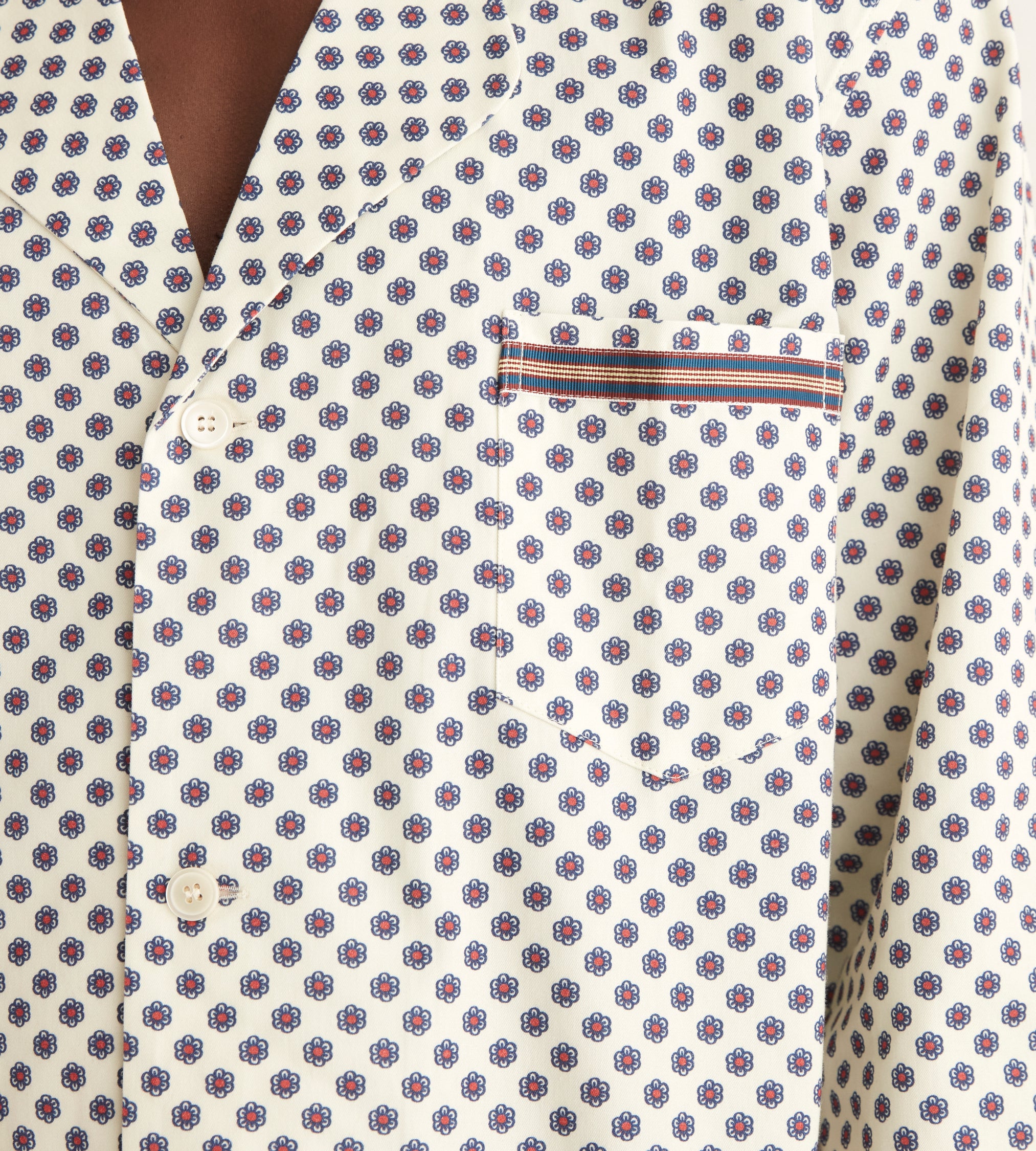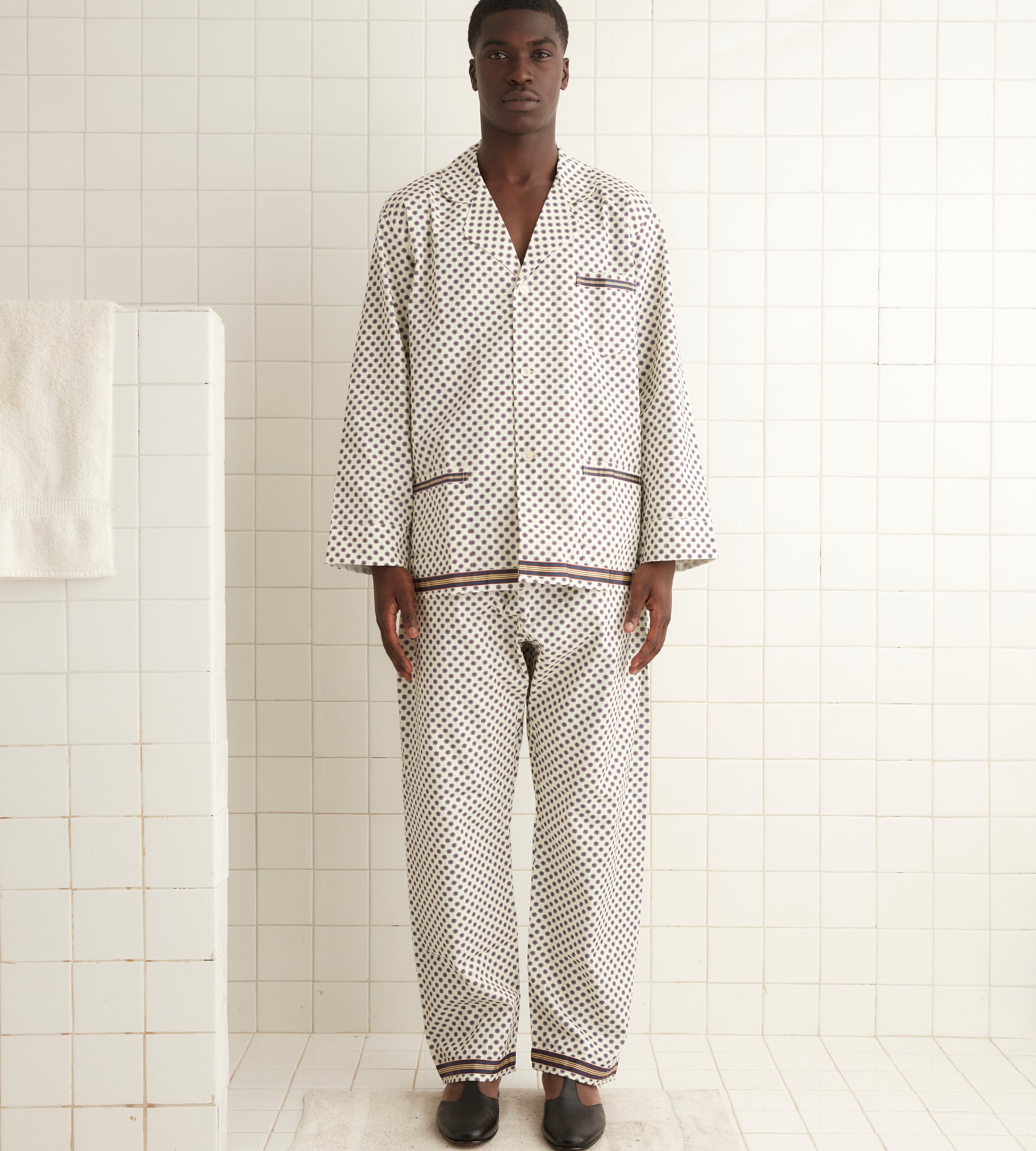 This shirt is inspired by a vintage bedsheet with a ribbon appliqué, circa 1940s. We reproduced the original, small-print pattern for this style, which is cut in reference to a classic men’s pajama silhouette.