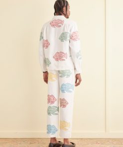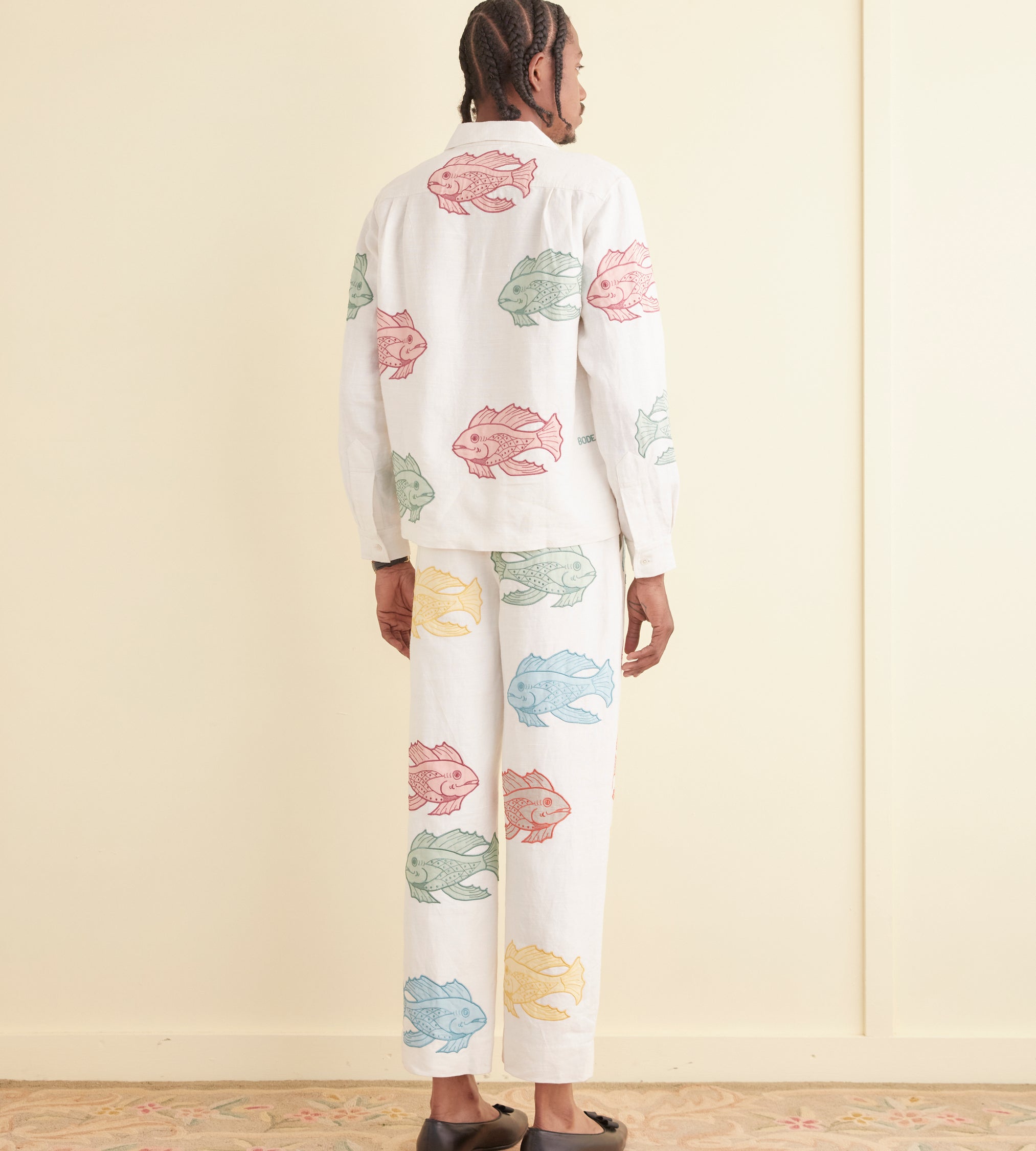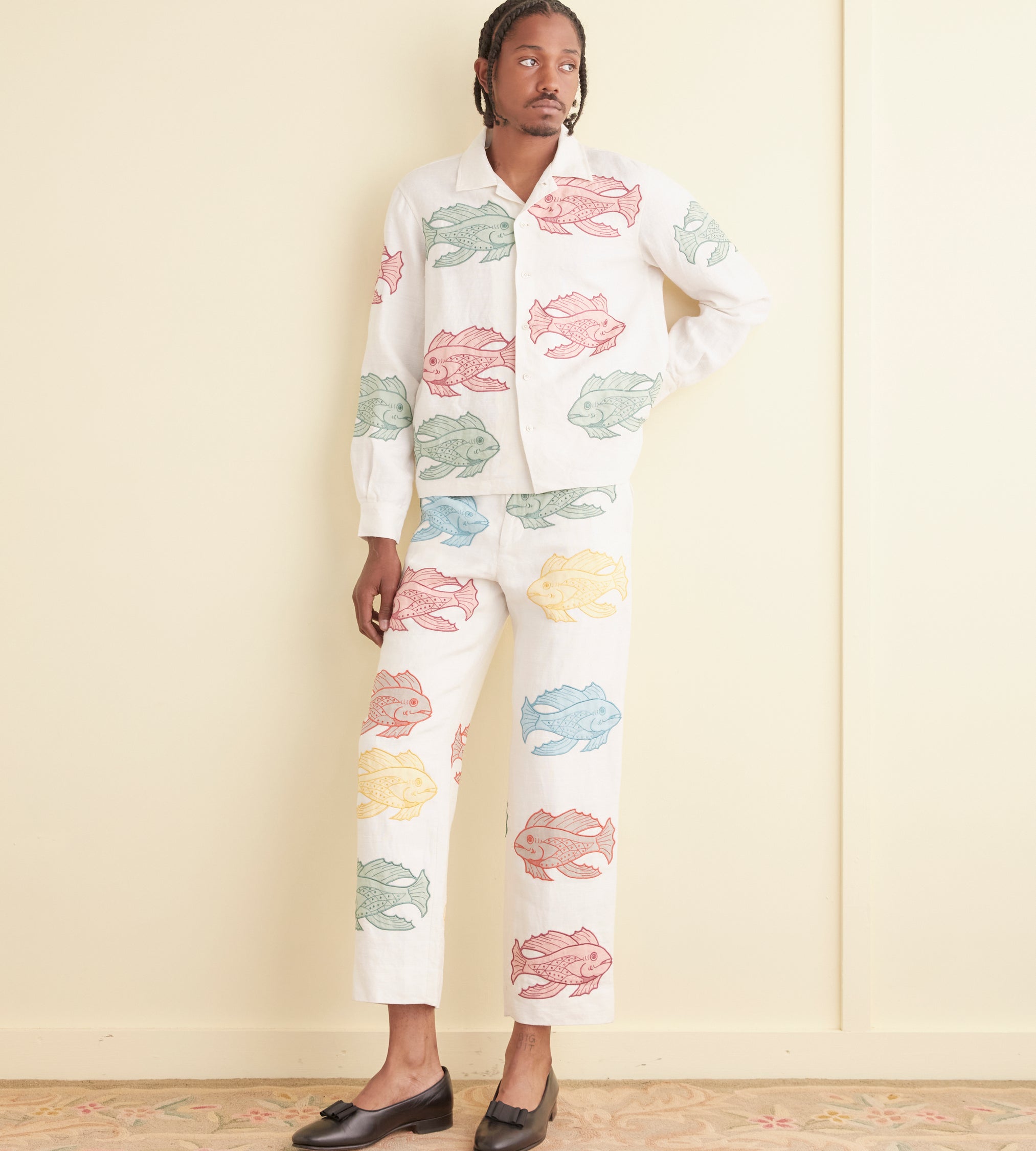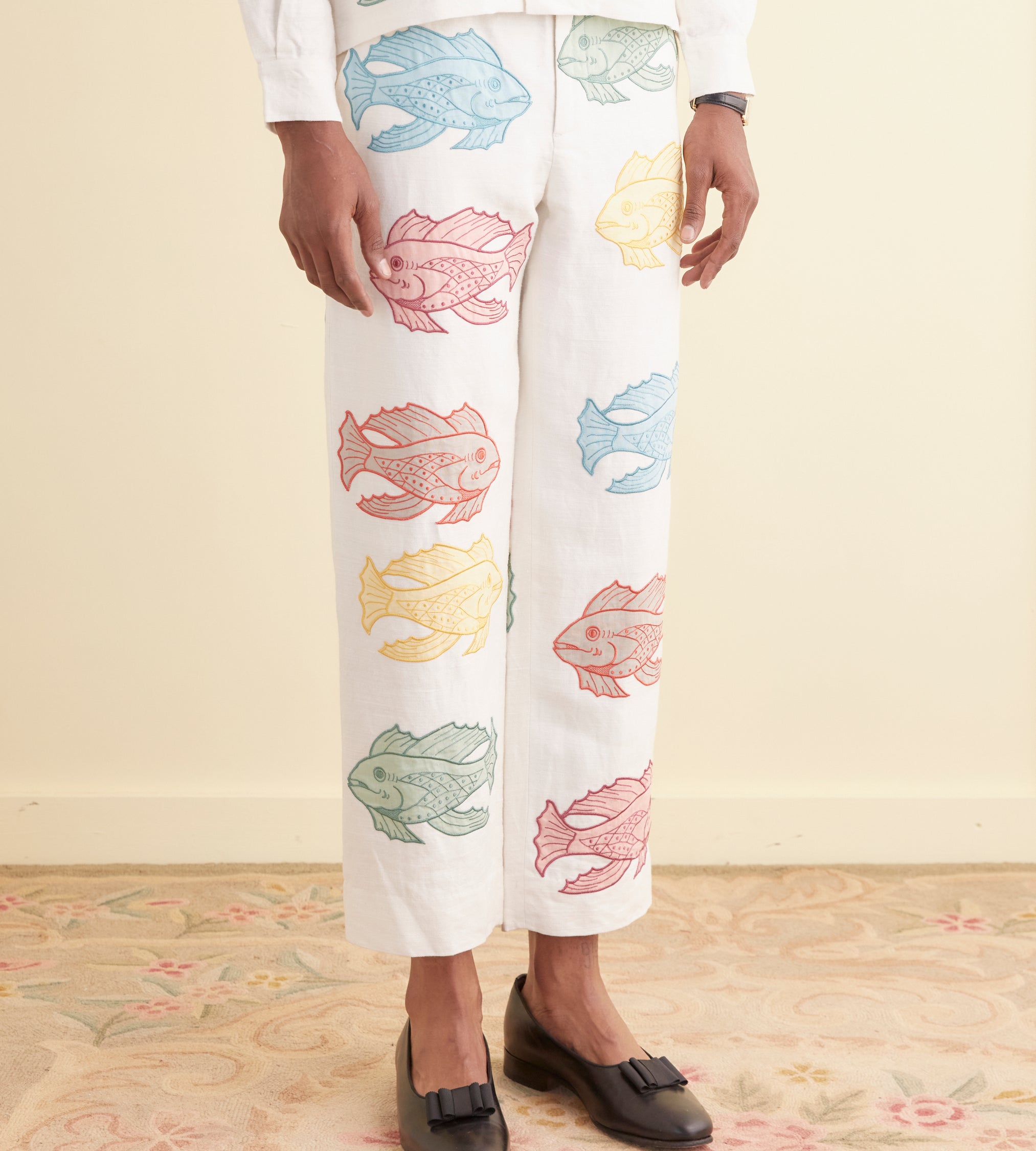These trousers are inspired by novelty fish coasters from the 1980s, which came in six different colors. We created patches based off the original design and appliquéd them onto this style. The trousers have a mid-rise and a straight leg.