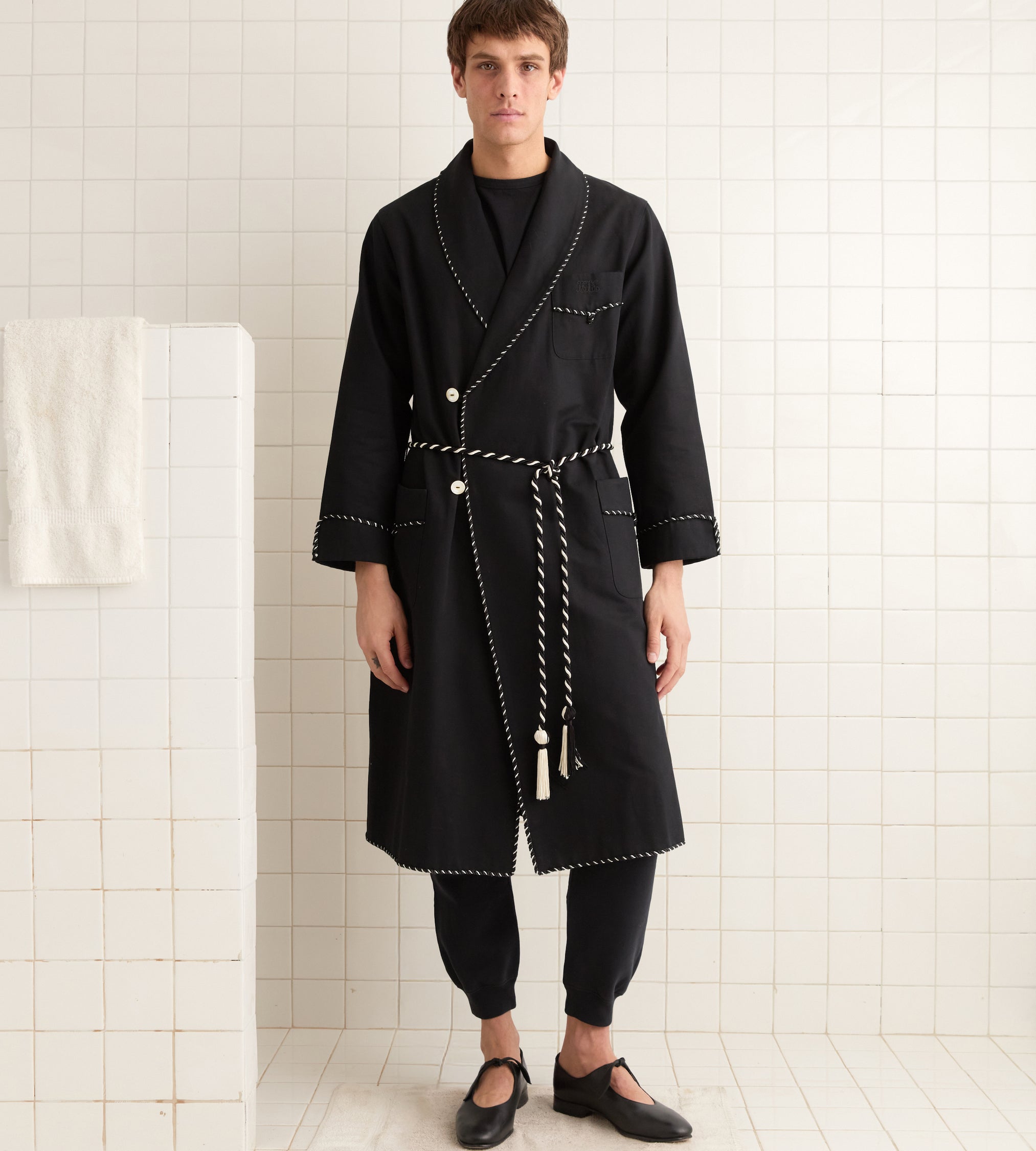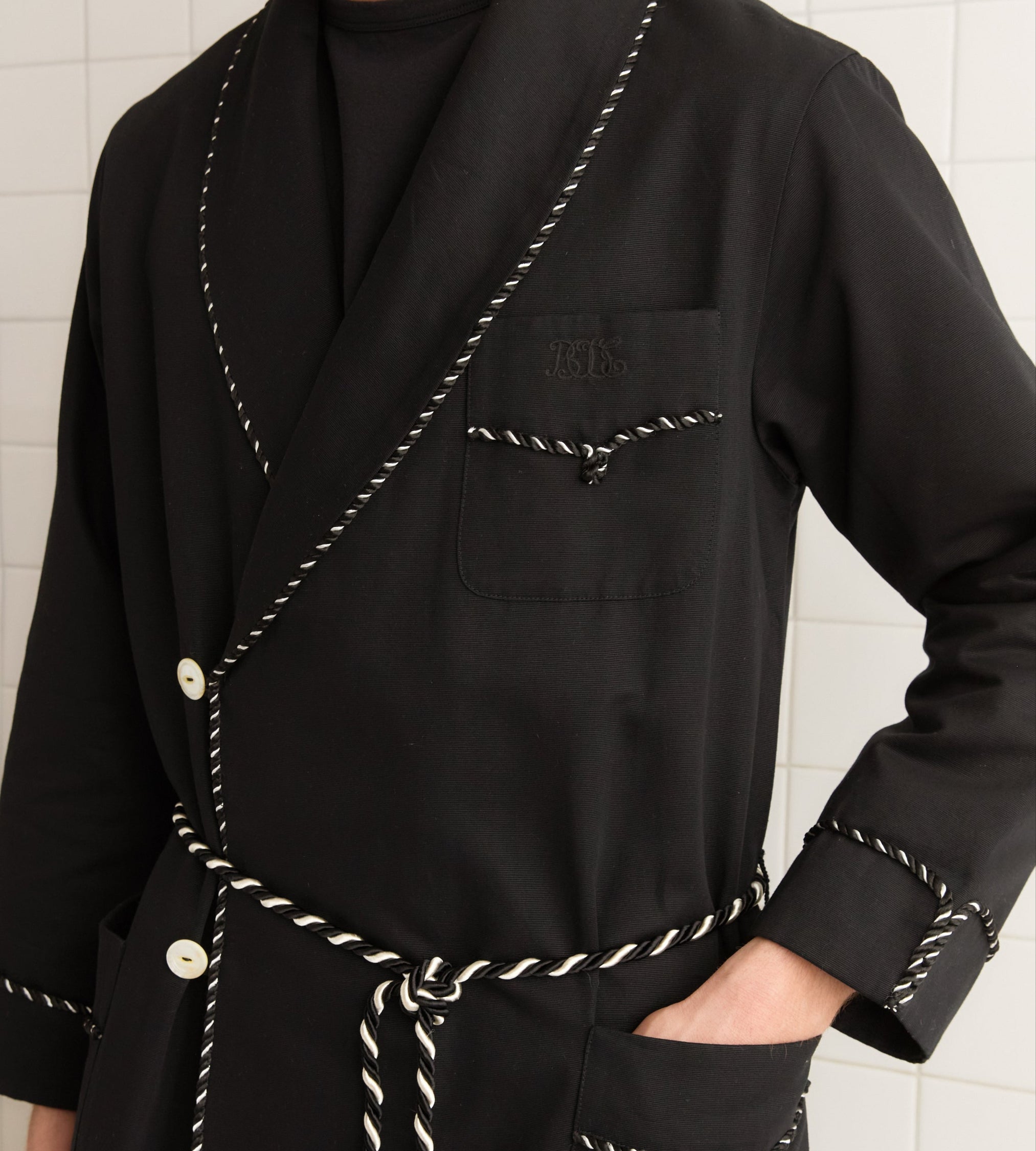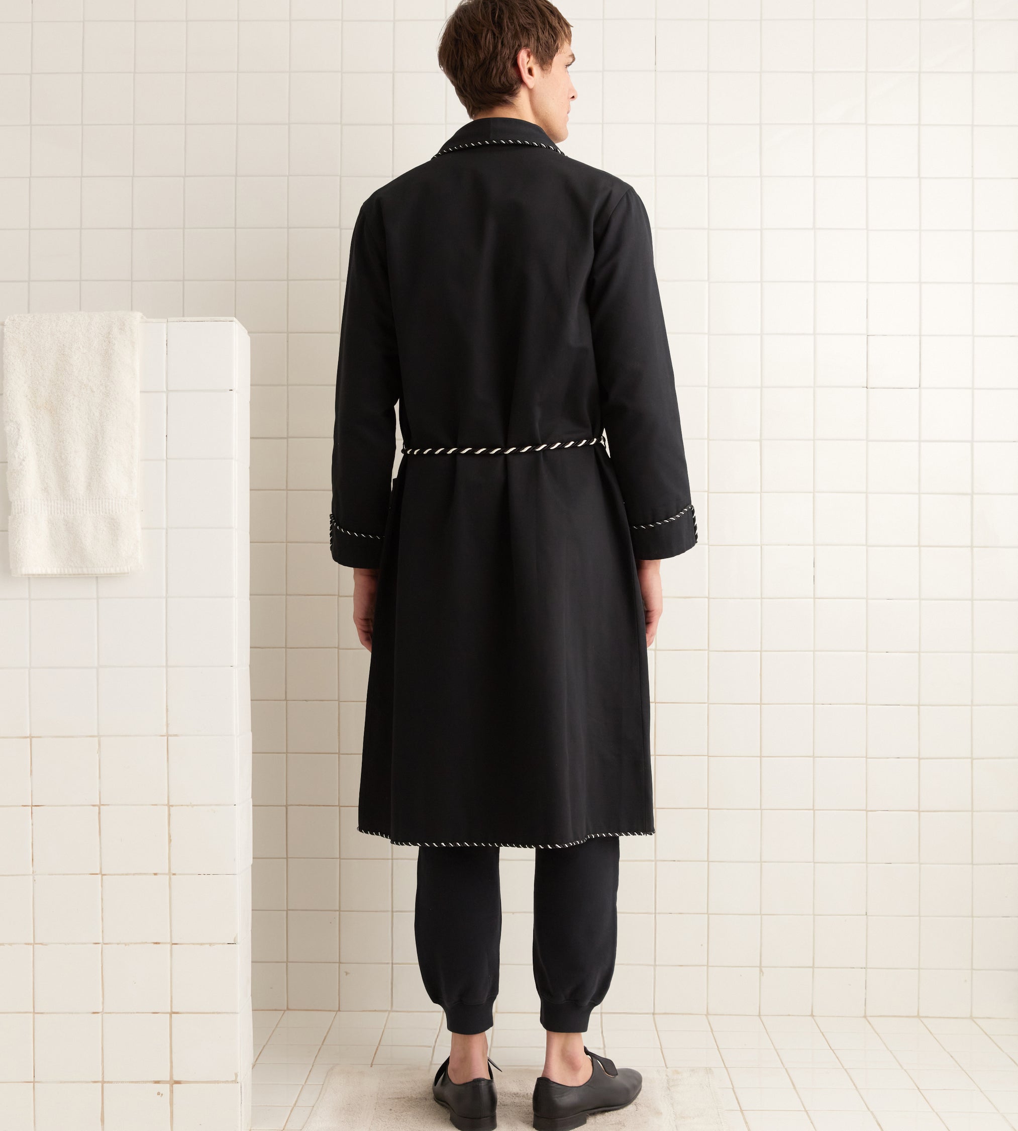 This coat is inspired by a boxer’s robe from the late 20th century. We reproduced the silhouette in black cotton twill with black-and-white roping details.