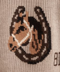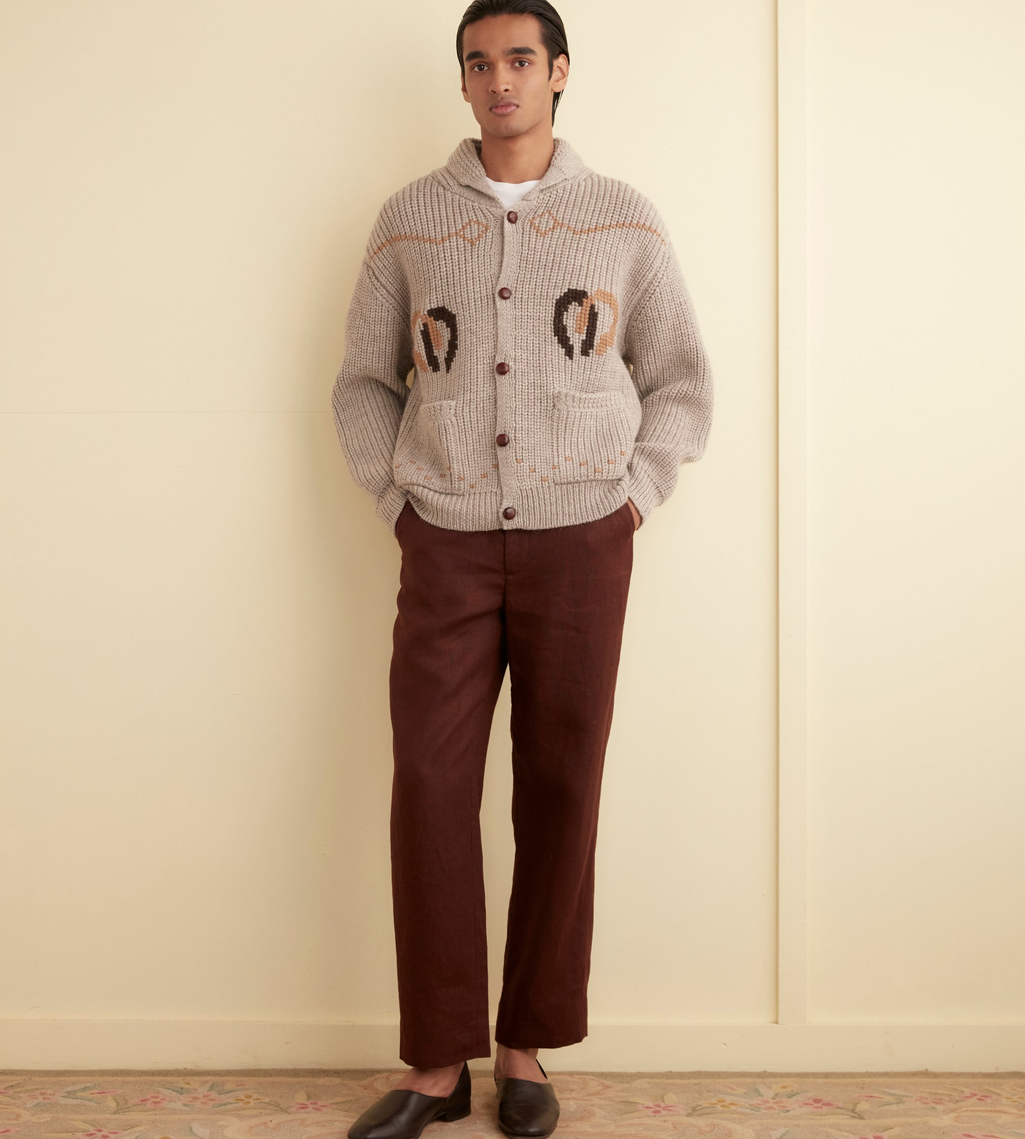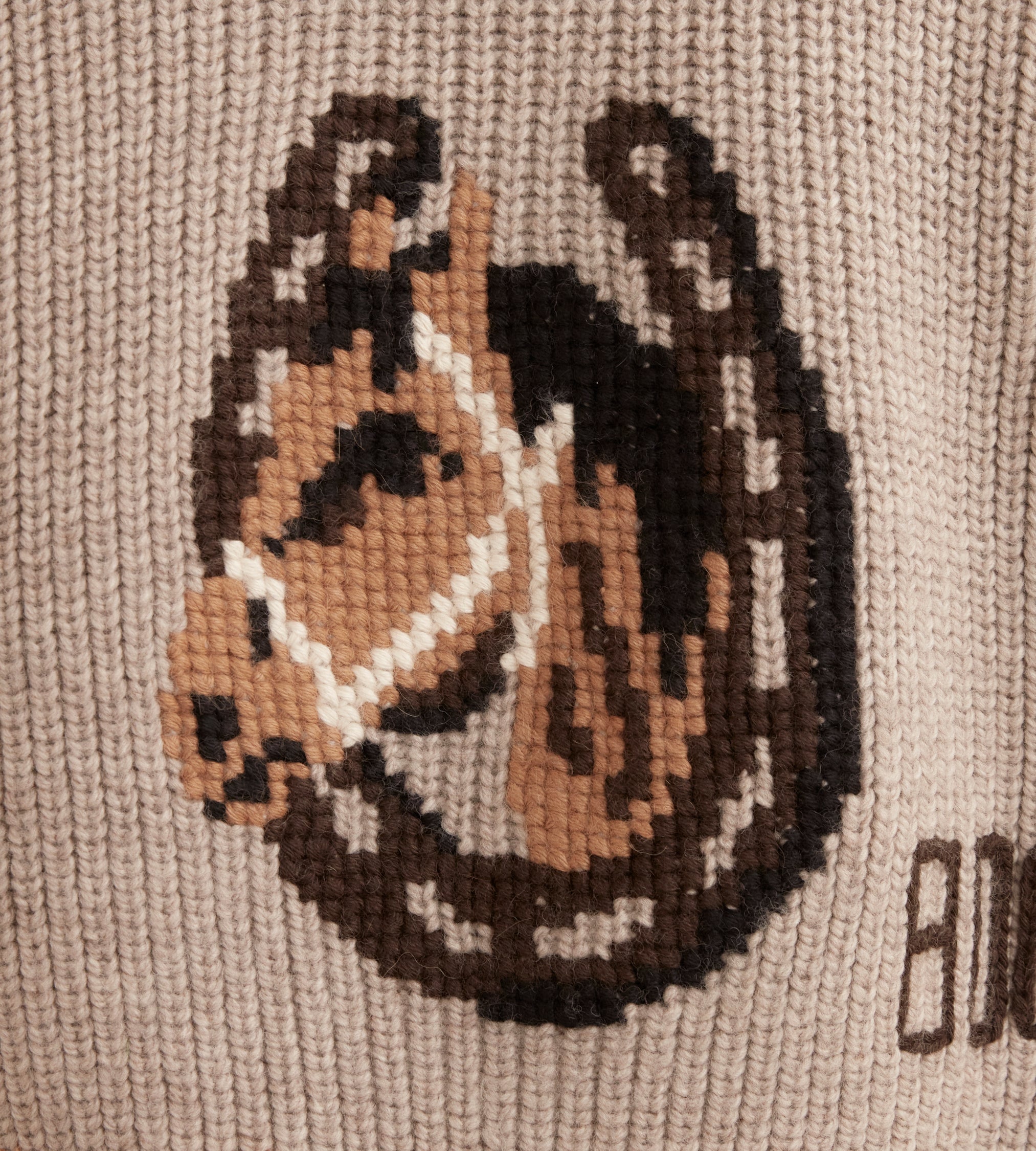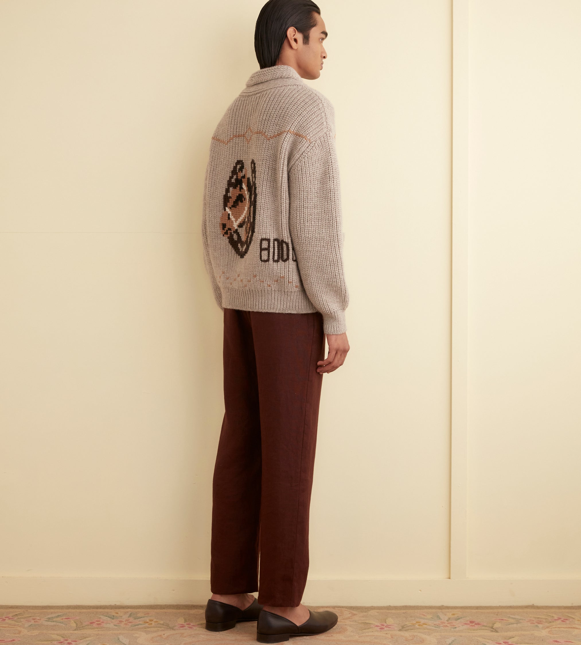 This cardigan is inspired by a sweater from the 1970s. We reproduced the graphics—a horse and horseshoe motifs—on this Shaker-knit sweater. The cardigan has a shawl collar and woven leather buttons.