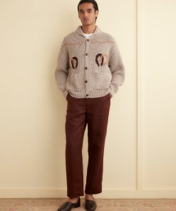 This cardigan is inspired by a sweater from the 1970s. We reproduced the graphics—a horse and horseshoe motifs—on this Shaker-knit sweater. The cardigan has a shawl collar and woven leather buttons.