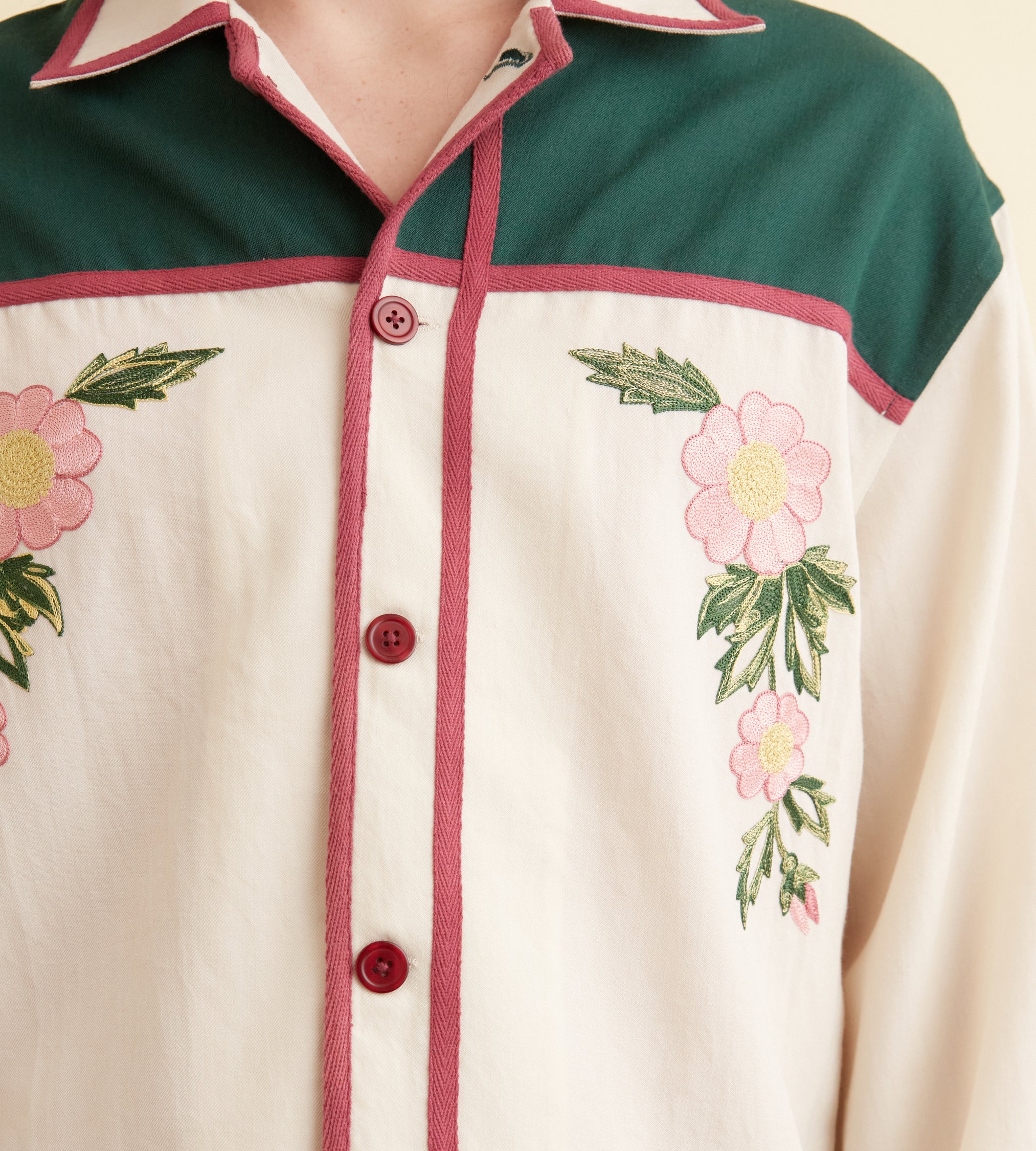 This shirt is inspired by a 1960s Western shirt. We reproduced the contrast yoke, chain-stitched roses, and red trim of the original for this style. The shirt has a curved hem and an embroidered “Bode” on the back.