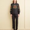 This shirt is inspired by a 1960s Western shirt. We reproduced the contrast yoke, chain-stitched roses, and red trim of the original for this style. The shirt has a curved hem and an embroidered “Bode” on the back.