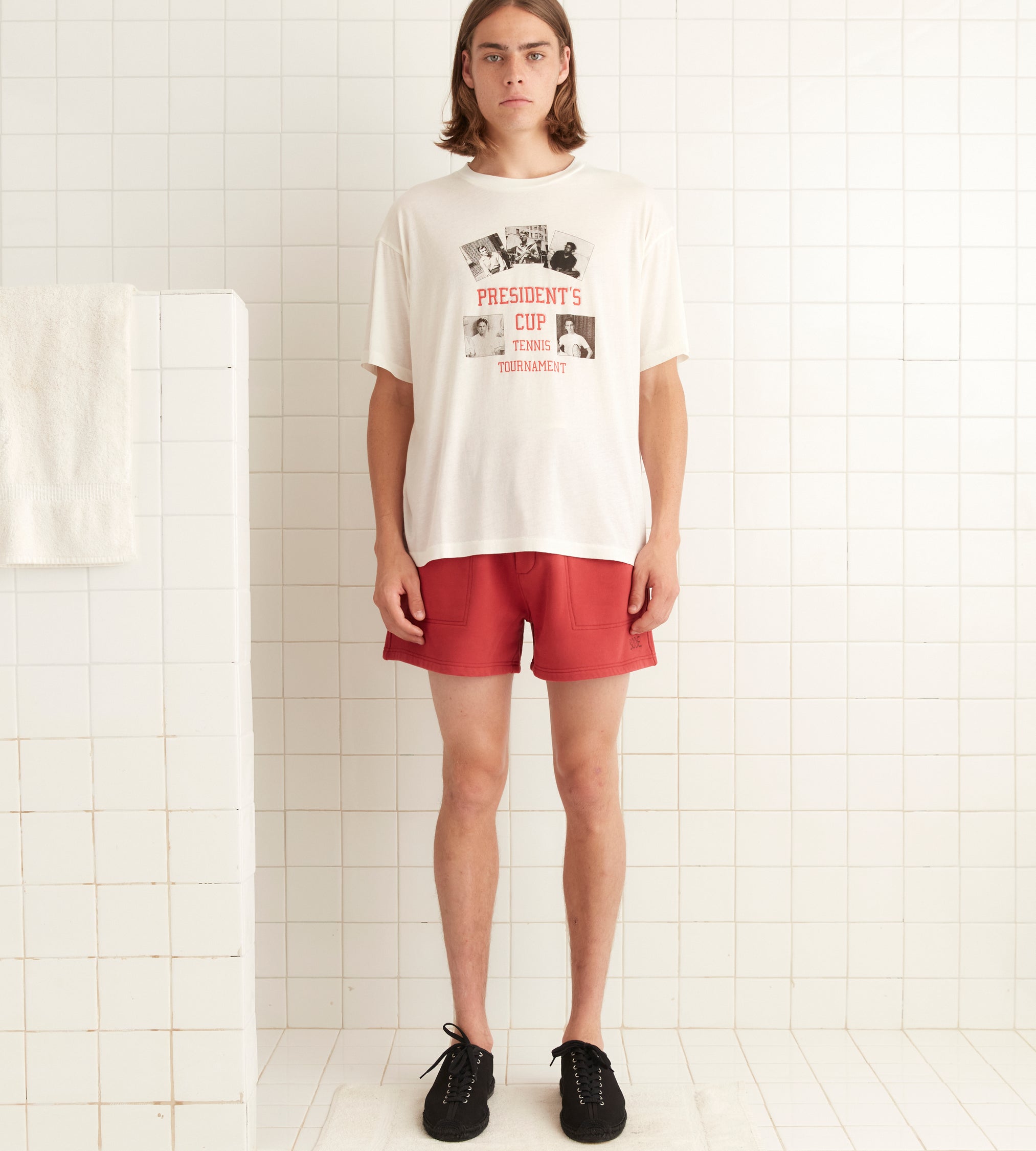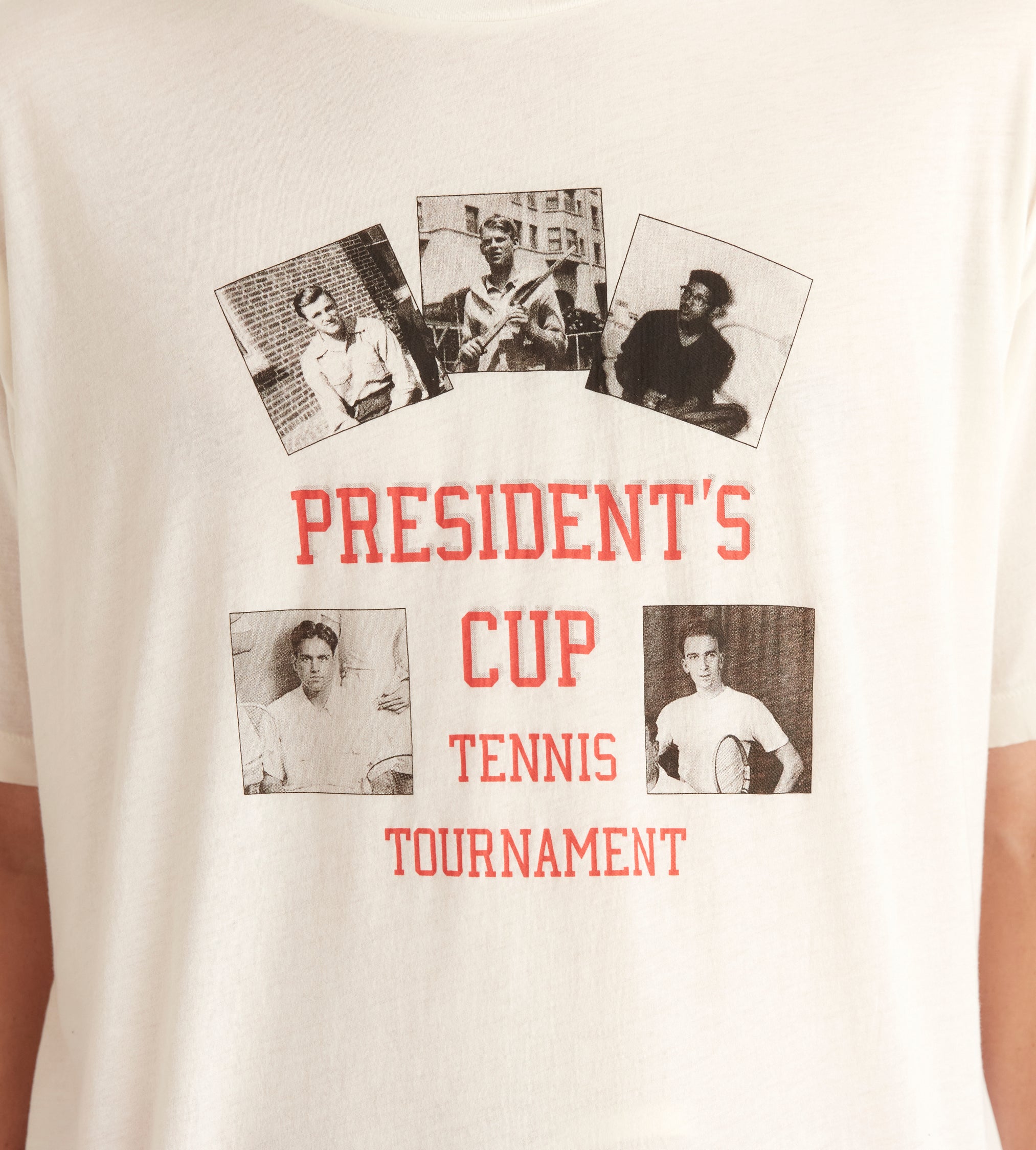 This shirt is inspired by a tennis tournament tee from the late 20th century. We reproduced the print with antique photographs of tennis players. The tee is made from vintage-weight, slightly sheer cotton.