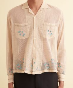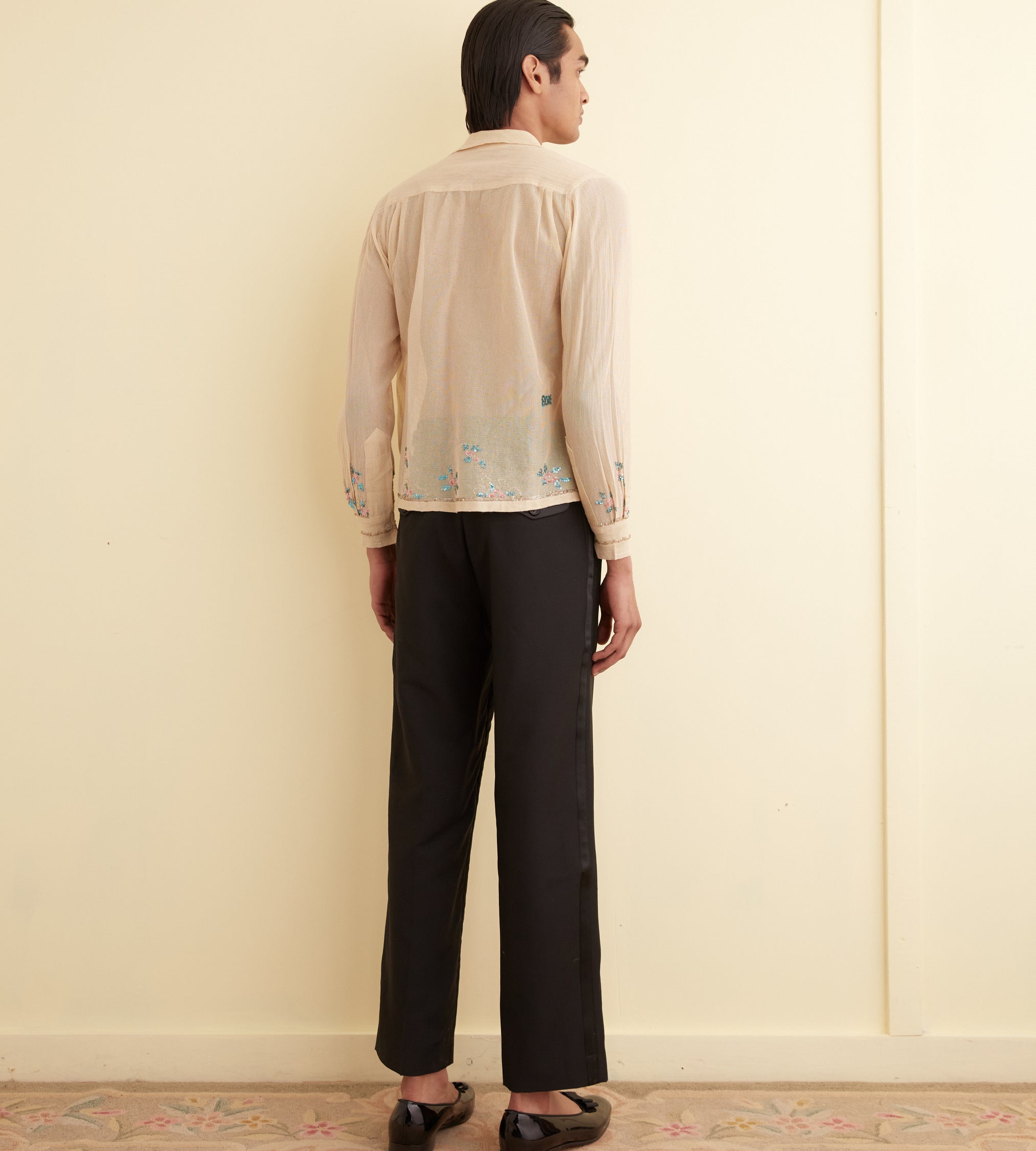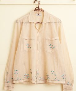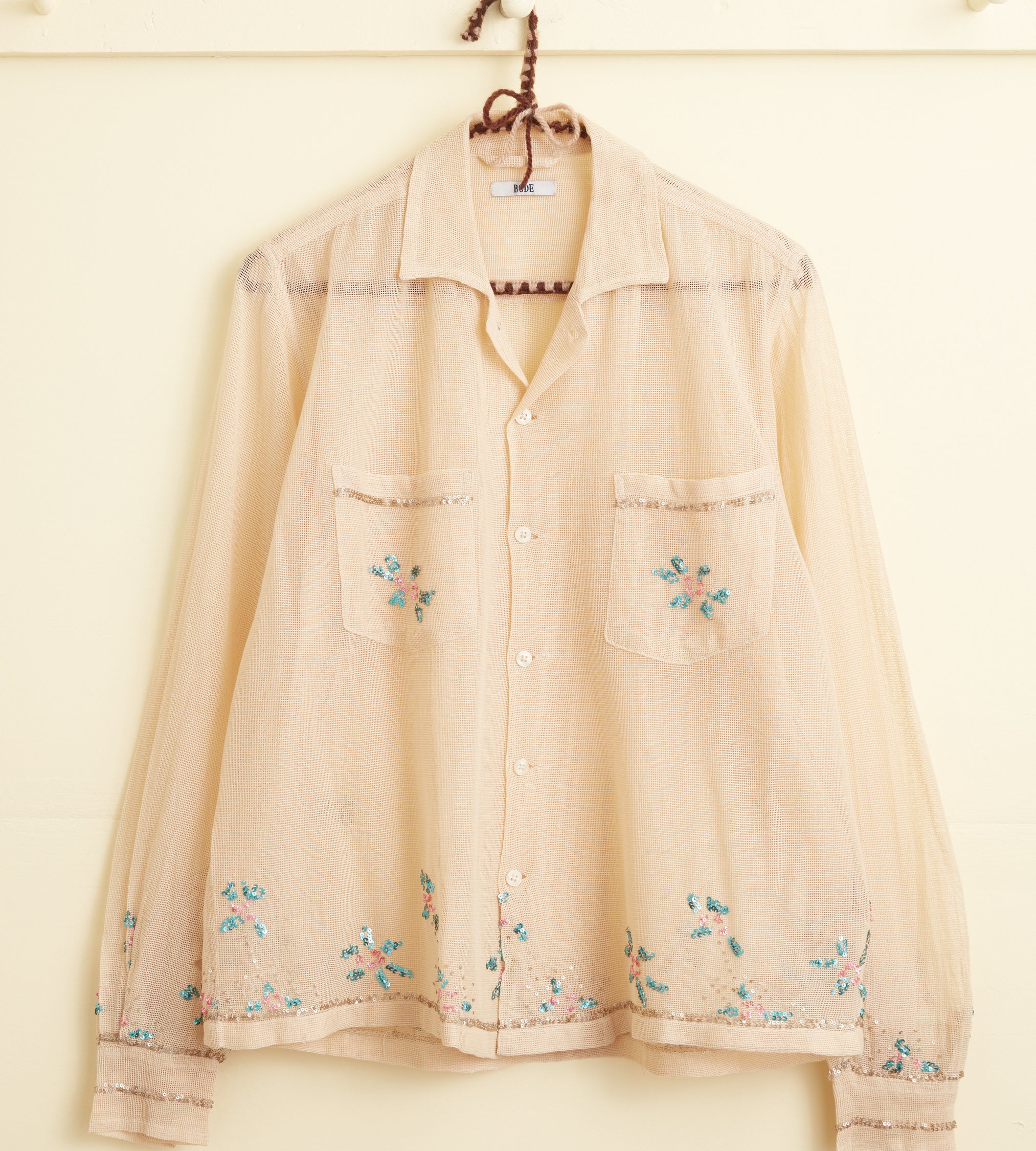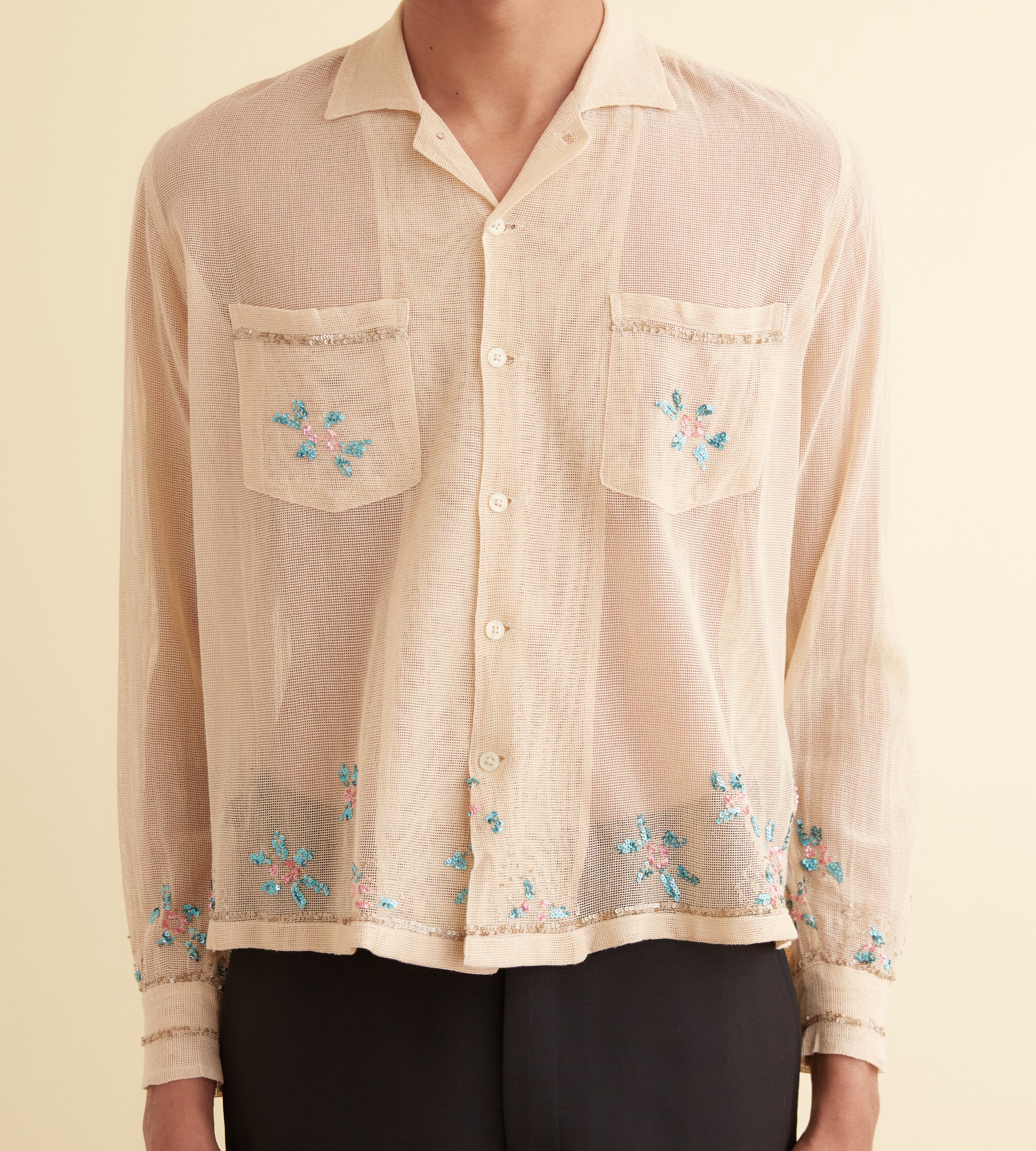 This long sleeve shirt is inspired by a remnant of a 1920s trim remnant. The shimmering appliqué flower design is a faithful reproduction of the trim remnant sourced in France.