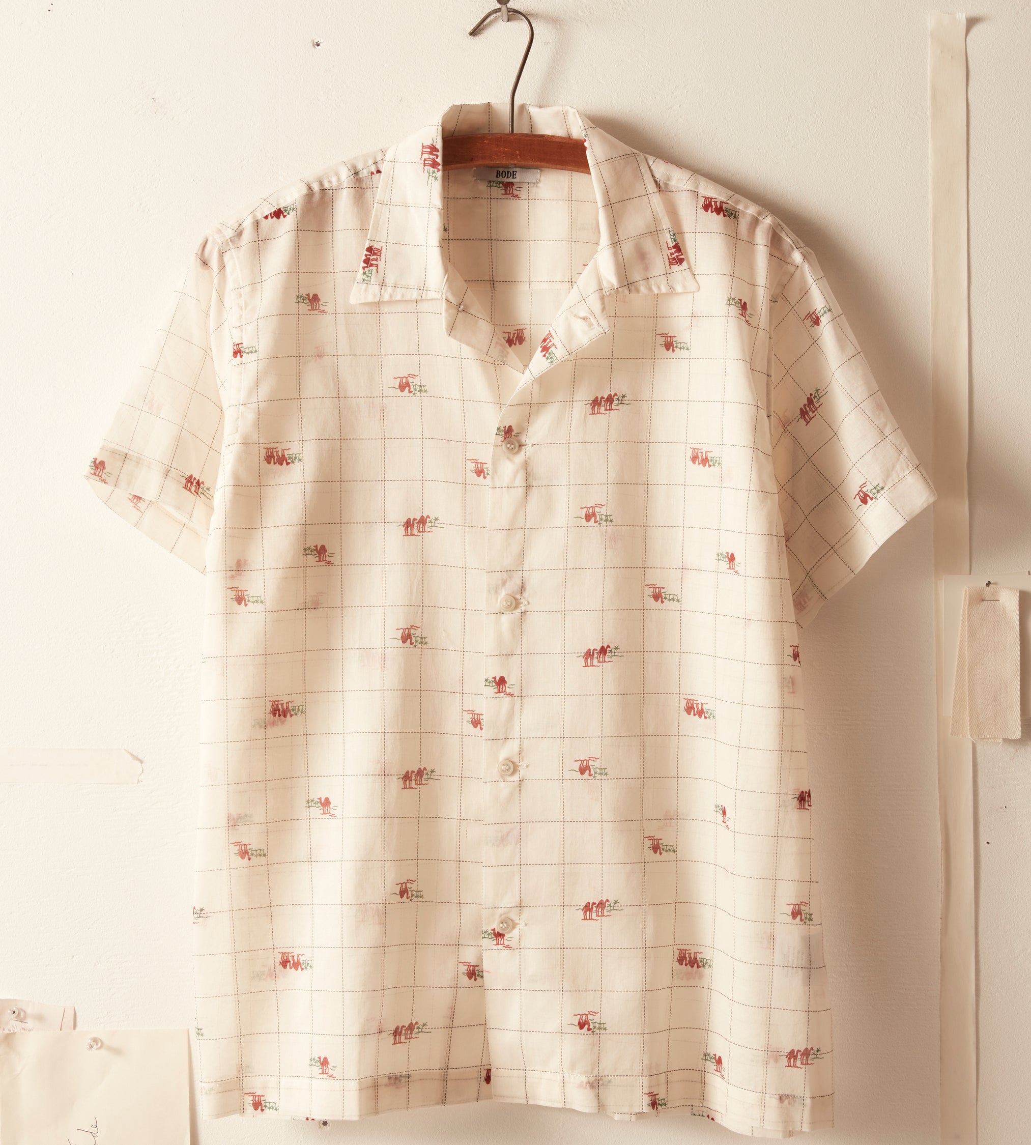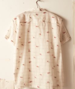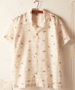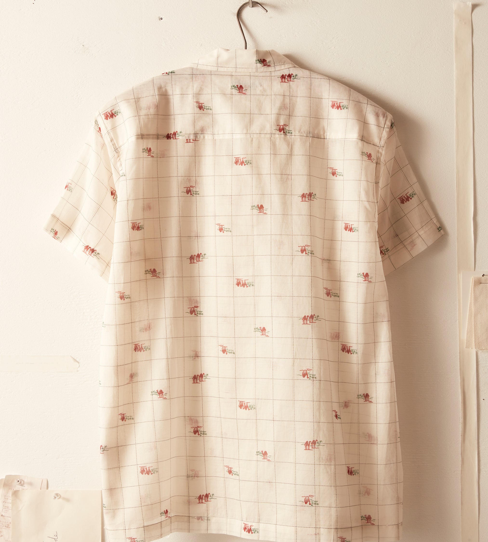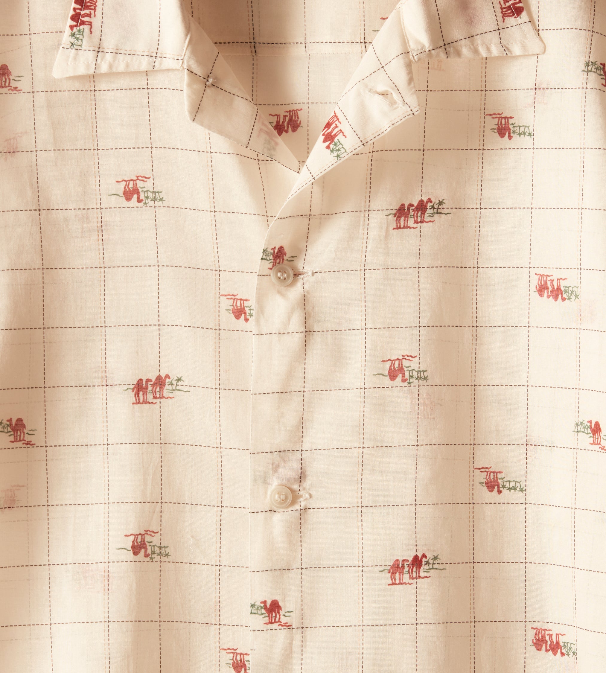 This shirt is inspired by novelty fabric from the 1960s. The original pattern—an ecru grid pattern with camel illustrations—has been faithfully reproduced here in a lightly sheer fabric.