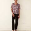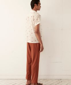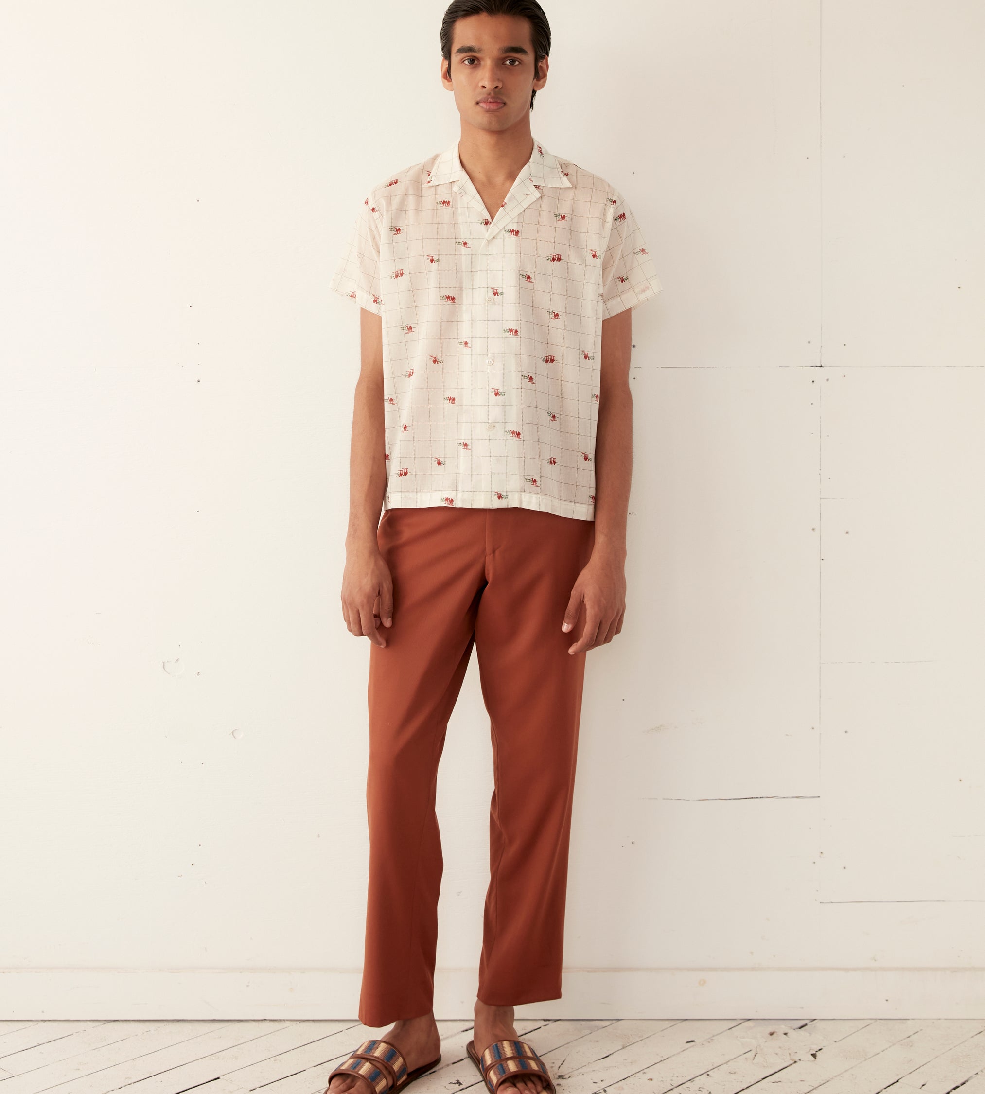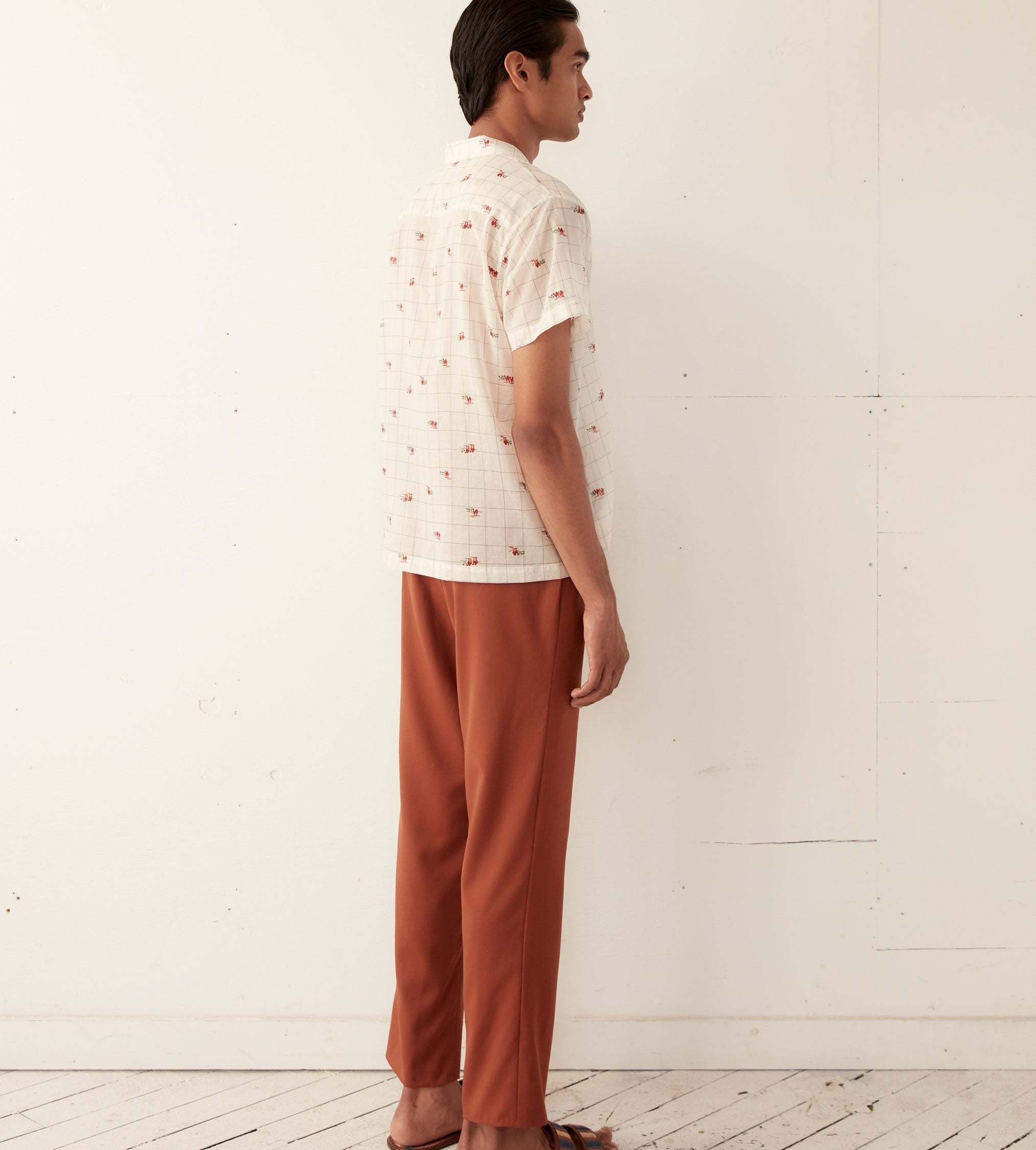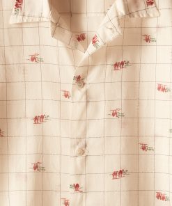 This shirt is inspired by novelty fabric from the 1960s. The original pattern—an ecru grid pattern with camel illustrations—has been faithfully reproduced here in a lightly sheer fabric.