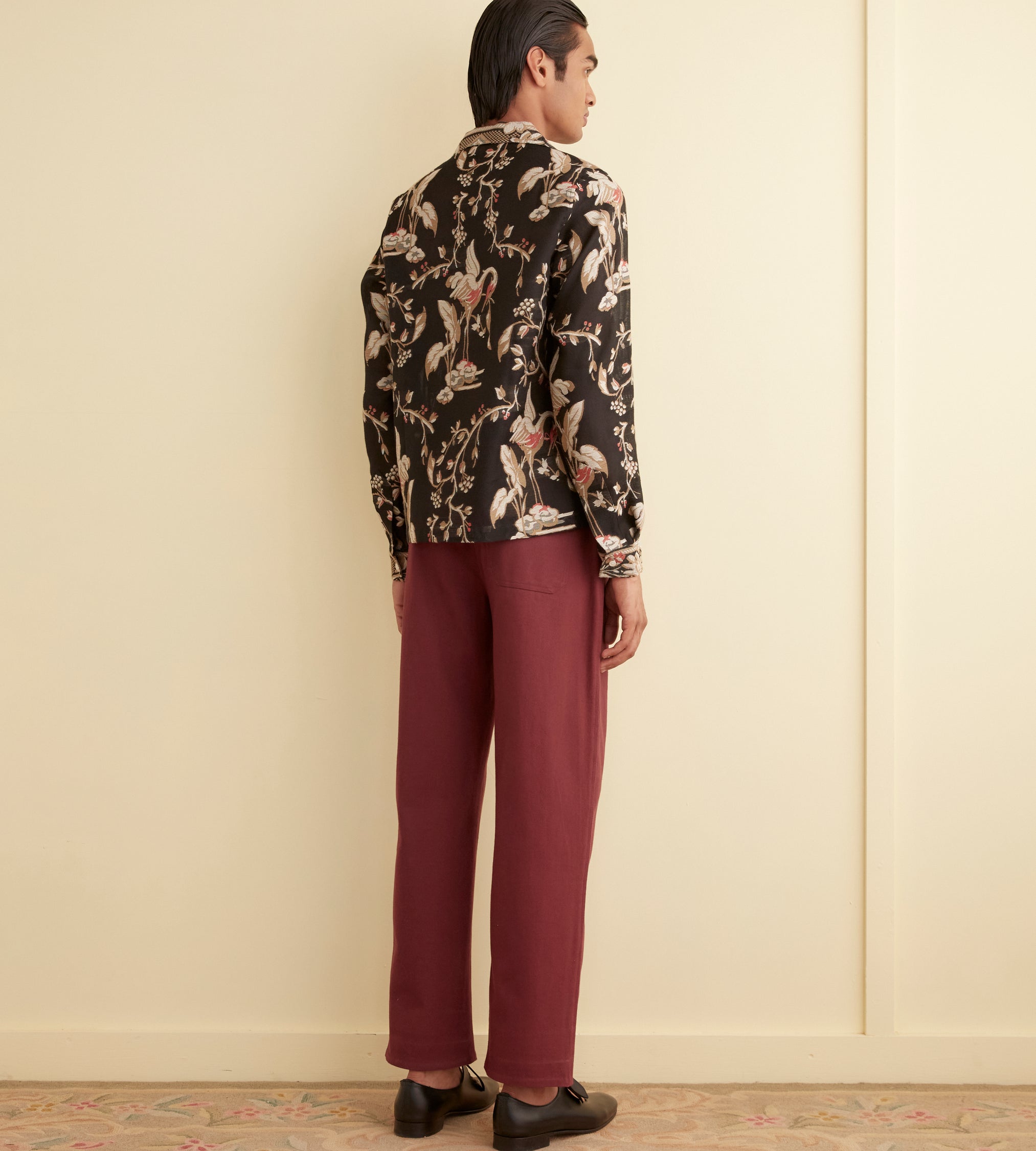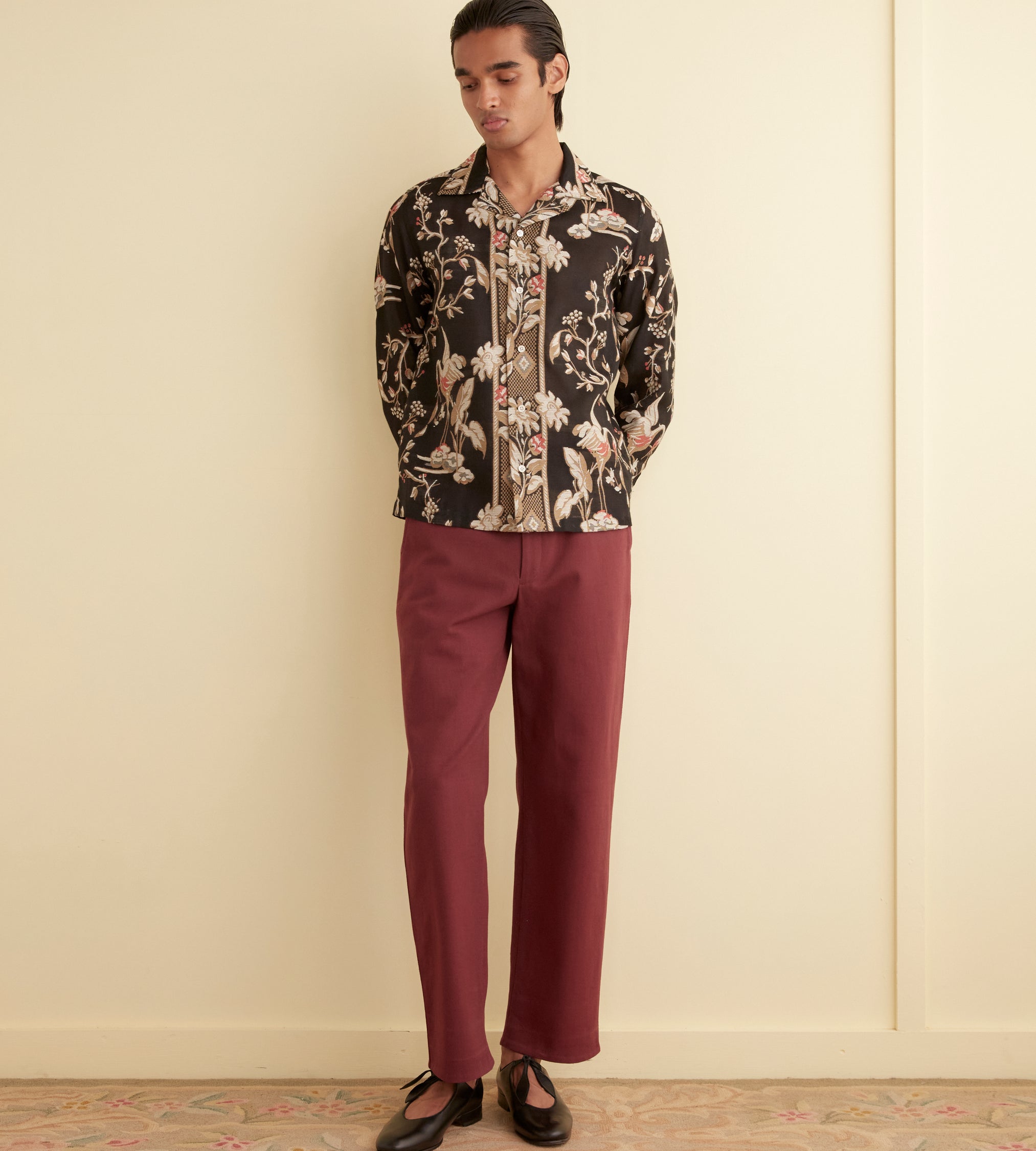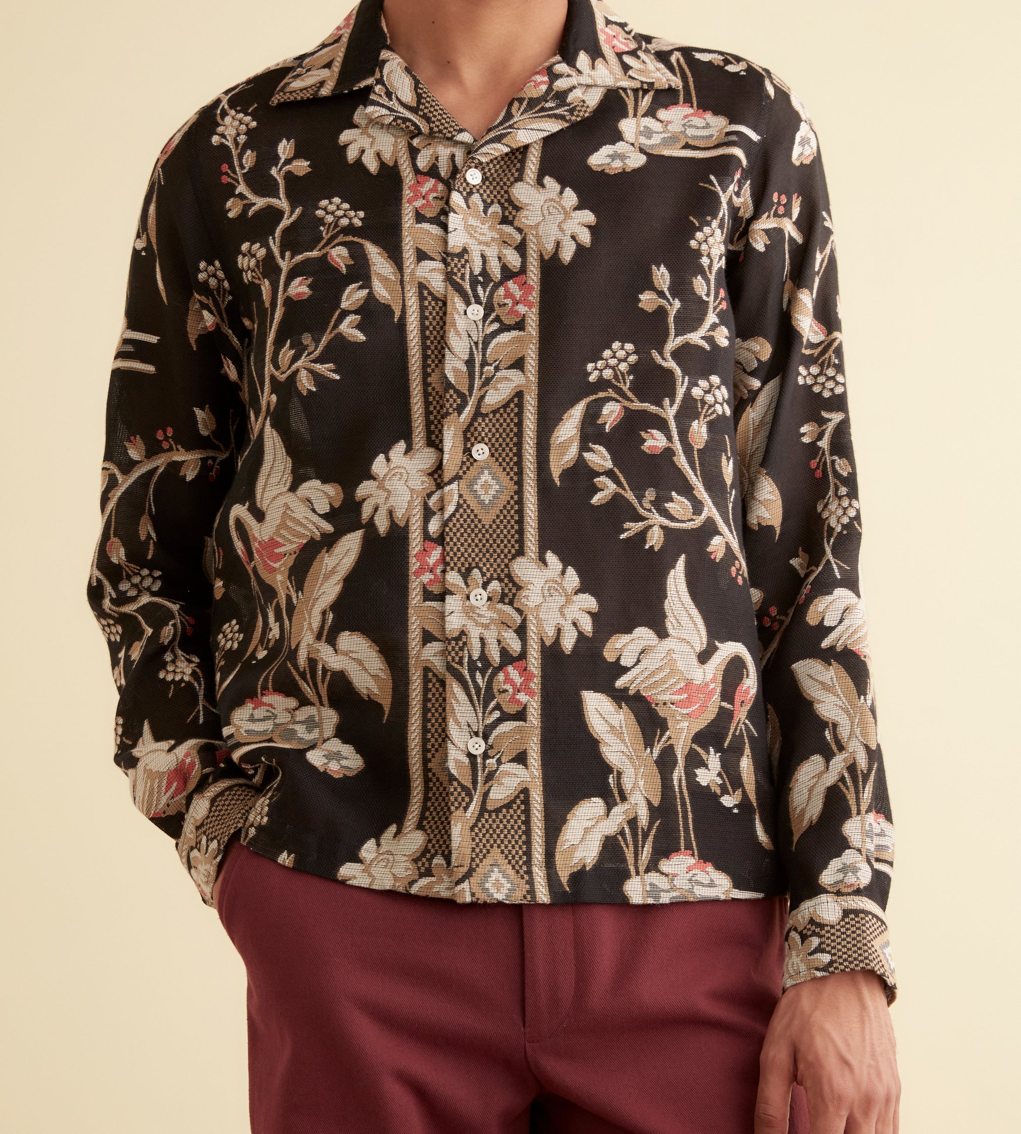 This shirt is inspired by a 1940s tablecloth. We reproduced the pattern—cranes and flowers woven in cream, coral, and bronze—on cotton for this style. The shirt has a heavy handfeel and is ever-so-slightly sheer. Available in long and short sleeve.
