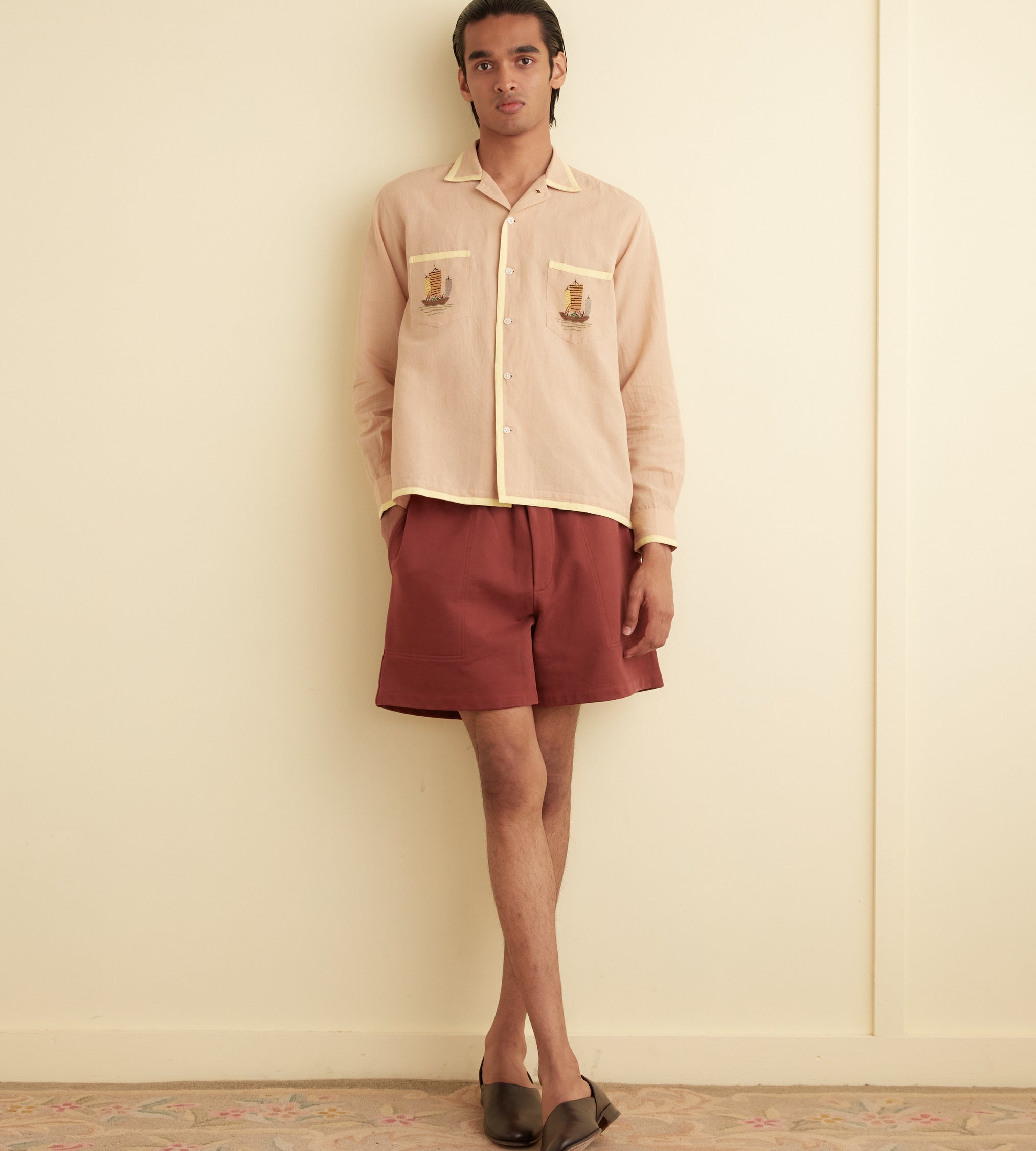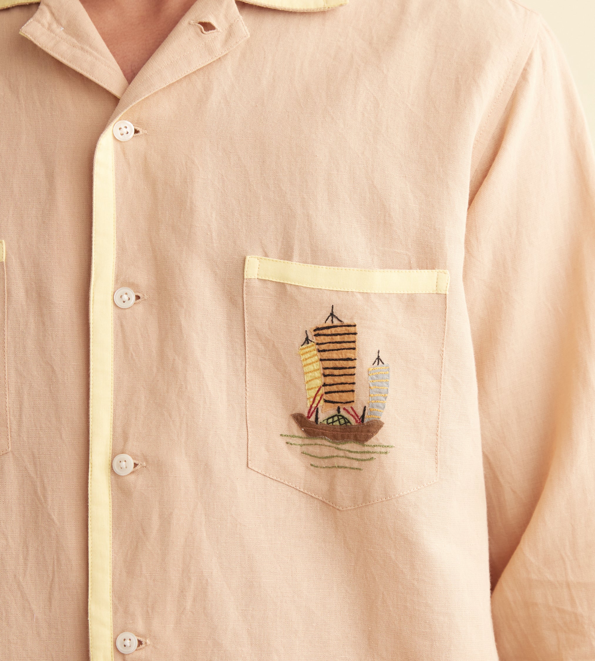 This shirt is inspired by a souvenir bag from the 1930s-1950s. The original bag featured the ship appliqué and contrast bias tape, both of which are reproduced here. Each piece of the appliqué is hand-cut and hand-applied.
