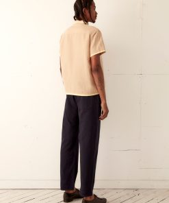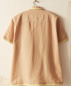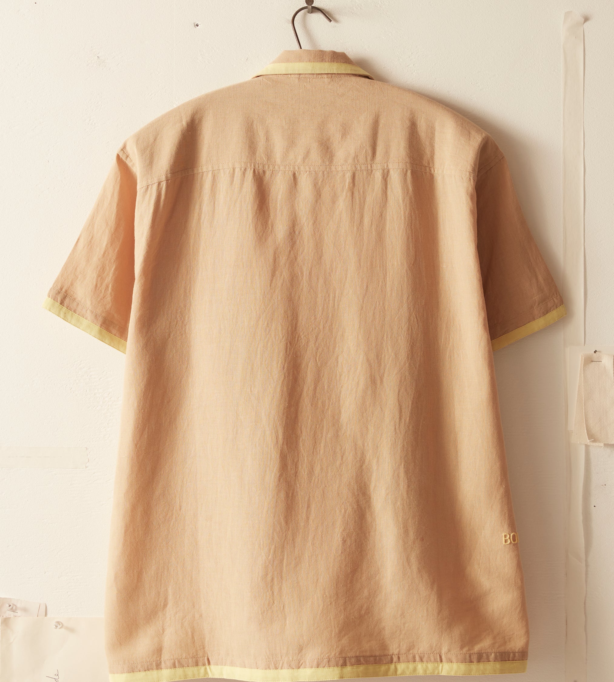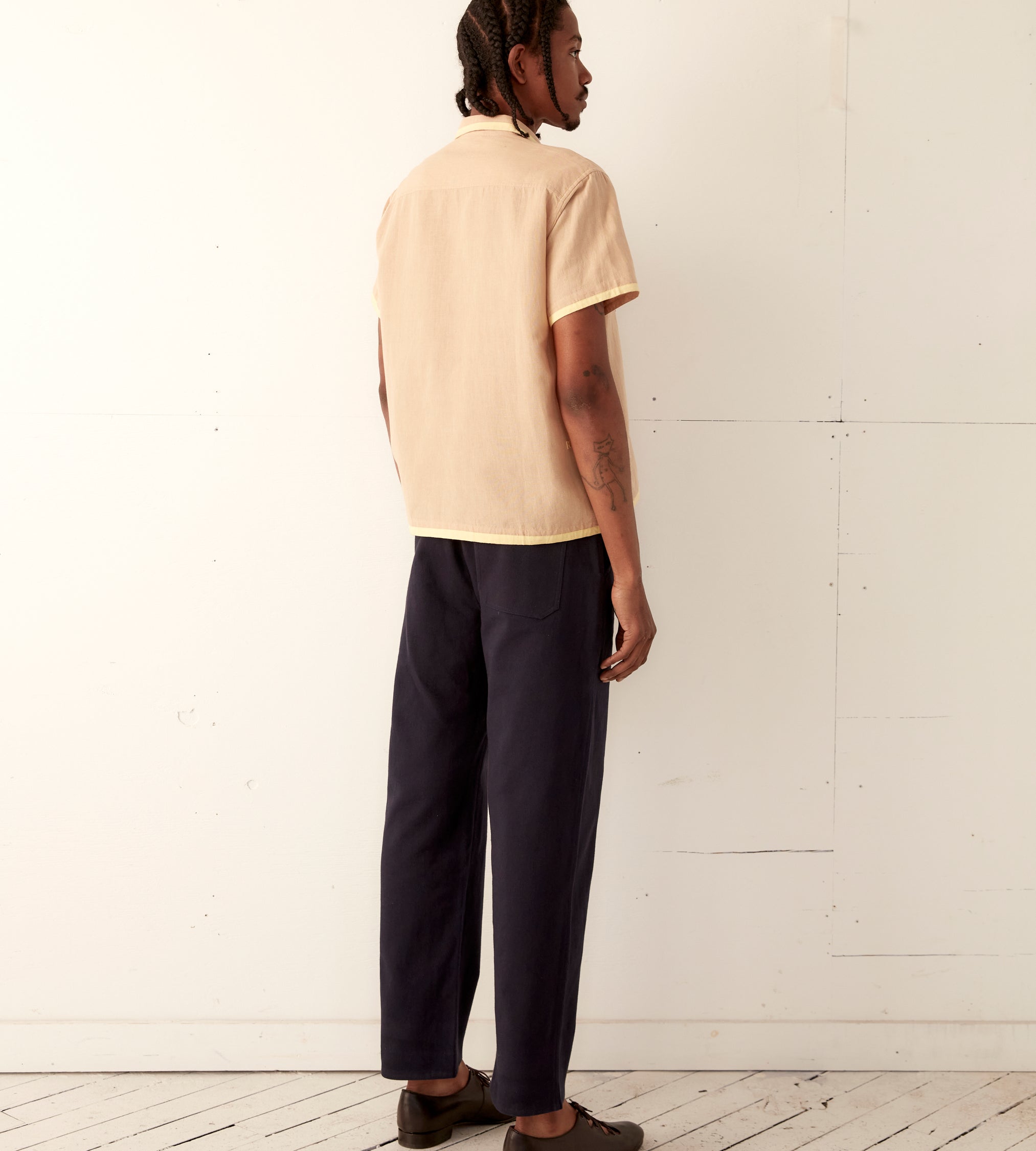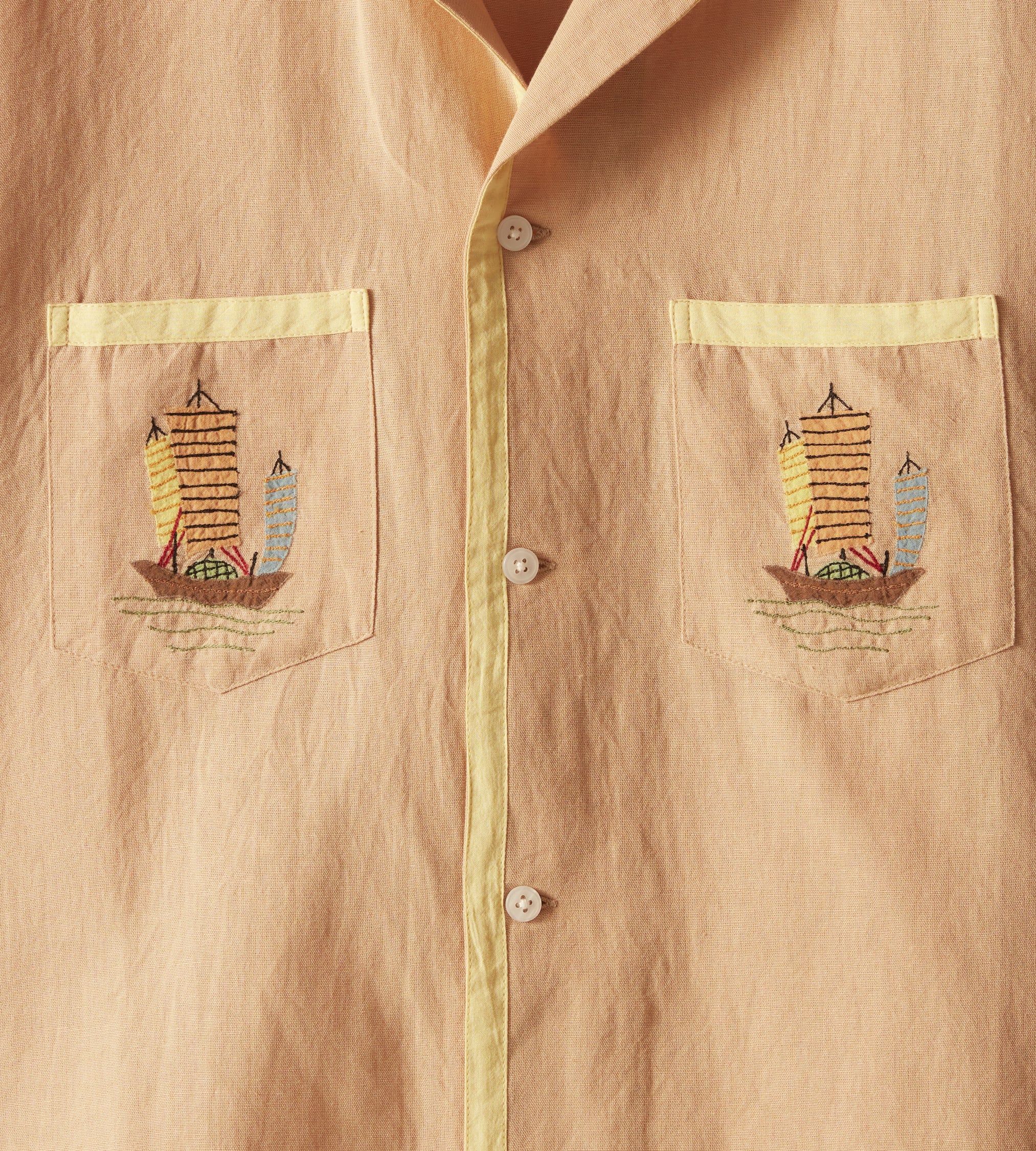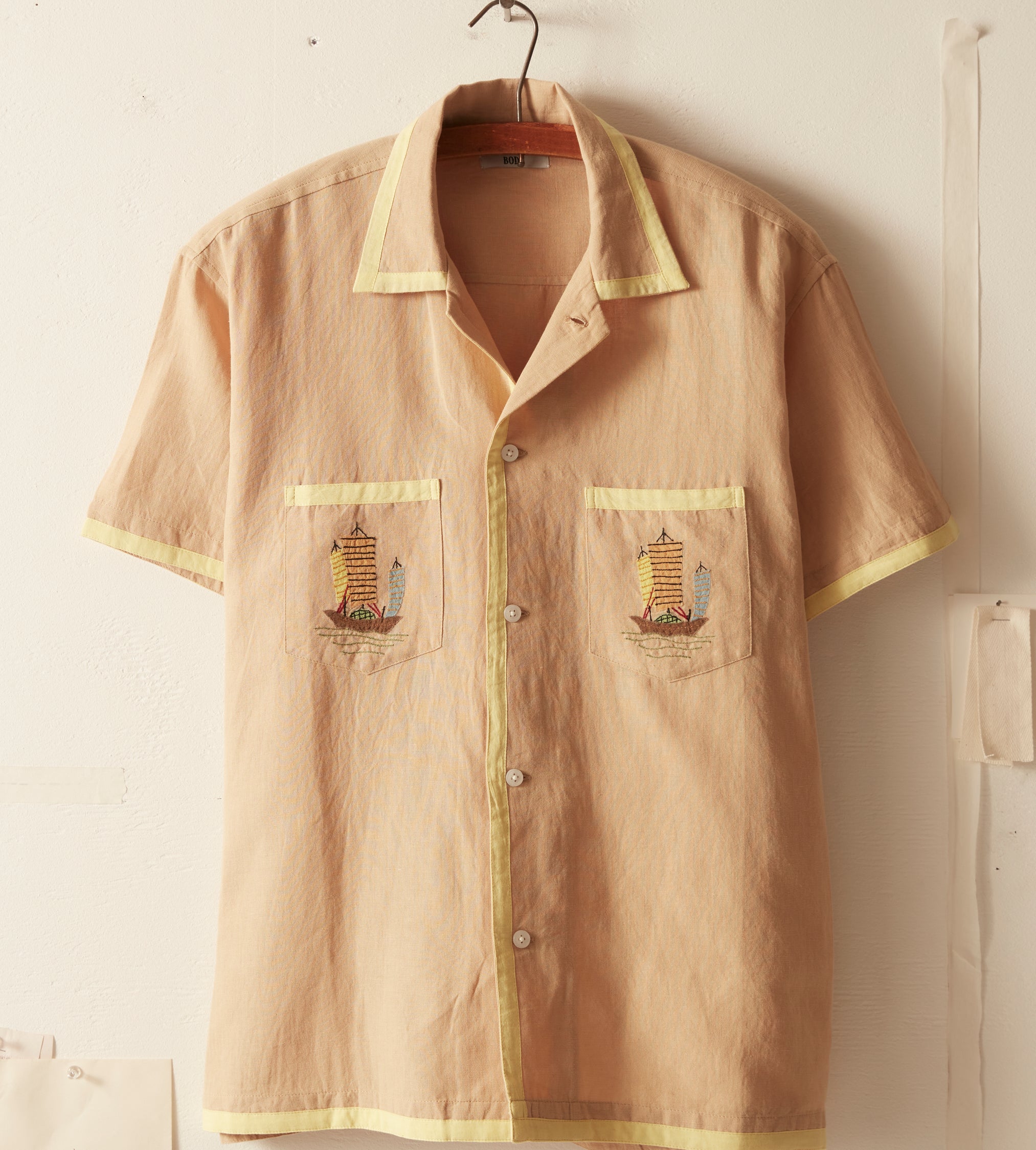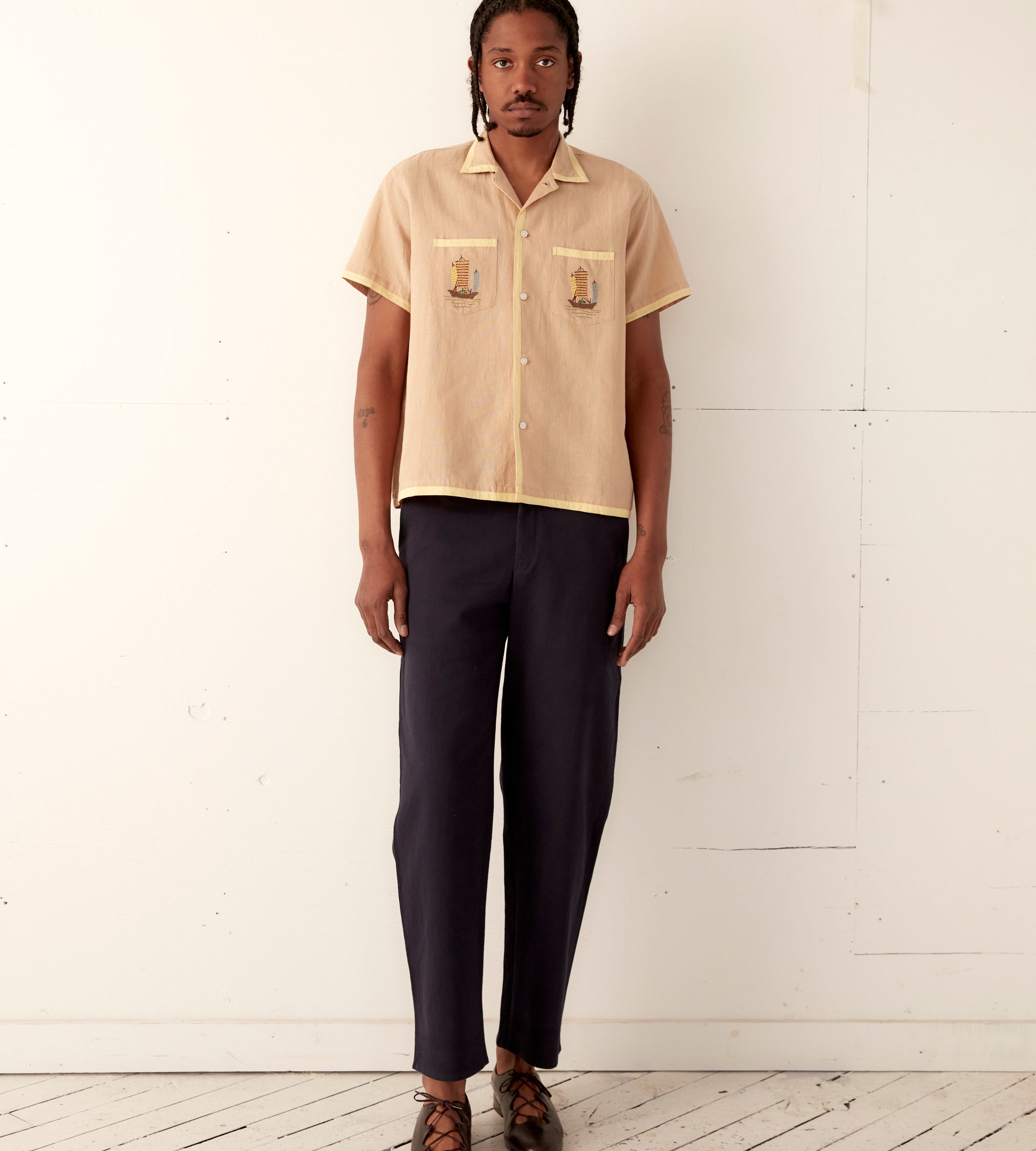 This shirt is inspired by a souvenir bag from the 1930s-1950s. The original bag featured the ship appliqué and contrast bias tape, both of which are reproduced here. Each piece of the appliqué is hand-cut and hand-applied.