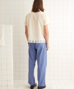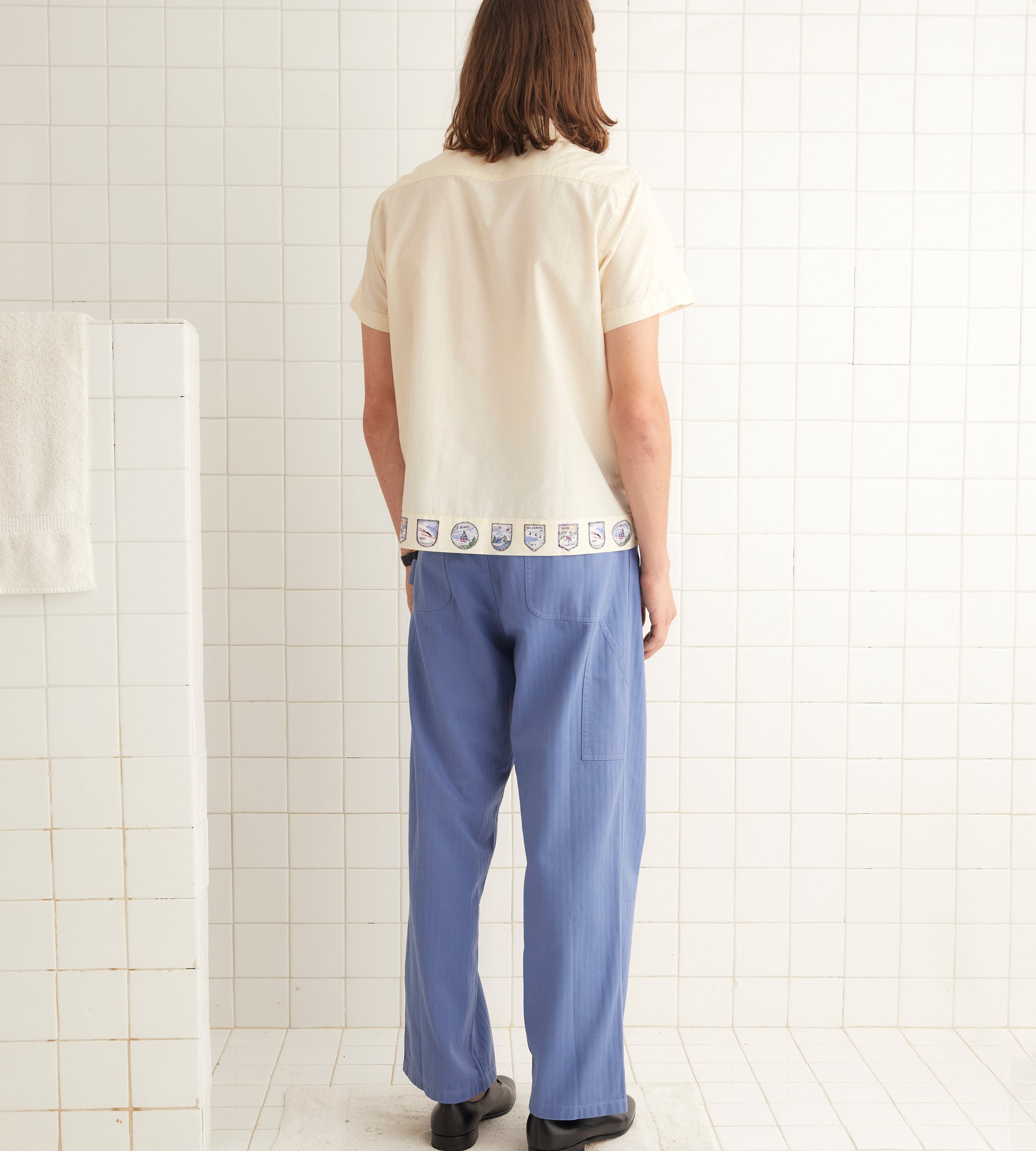 This shirt is inspired by a handkerchief from the 1940s, which was patterned with crests. We reproduced the pattern for this style with illustrations of skiing destinations.