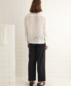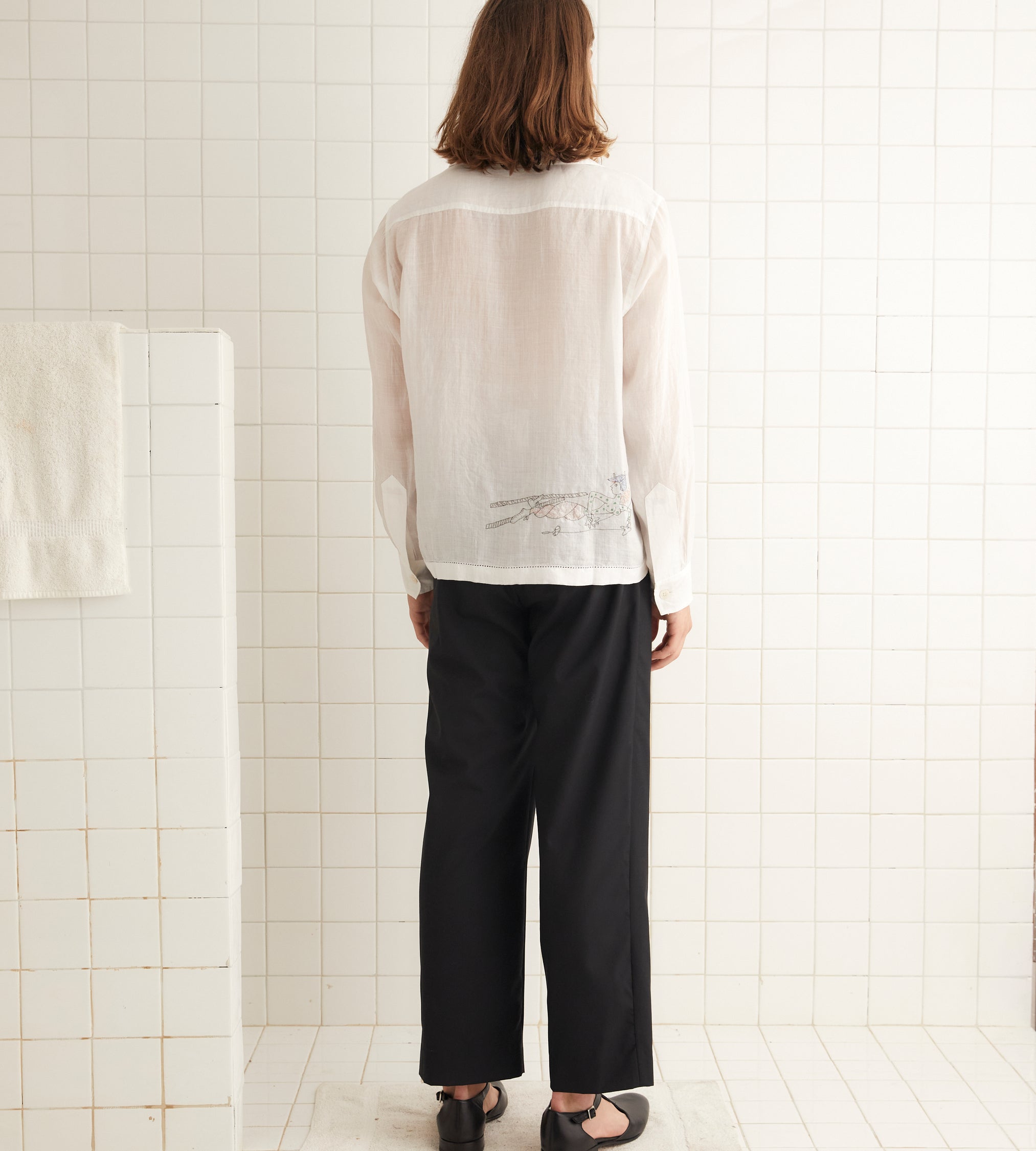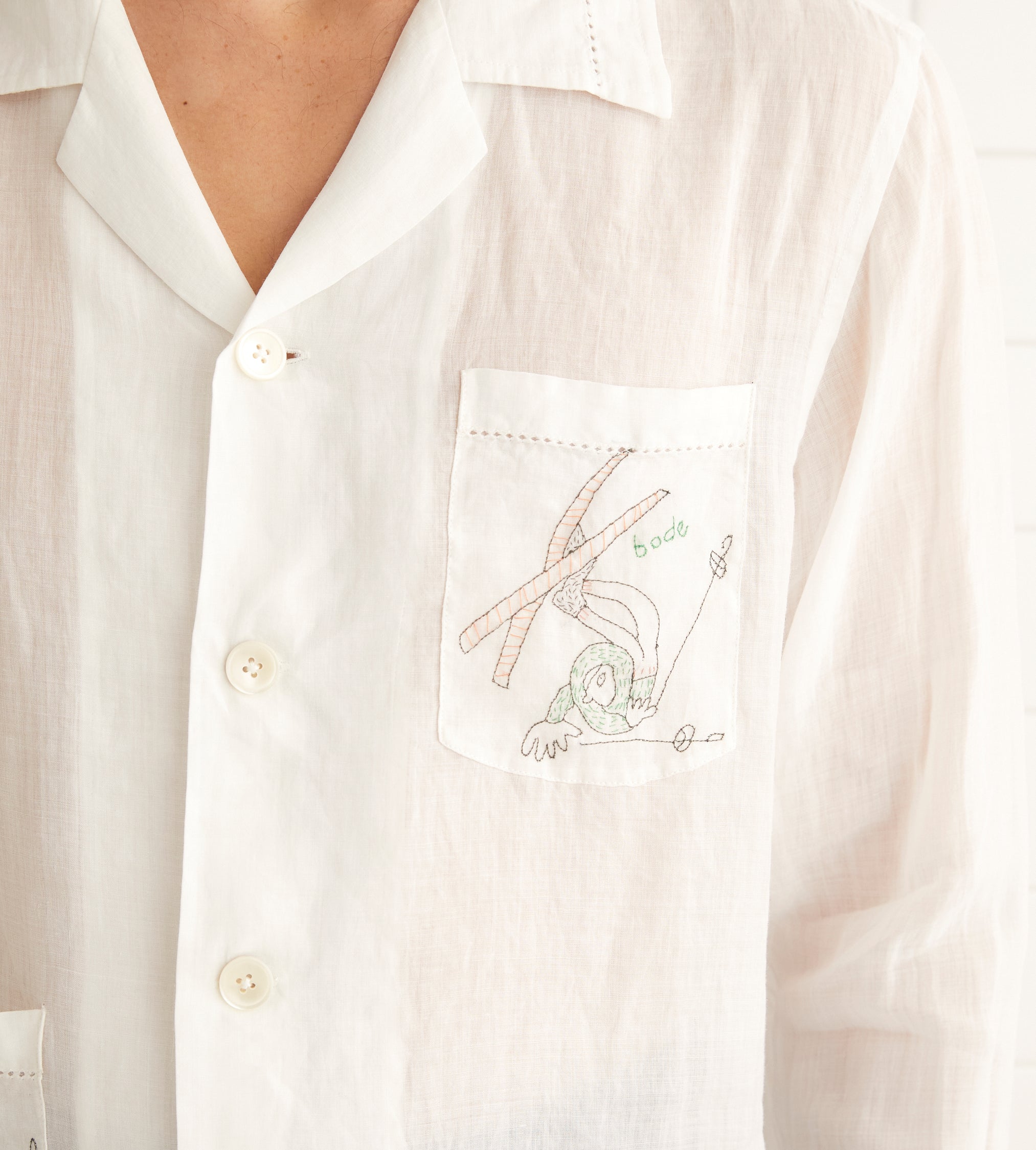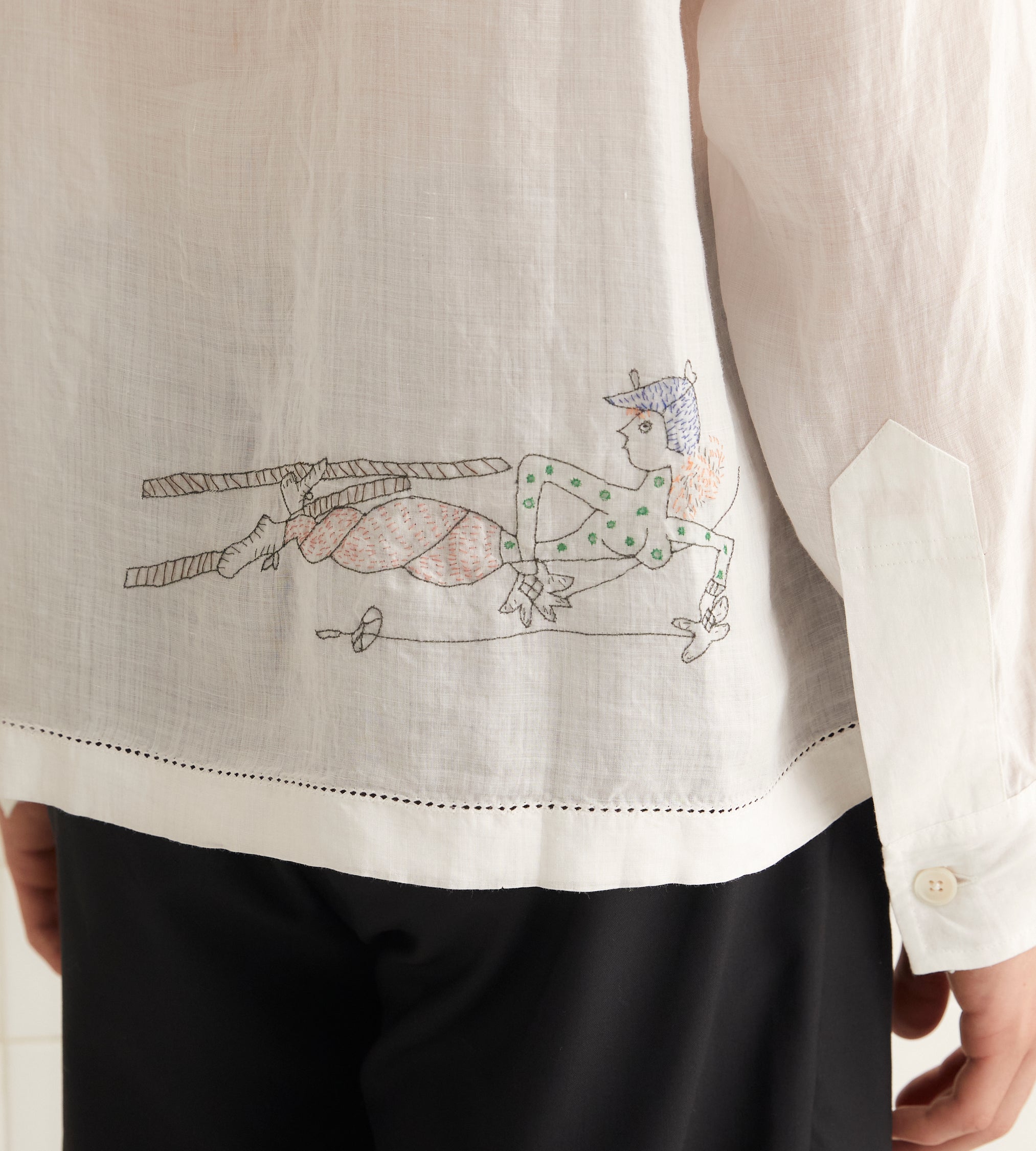This shirt is inspired by a scarf from the midcentury, which was printed with tumbling skiers. We reproduced the motifs in delicate, single-thread embroidery. The shirt is made of lightweight linen and has picot detaling along the hem.