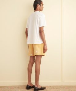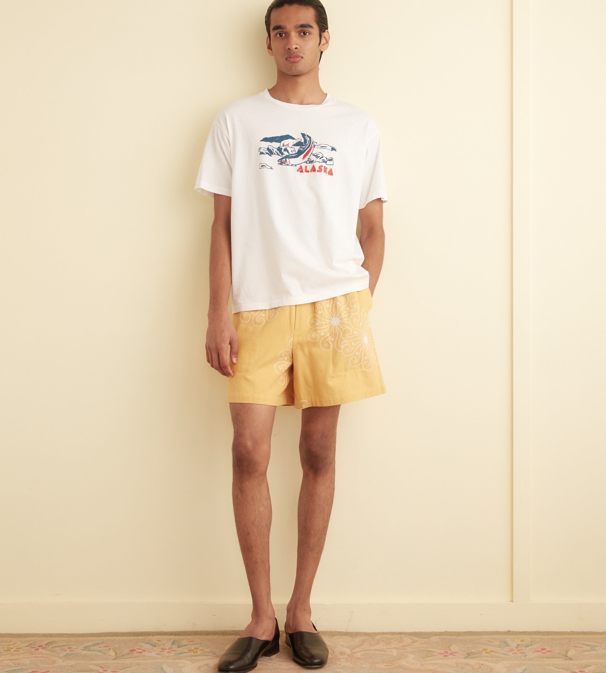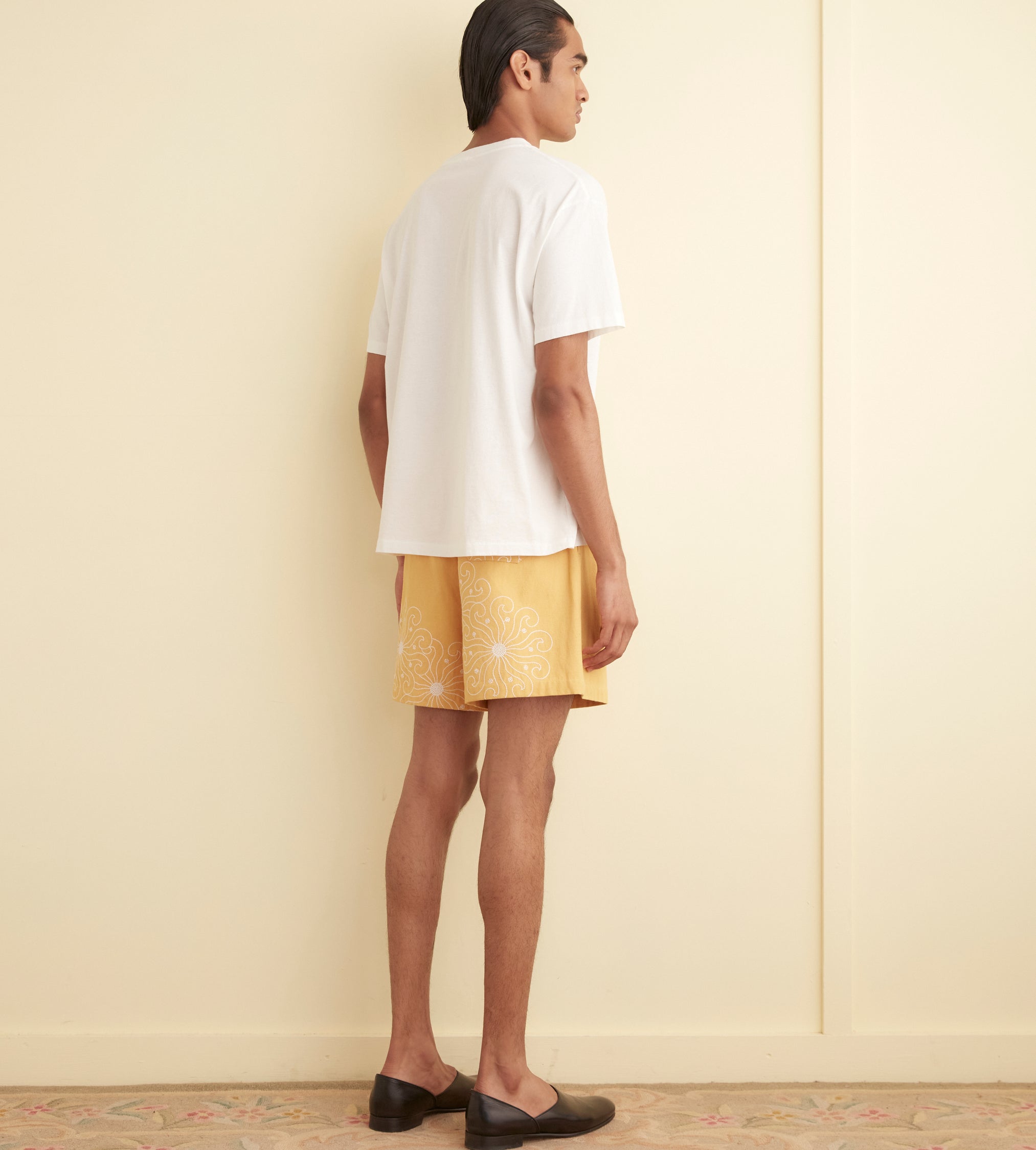 These shorts are inspired by an embroidered tablecloth from the 1950s-1960s. The sunburst pattern of the original has been replicated here with stem-stitched embroidery. They are cut to mimic the silhouette of traditional rugby shorts, with a short inseam and wide leg opening.