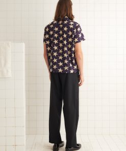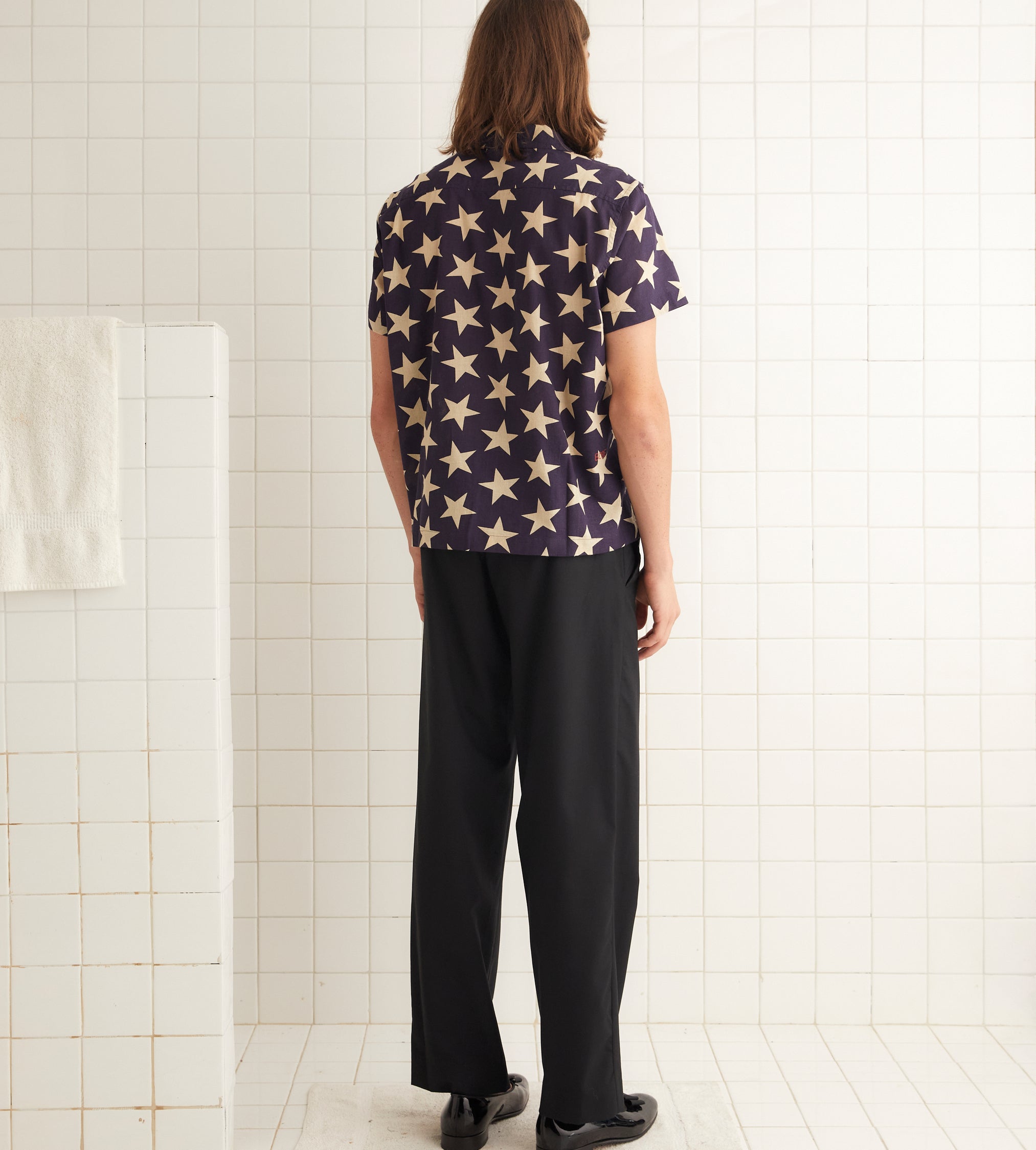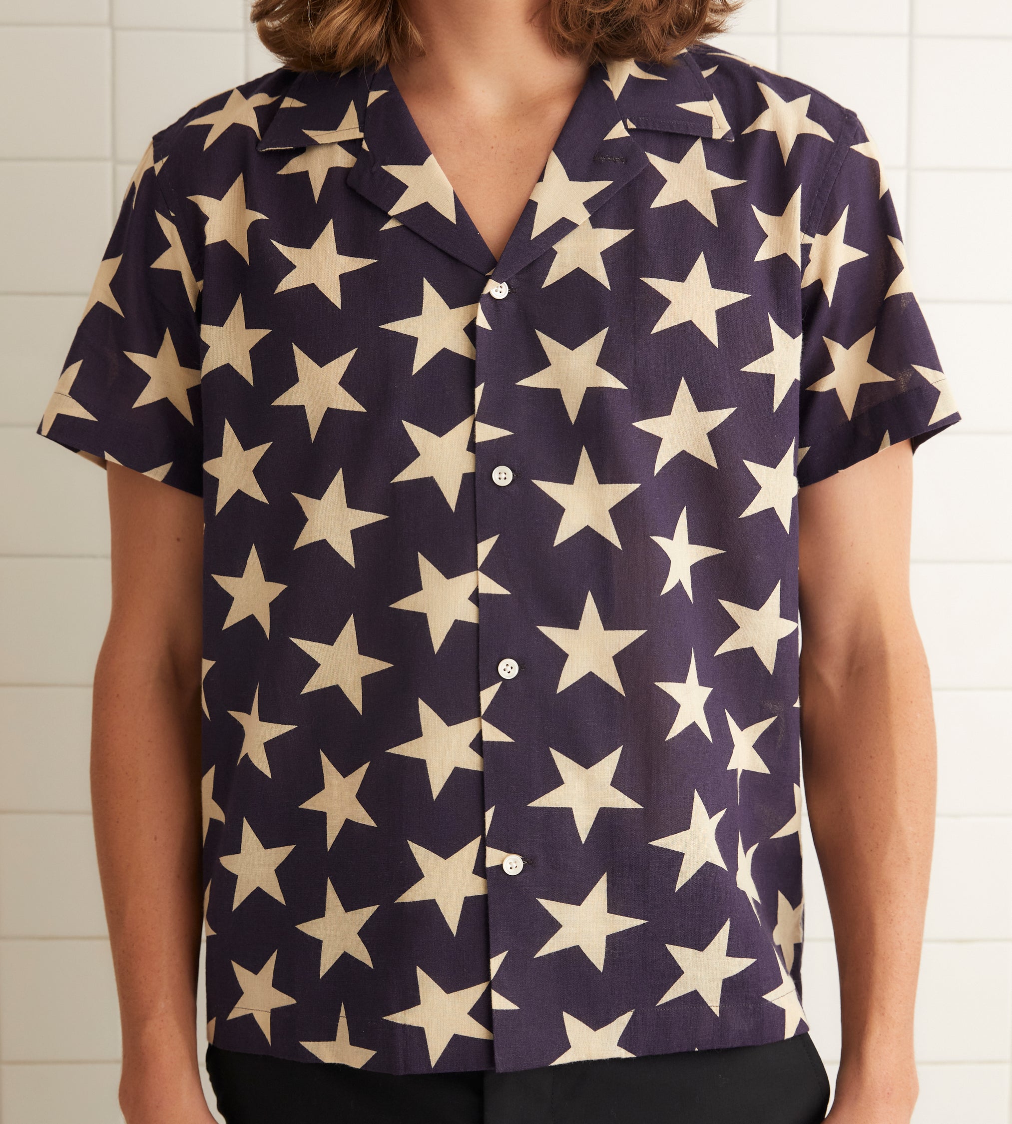 This shirt is inspired by star-patterned bunting from the 1930s. We reproduced the print for this style, which features an embroidered “Bode” on the back.