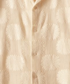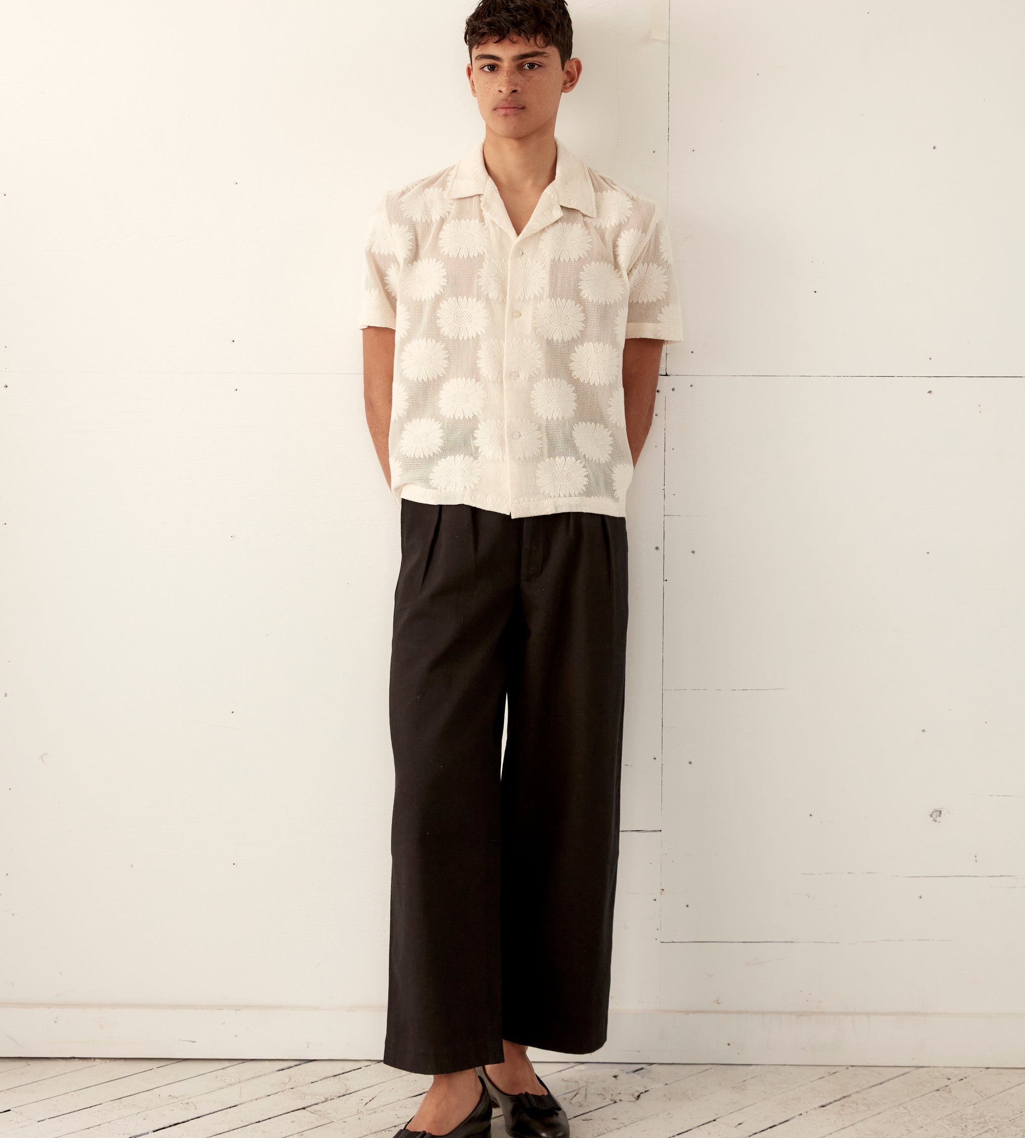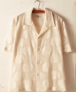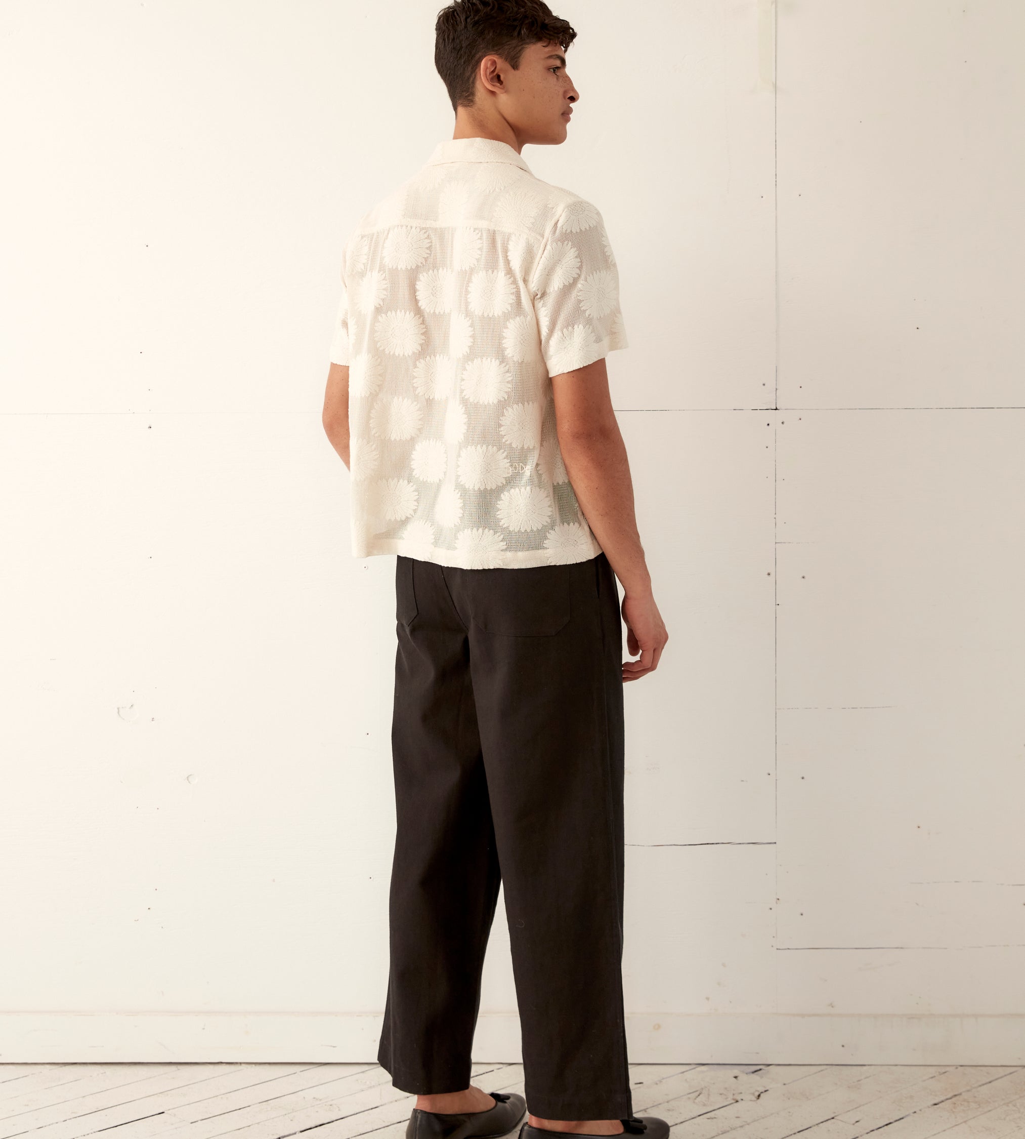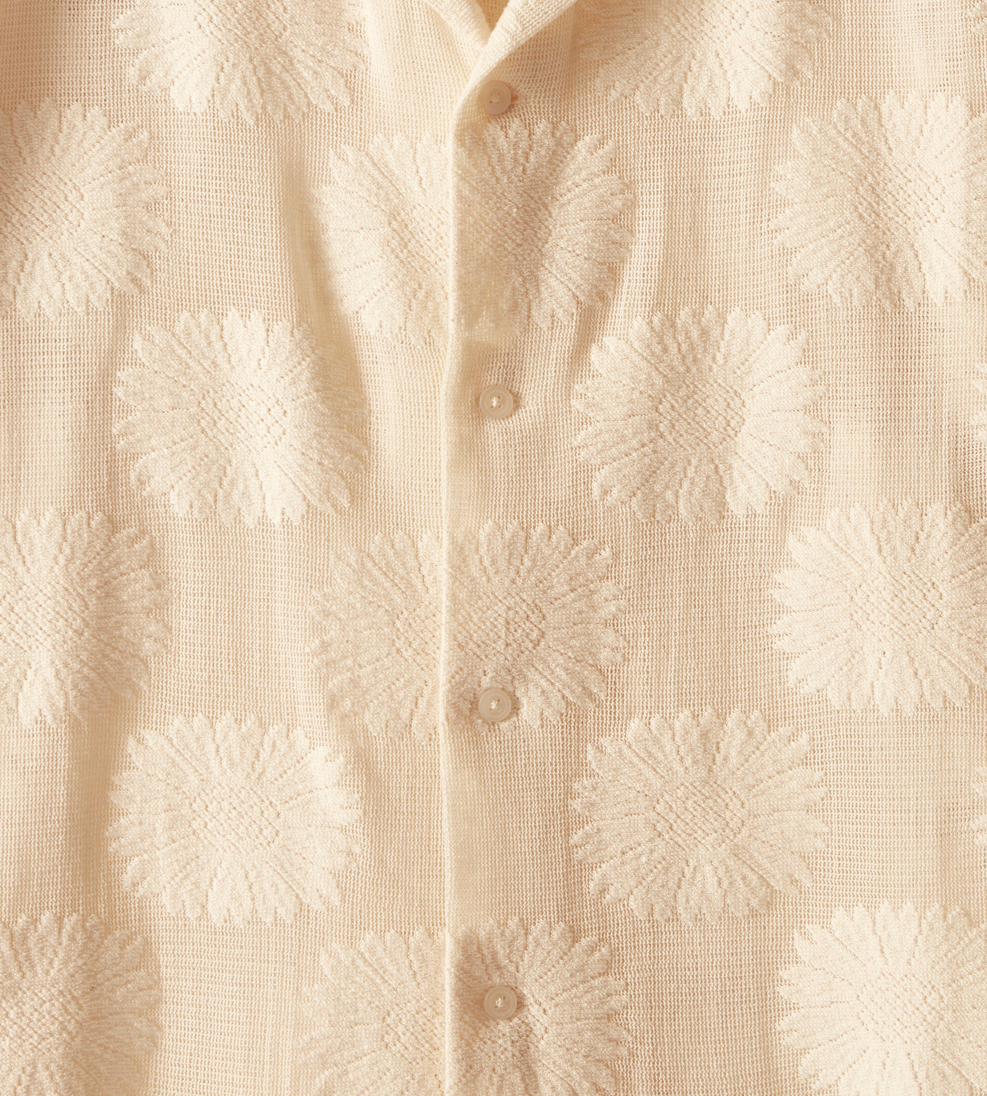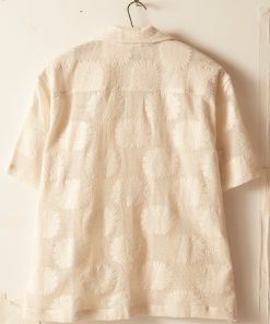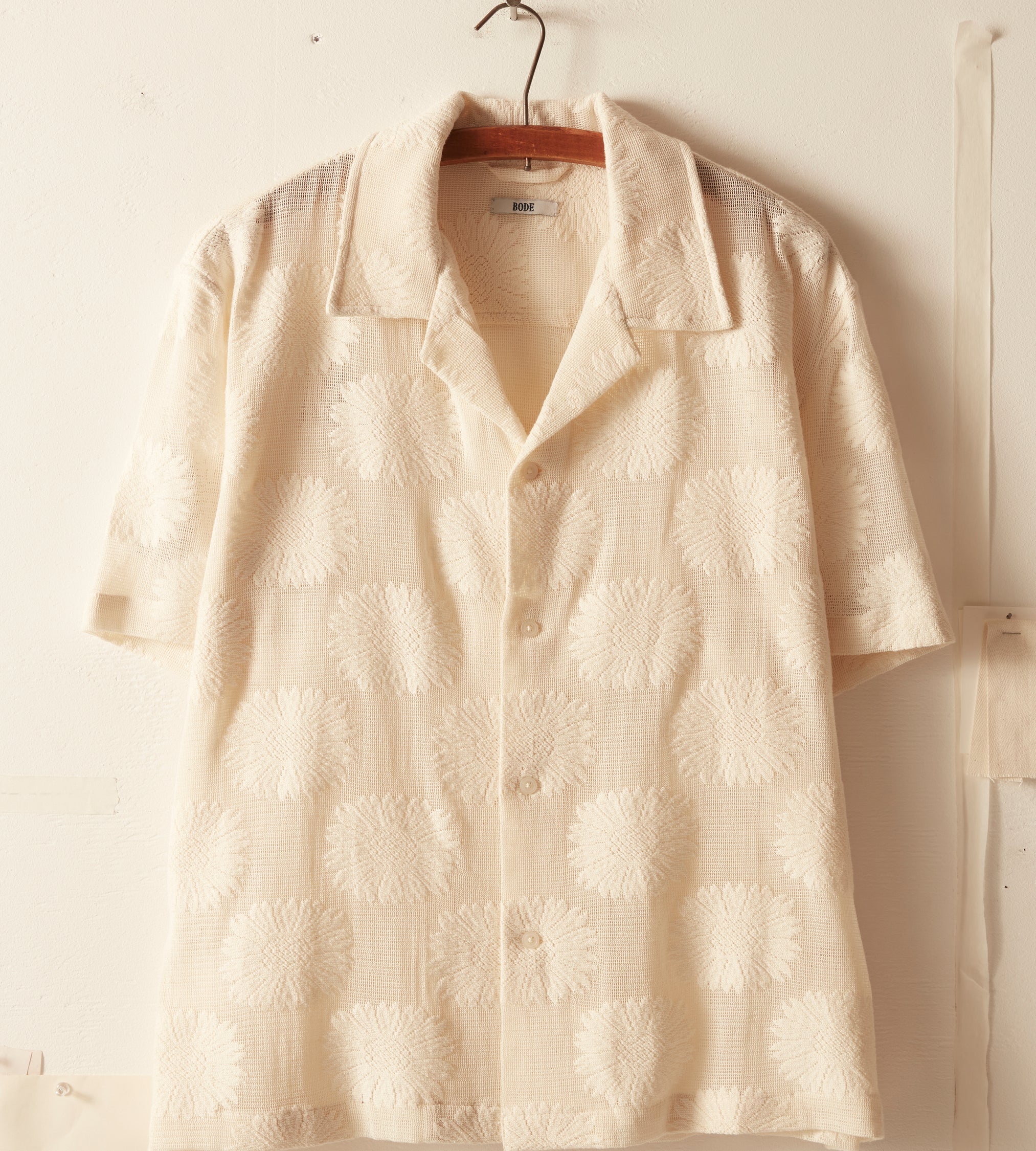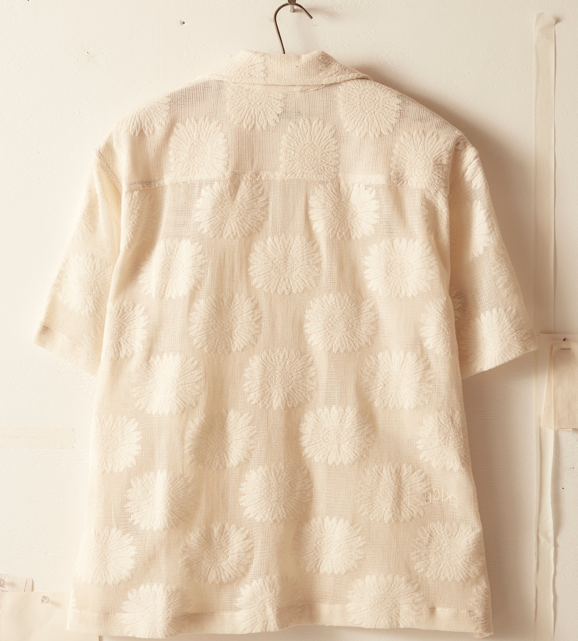 This shirt is inspired by a lace curtain from the 1930s-1950s and is part of Bode’s lace development program. Made of ecru lace and patterned with sunflowers, it has a camp collar and a straight hem. The shirt features a hand-embroidered Bode logo on the back.