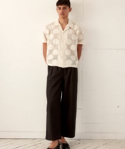 This shirt is inspired by a lace curtain from the 1930s-1950s and is part of Bode’s lace development program. Made of ecru lace and patterned with sunflowers, it has a camp collar and a straight hem. The shirt features a hand-embroidered Bode logo on the back.