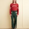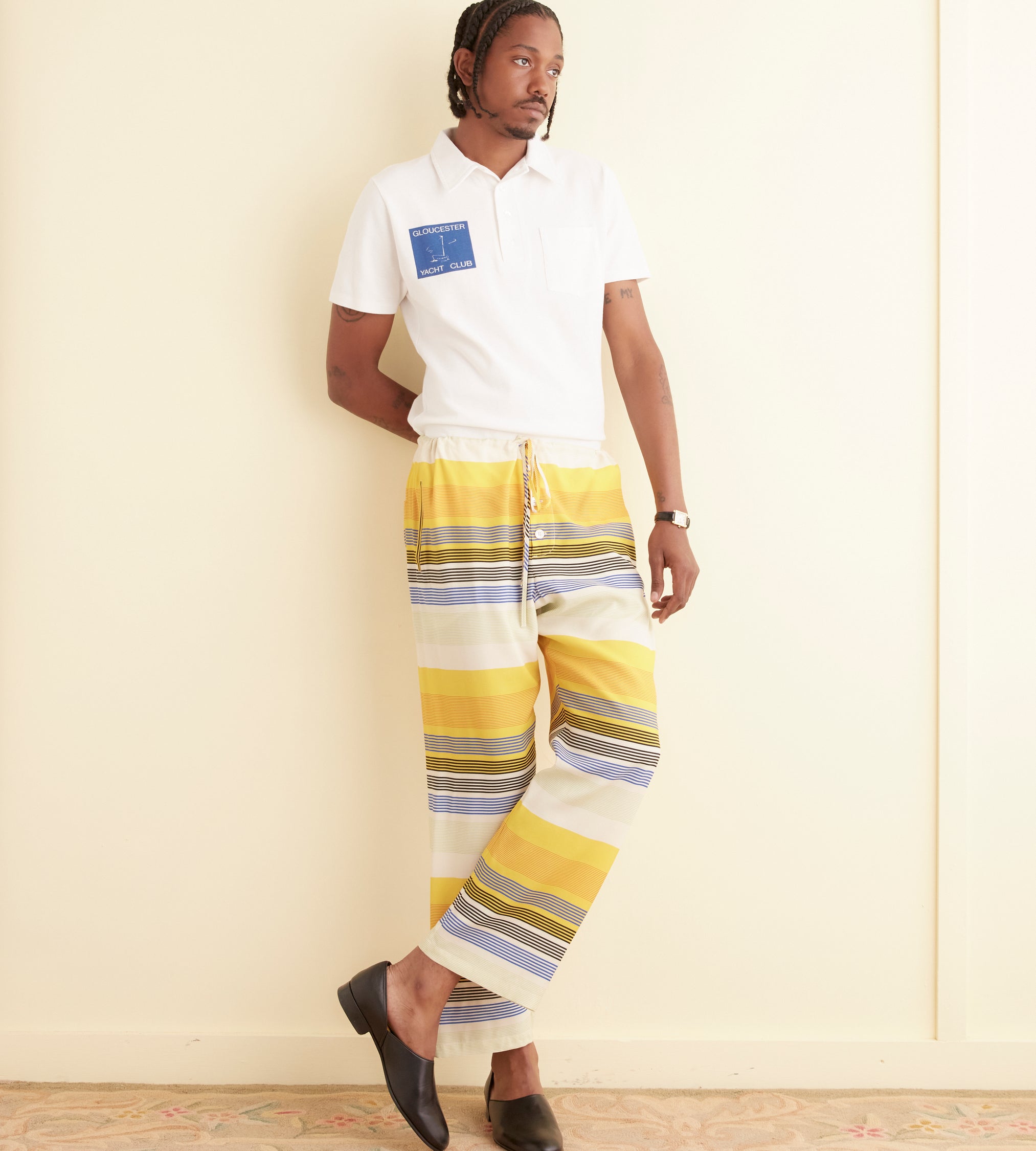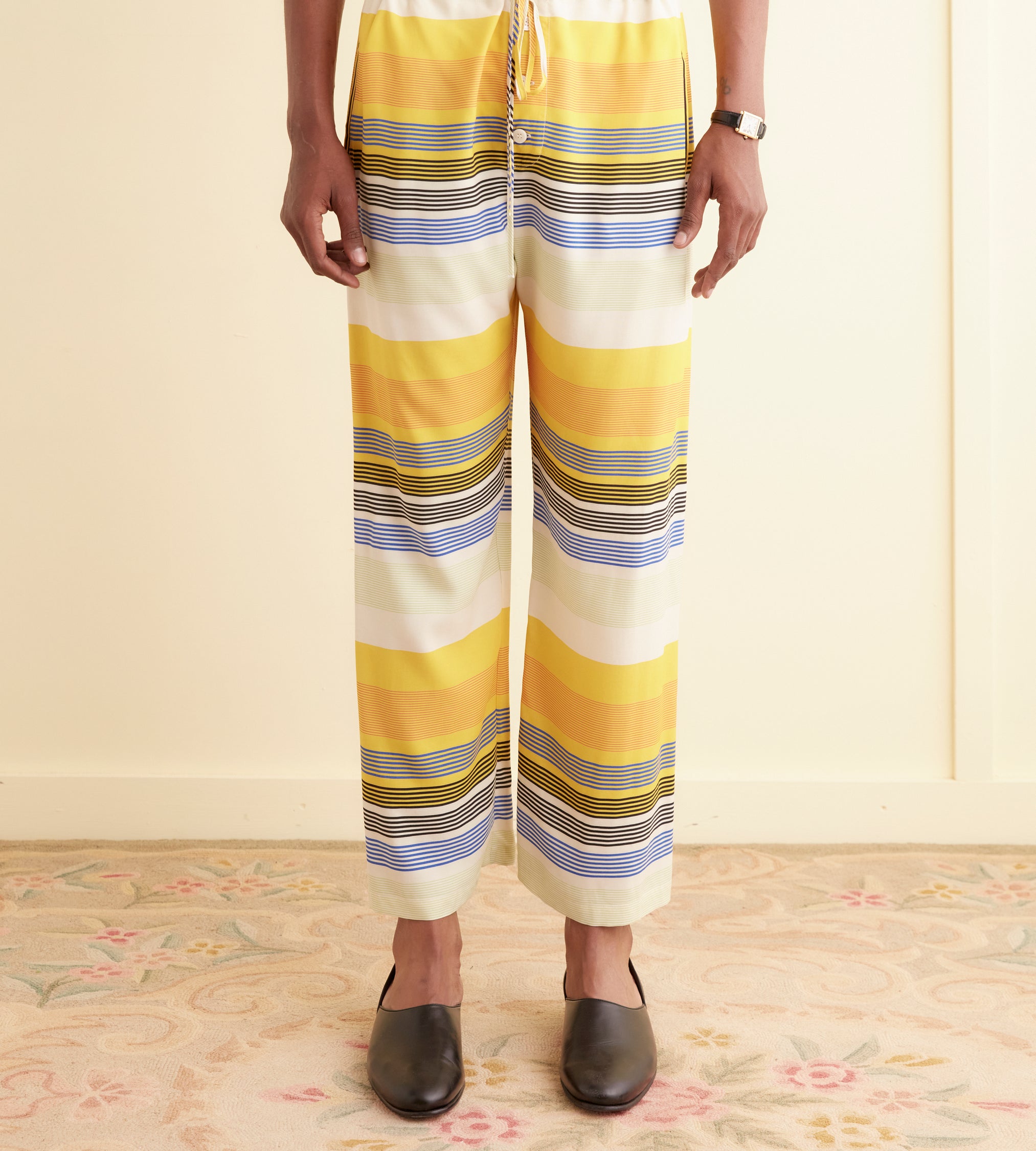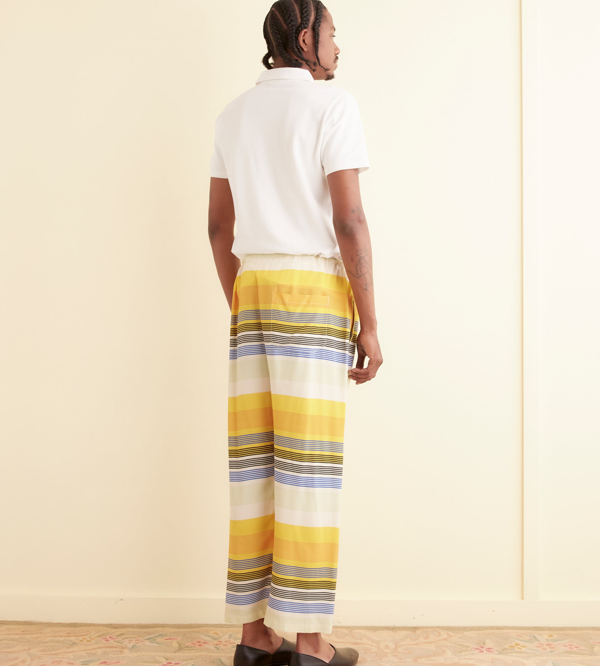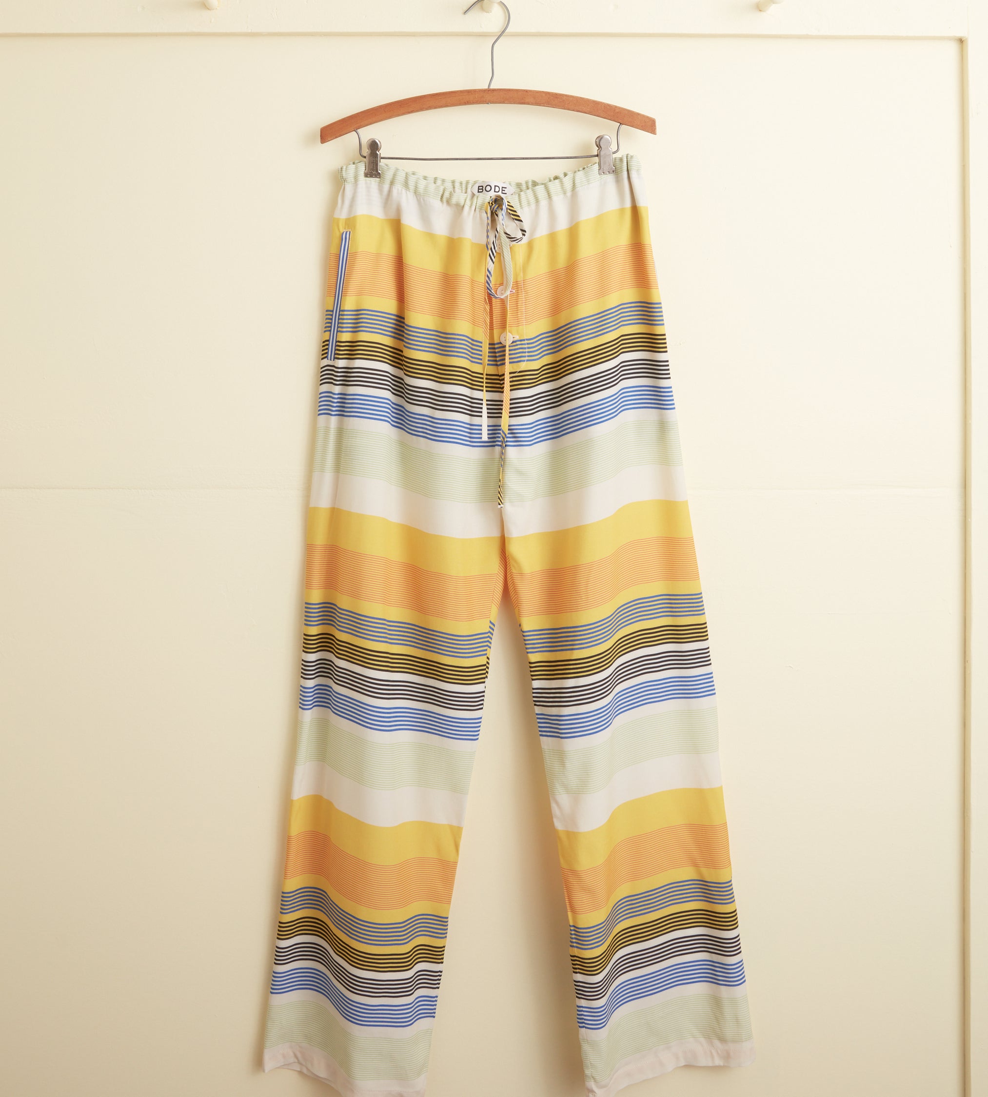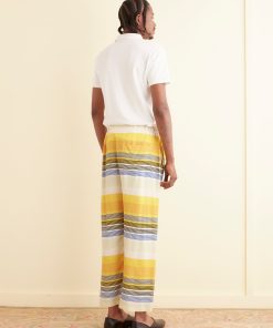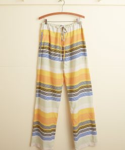 These pants are inspired by a shirt from the 1970s. We reproduced the blue, yellow, and white striped fabric for this style.