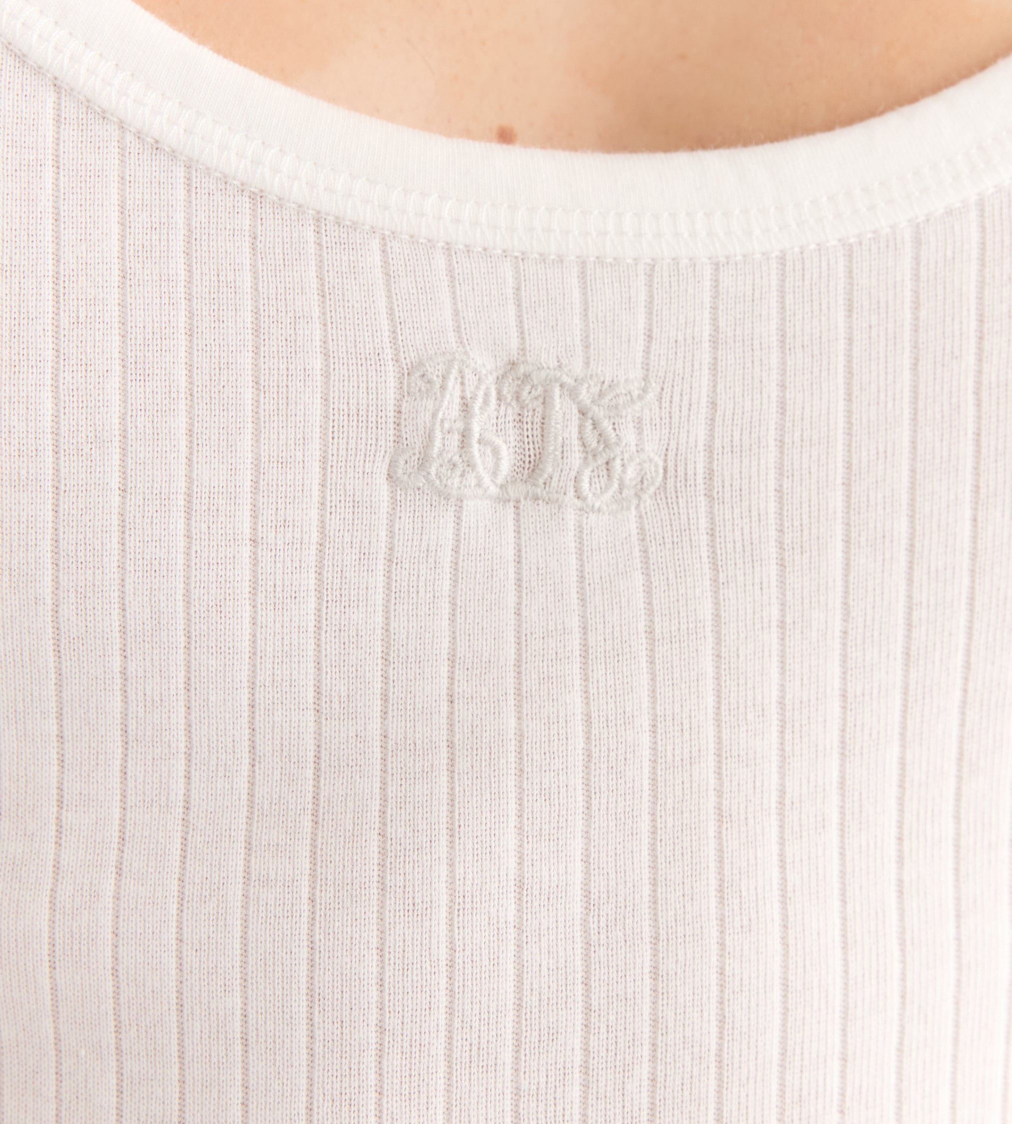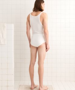 This suit is a historical reproduction of a union suit from 1941, a type of long underwear in which the top and the bottoms were united—hence the name “union” suit. This shorter version, comprising an attached undershirt and briefs, was made to be worn during the summer months.