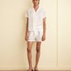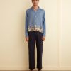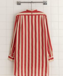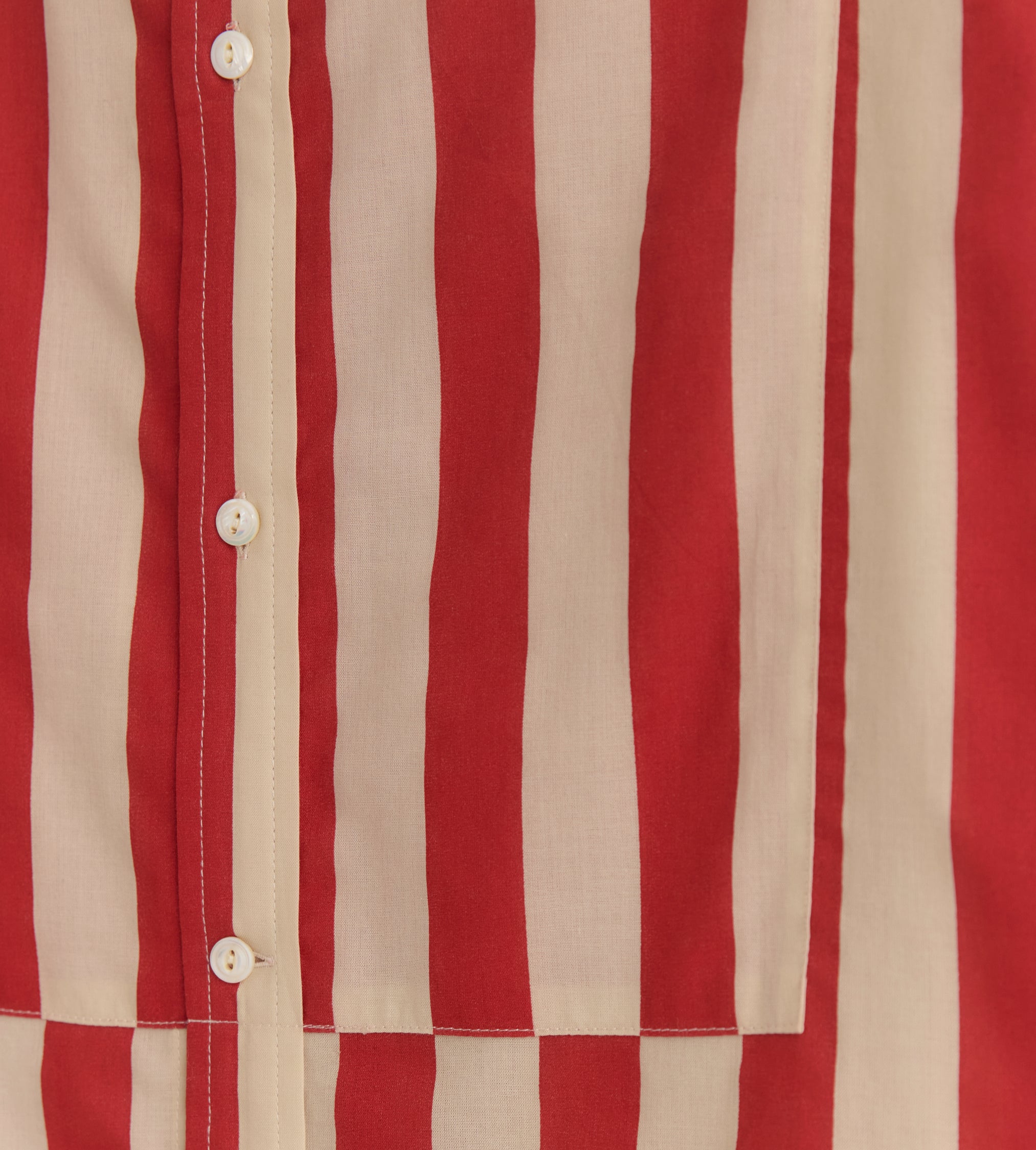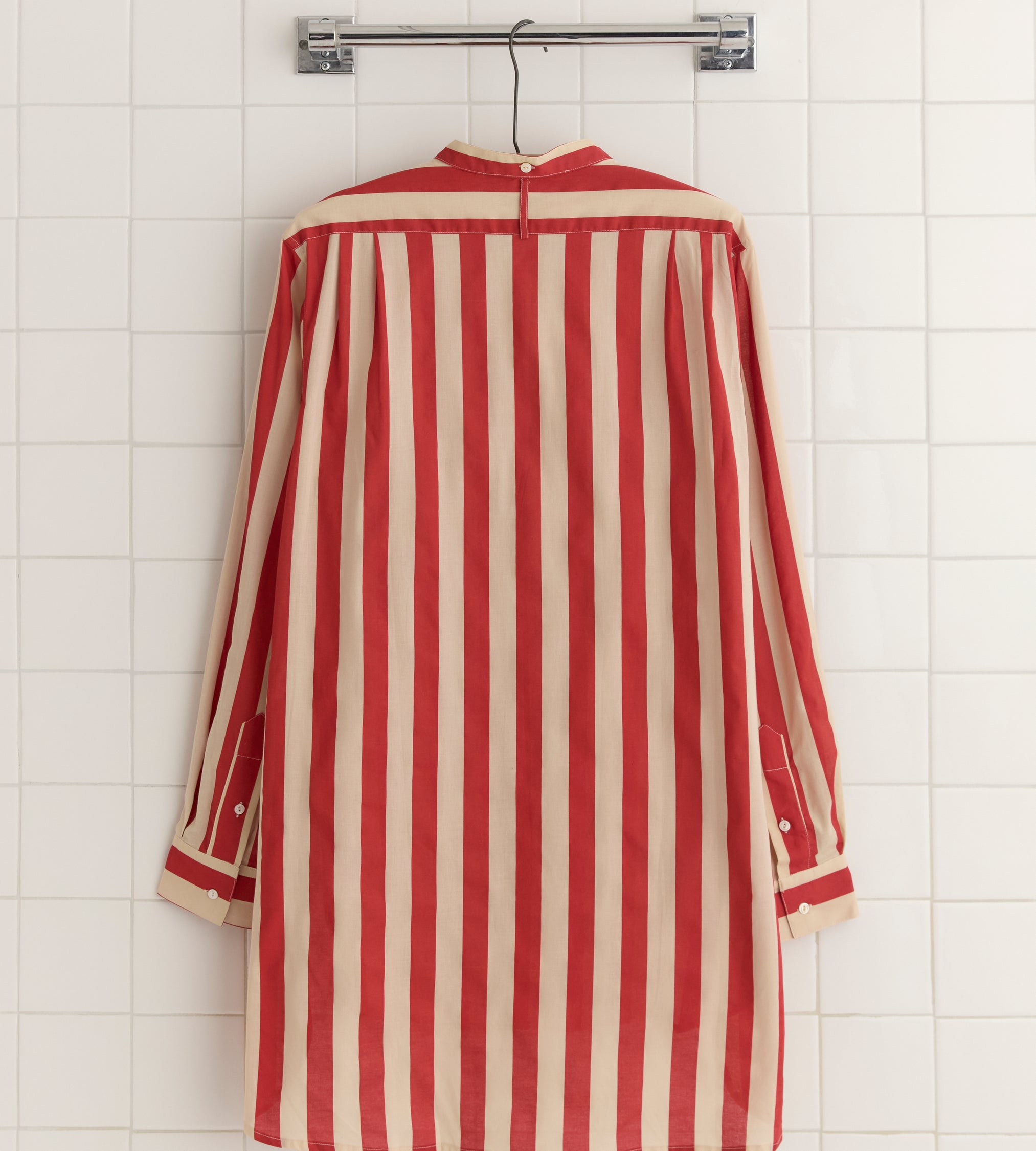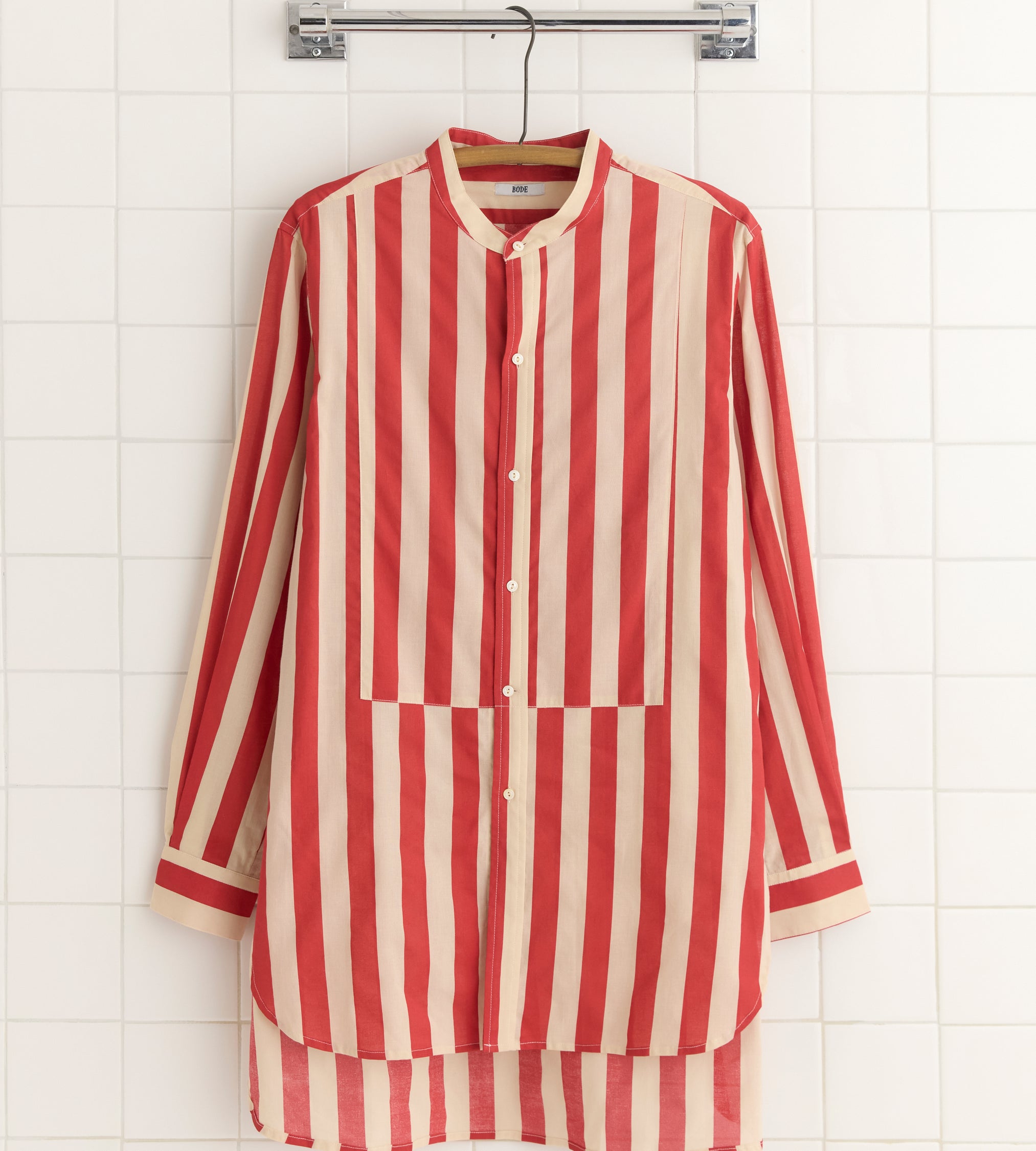 This long-sleeved shirt is inspired by a 1940s curtain valance. The original stripe has been replicated by rotary printing, a process which pushes ink through the fabric rather than stamping it on one side. The pearl buttons used on this piece were sourced from a now-defunct factory in Iowa which had been making buttons for over 120 years. The shirt features a bib front and a band collar.