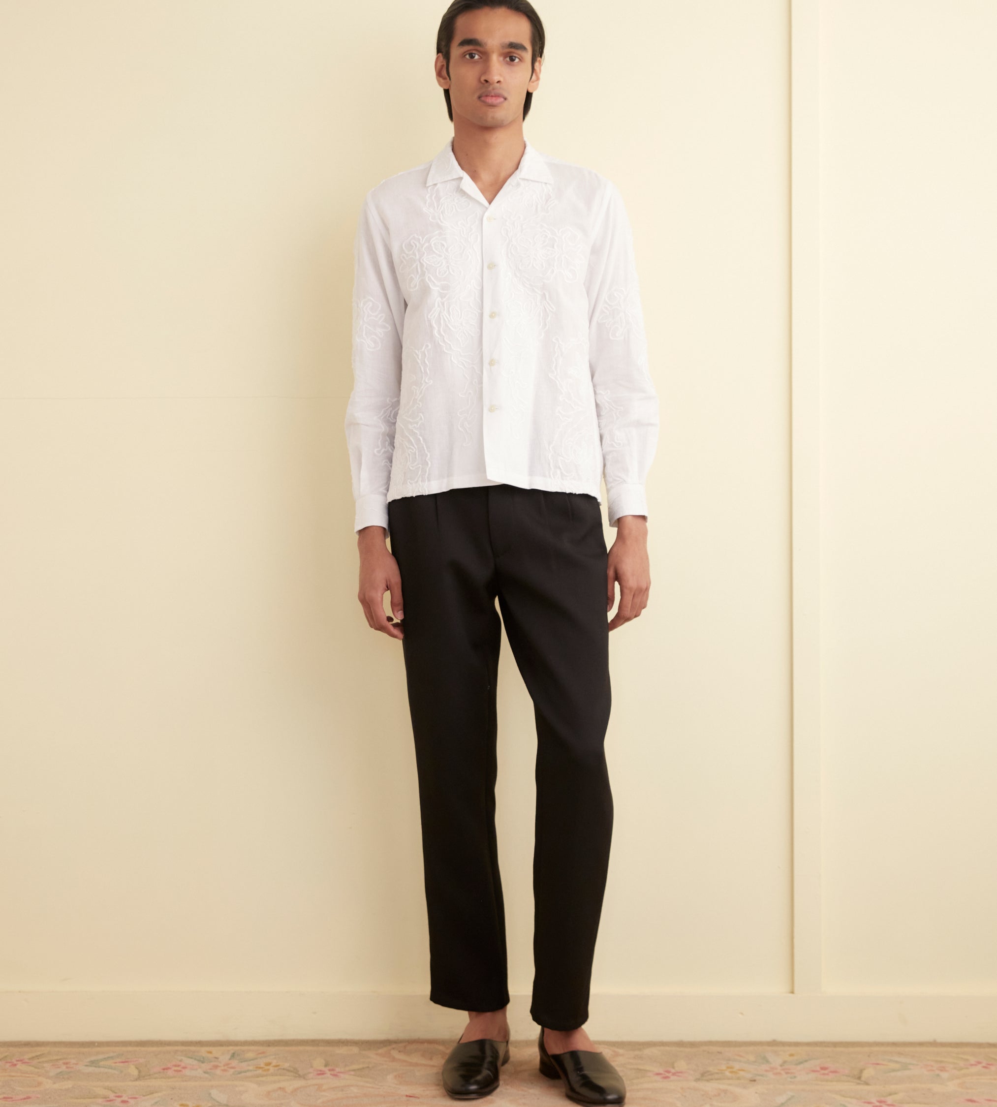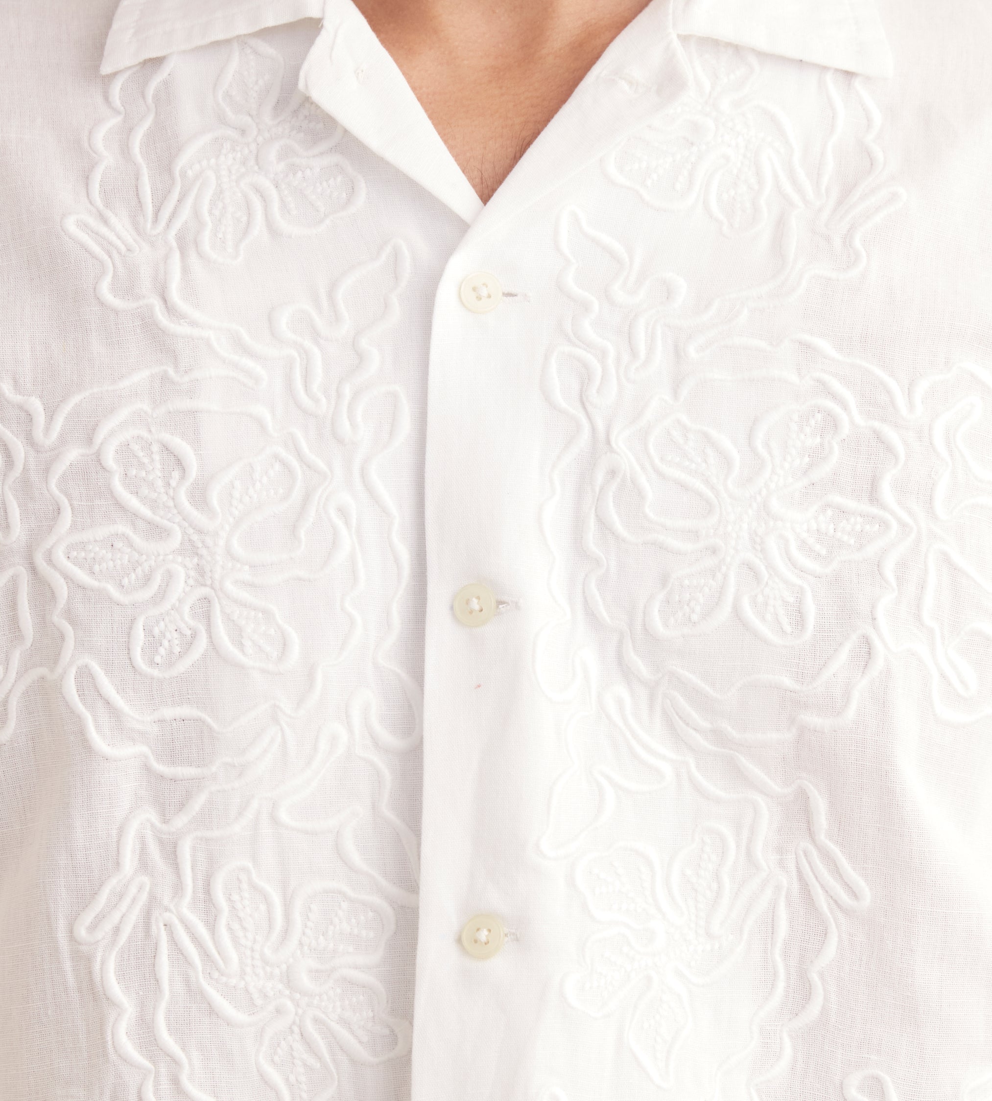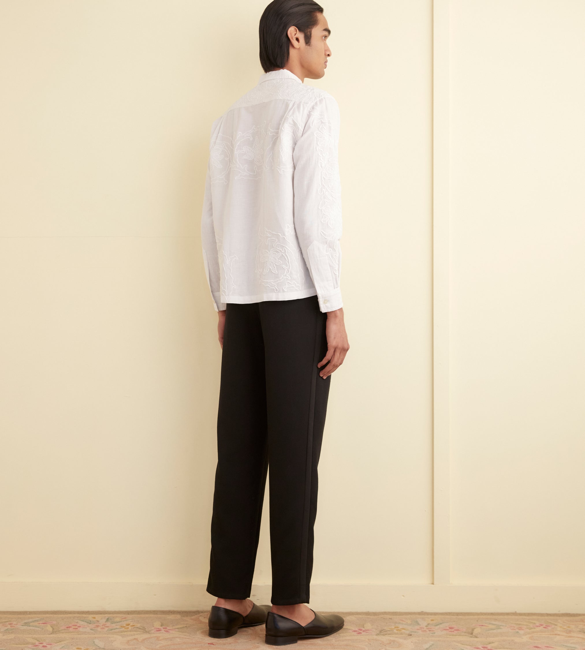 This shirt is inspired by an embroidered tablecloth from the 19th century. The original piece featured tonal satin-stitched embroidery in a winding floral pattern, which we have replicated here.