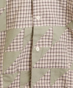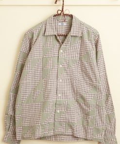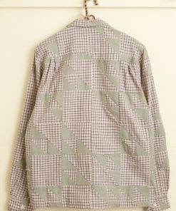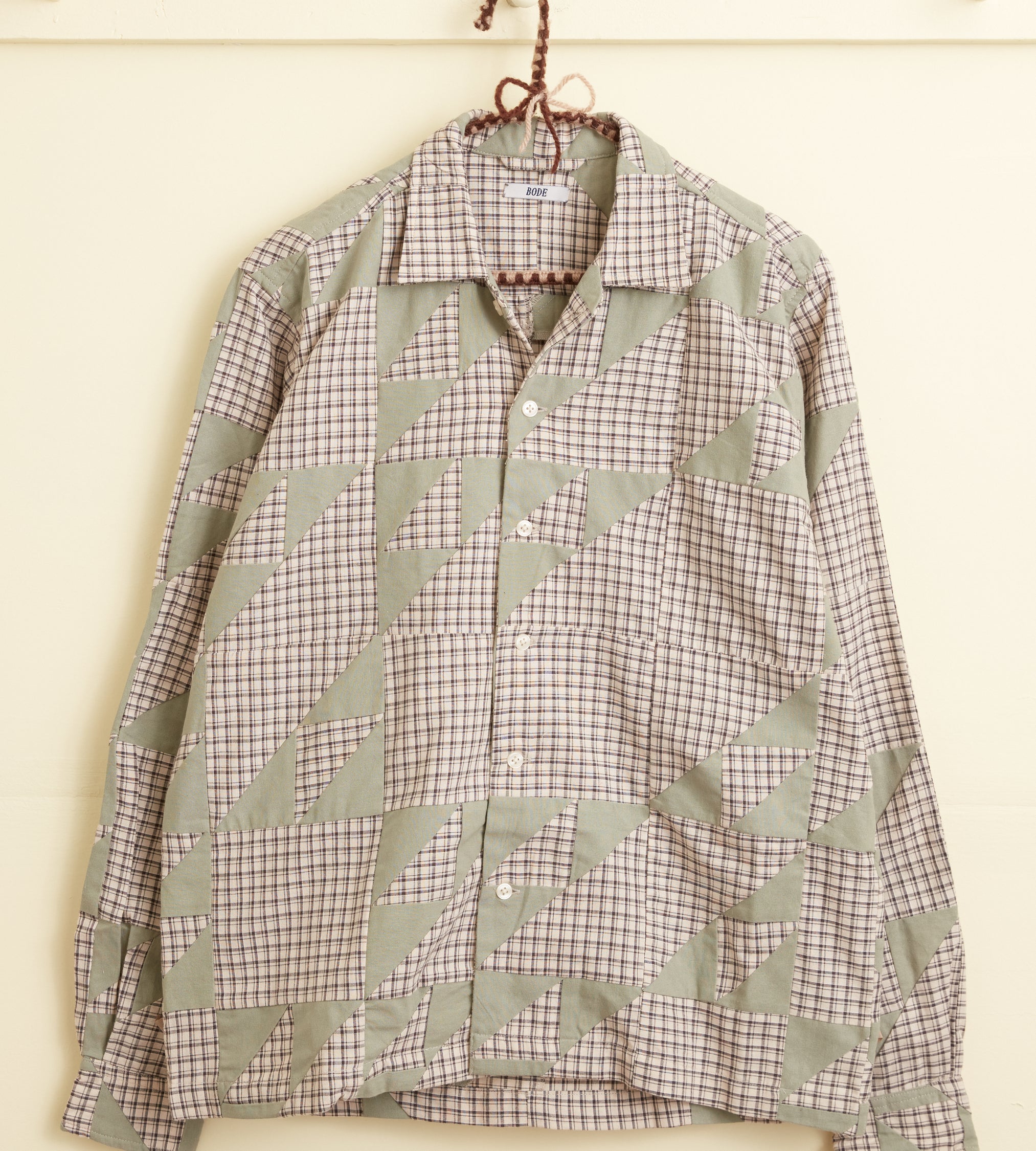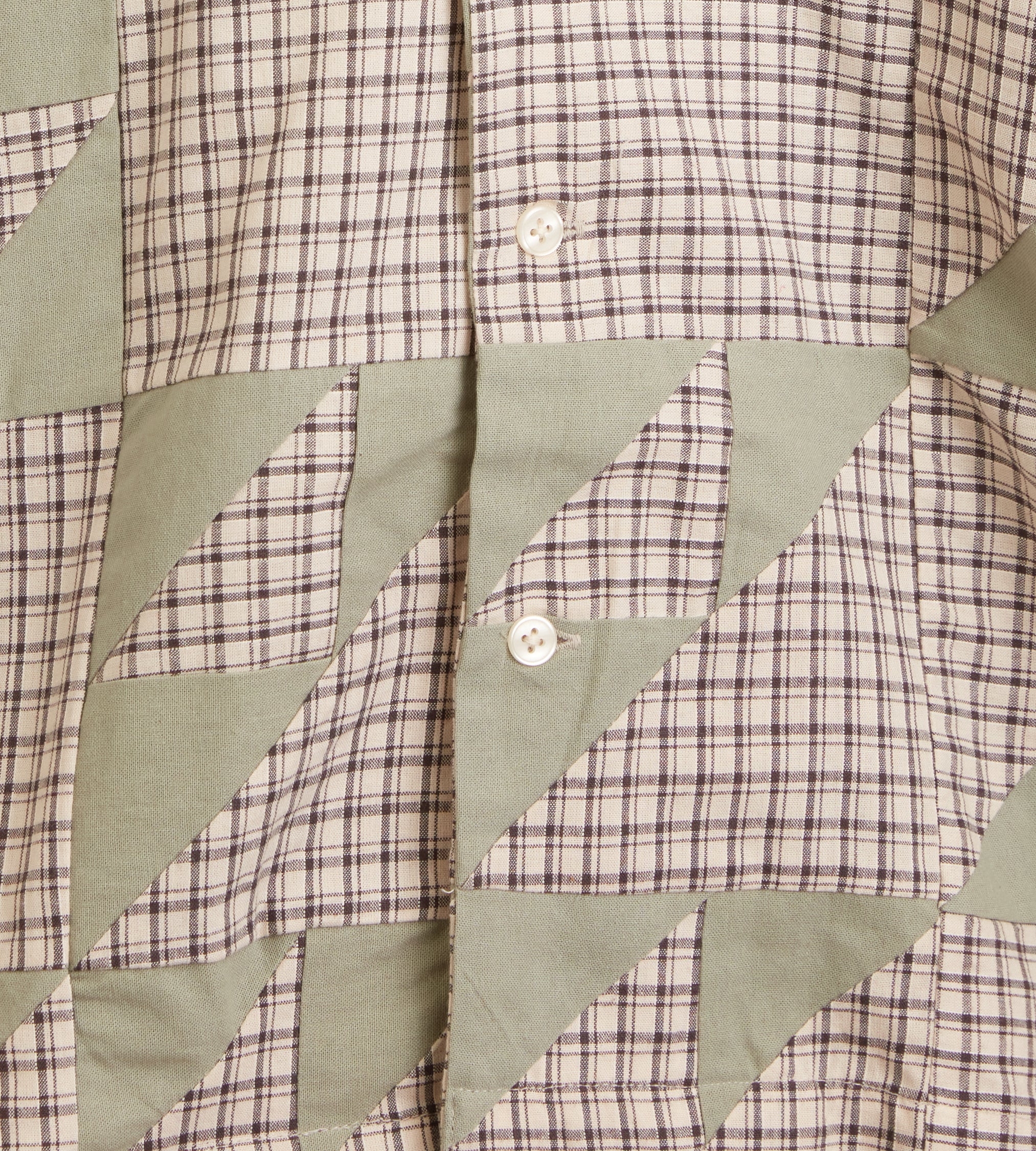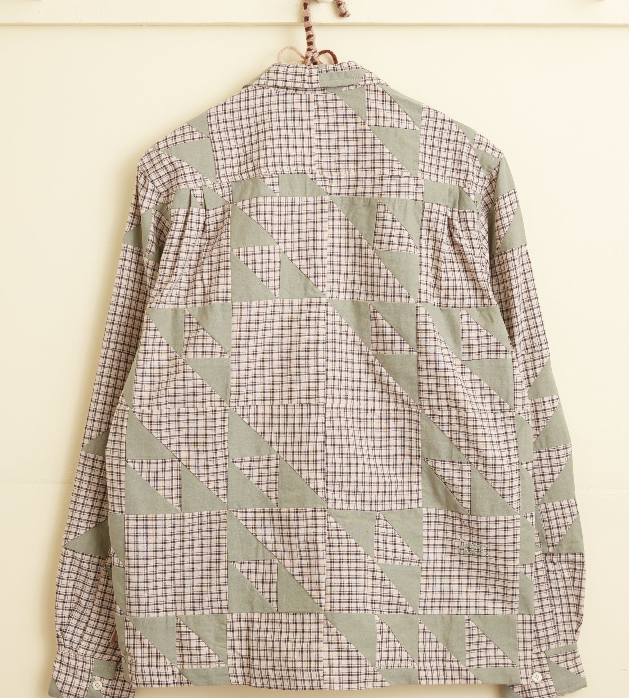 This shirt is inspired by an antique quilt, circa 1840s-1860s. The Wandering Lover quilt block, with its pattern of sawtooth triangles, is attributed to New Jersey Quakers from the period around the American Civil War.