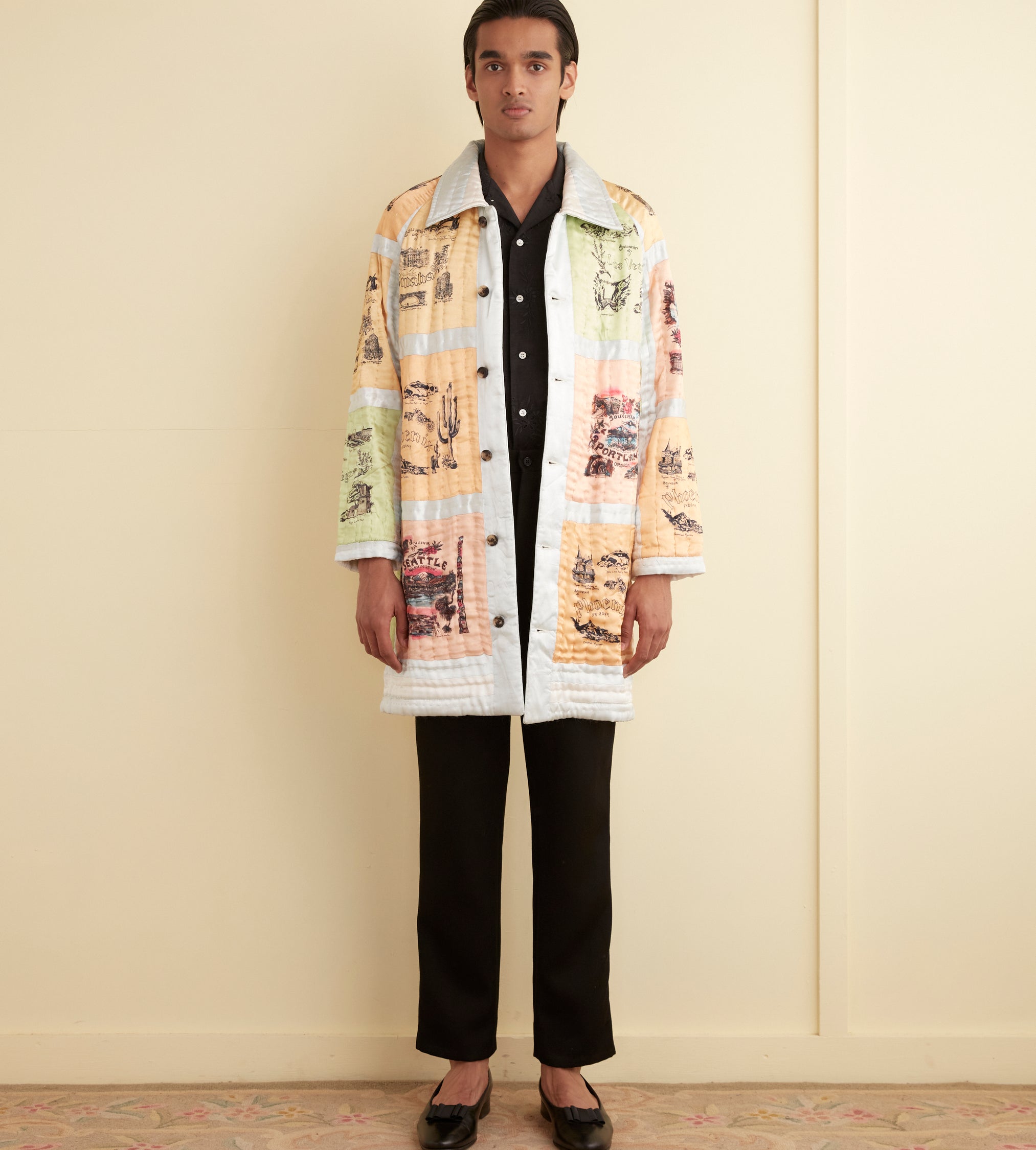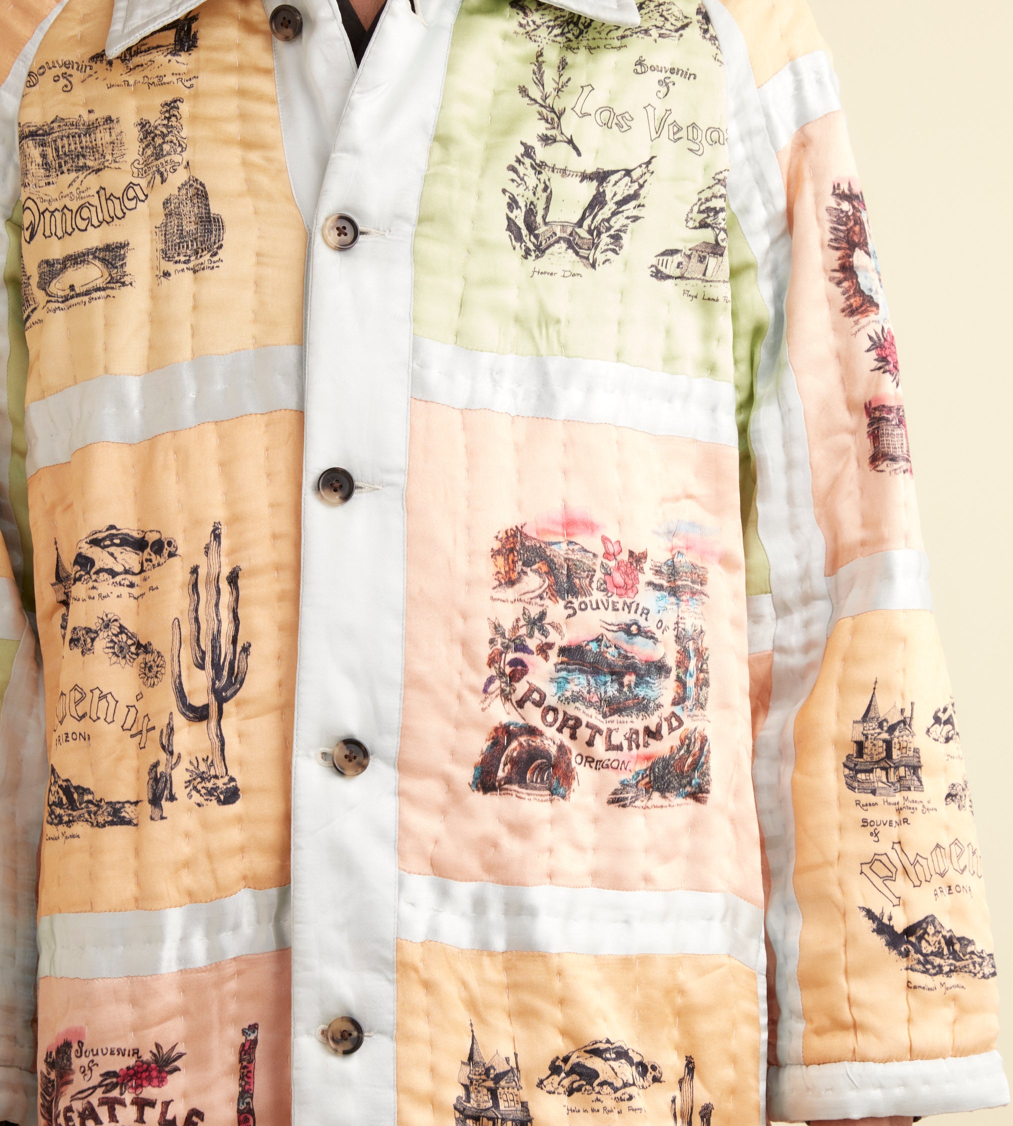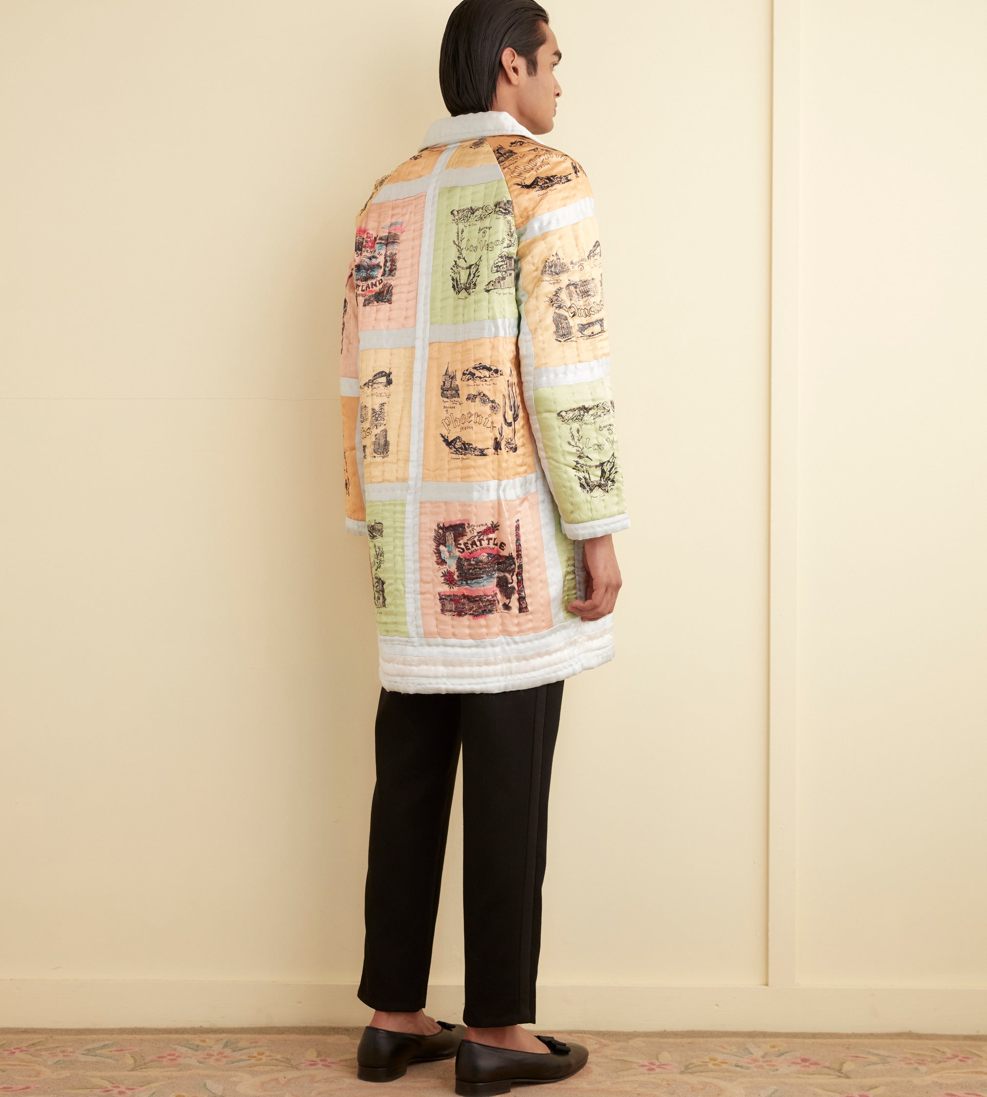 This coat is inspired by a souvenir quilt from the midcentury. We reproduced the original quilt, with its prints from different U.S. cities, for this jacket.