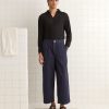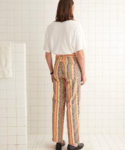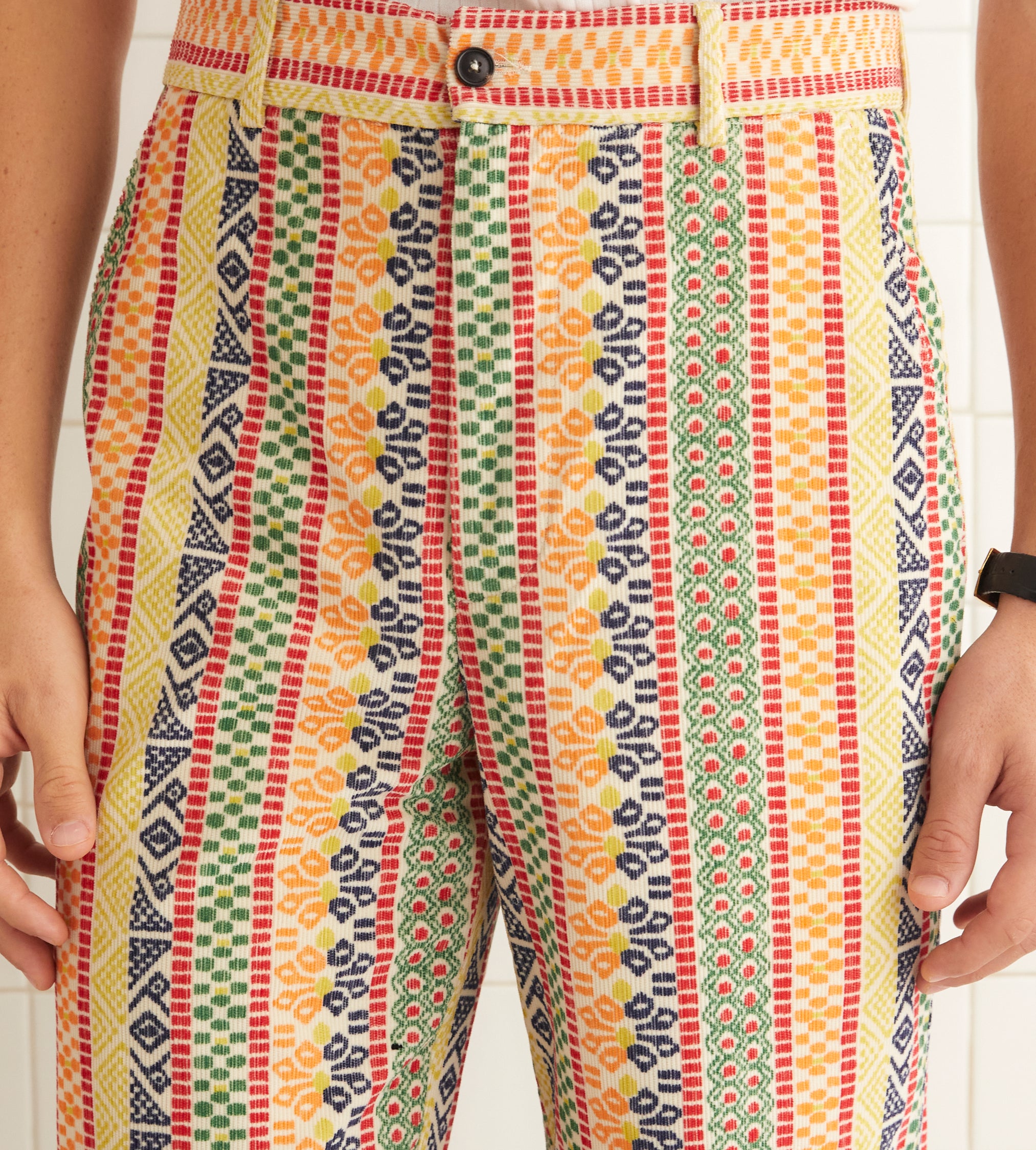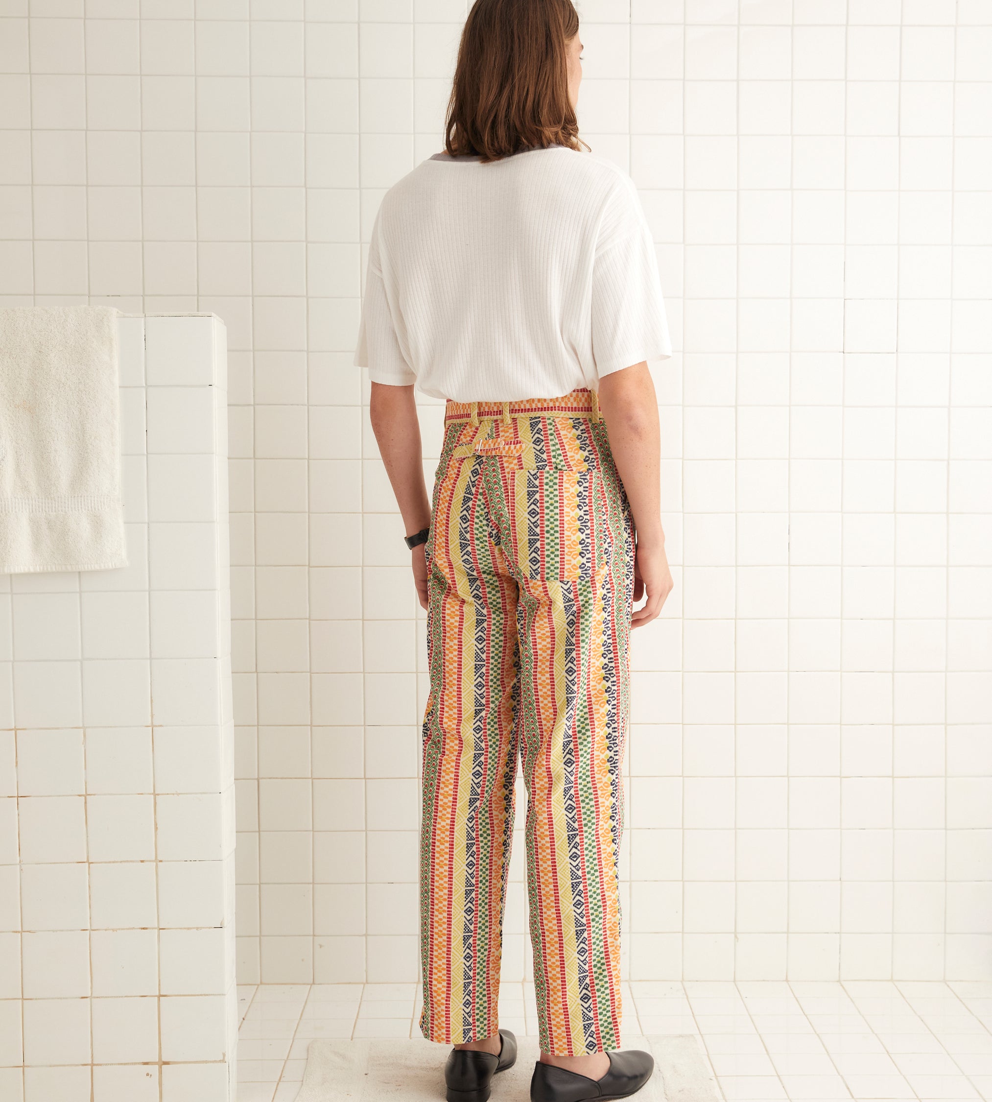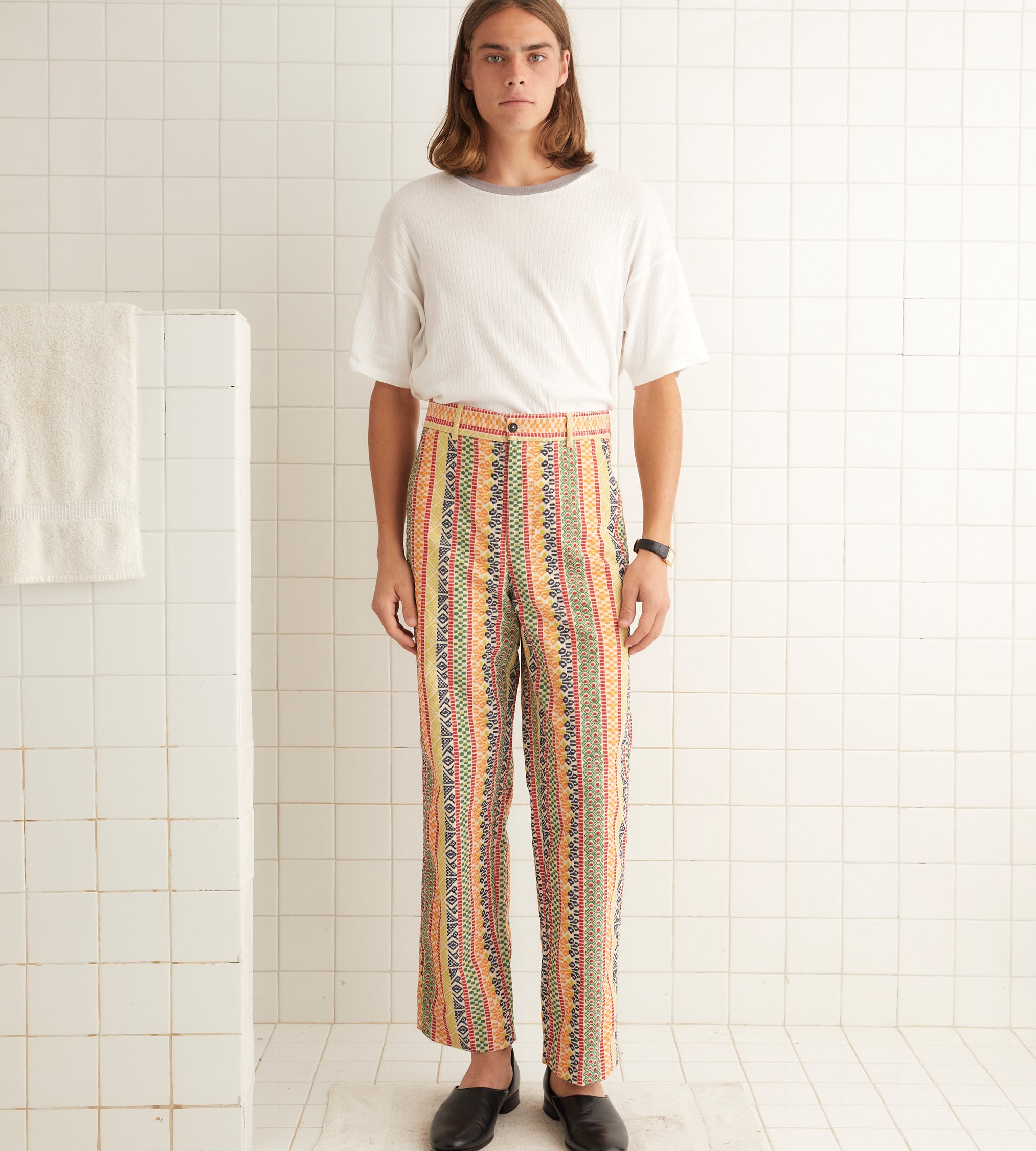 These trousers are made from fabric reproduced from a 1970s jacket. They are made from thin-wale corduroy printed with geometric-patterned stripes and cut with a high rise and a straight leg.
