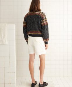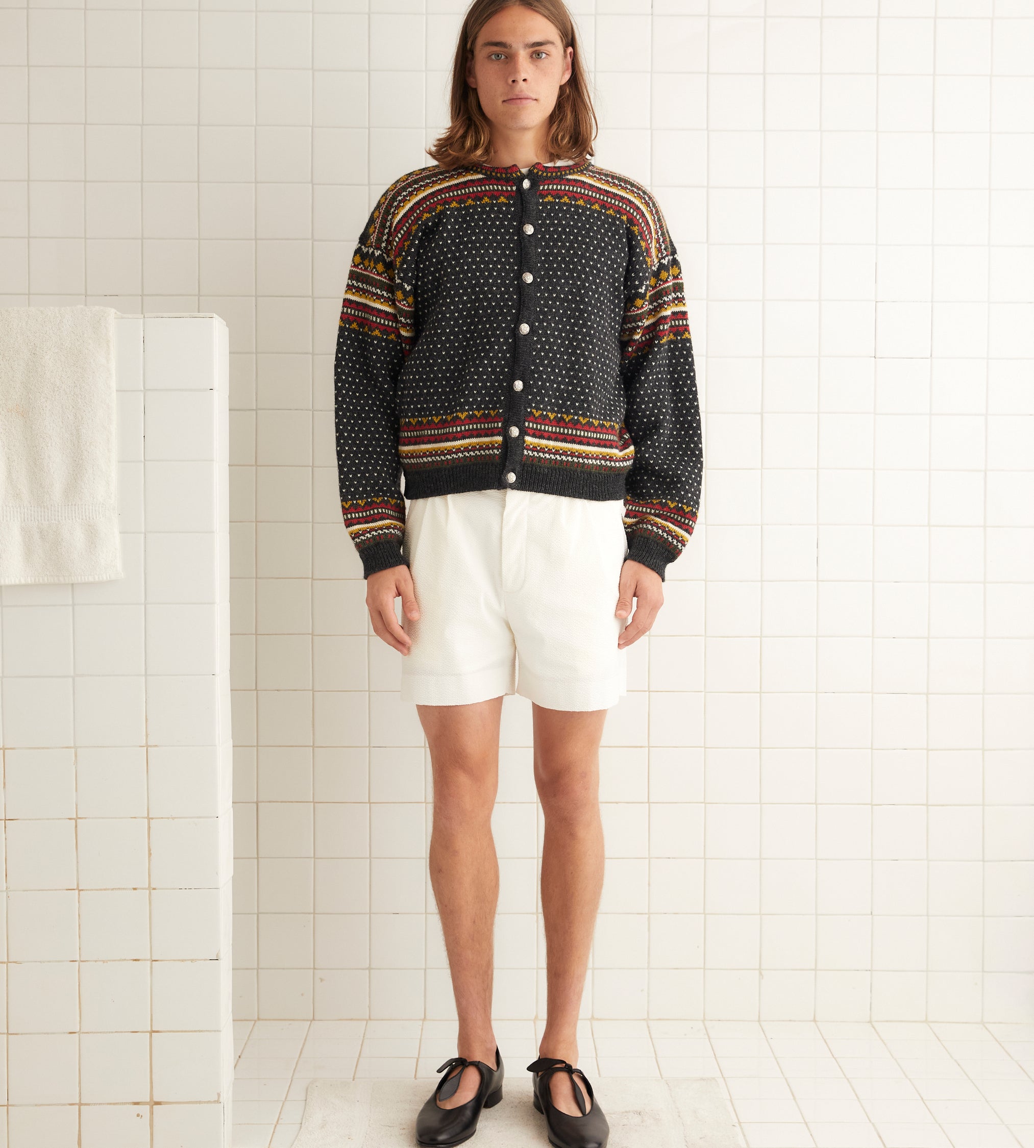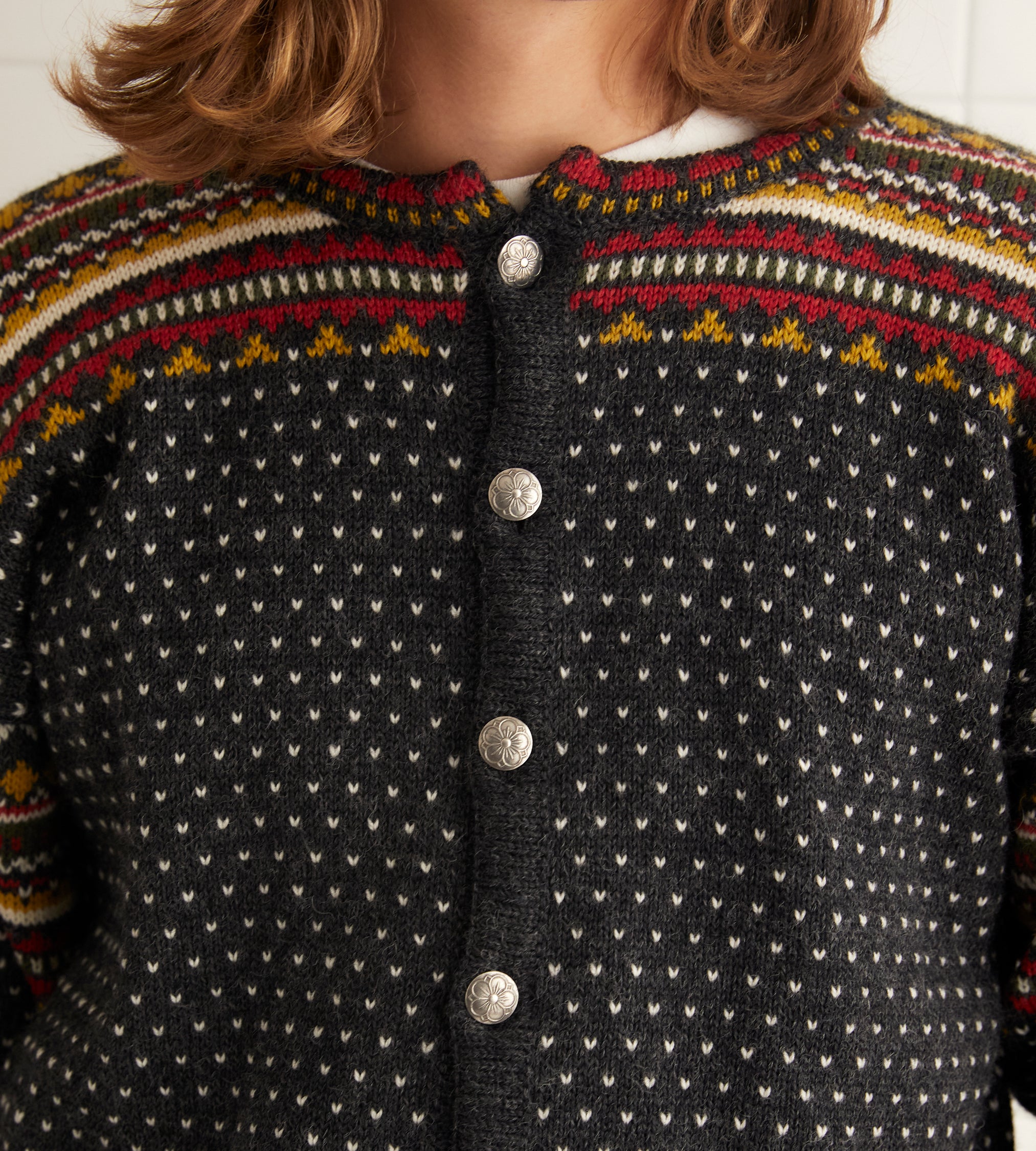 This cardigan is a historical reproduction of a Norwegian sweater from the 1950s-1960s. It is trimmed with decorative metal buttons and features orange, red, and white geometric stripes around the collar, hem, and cuffs.